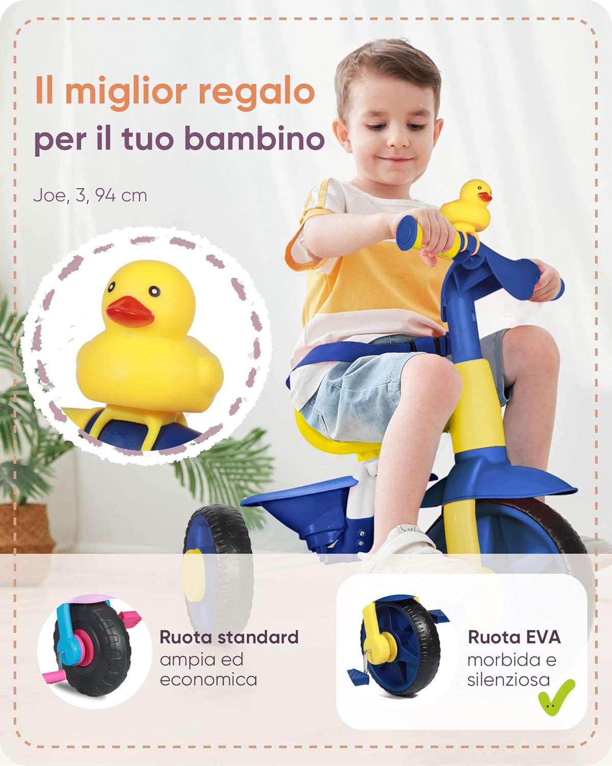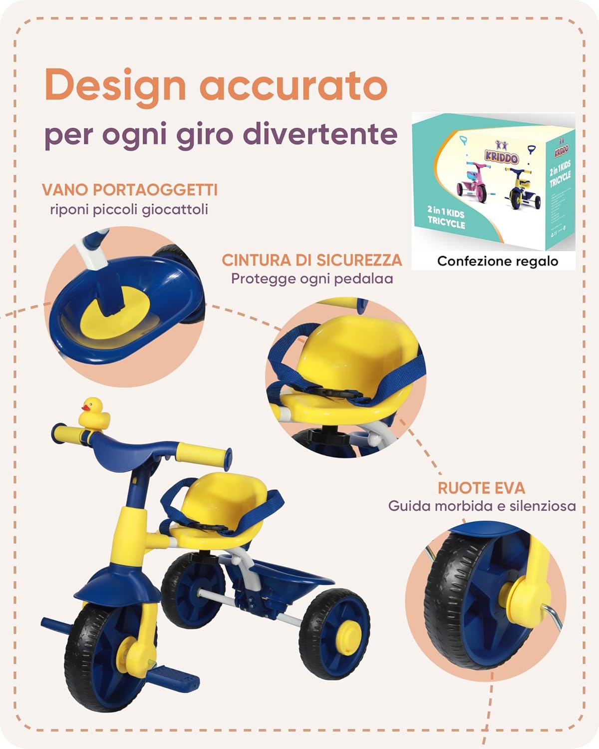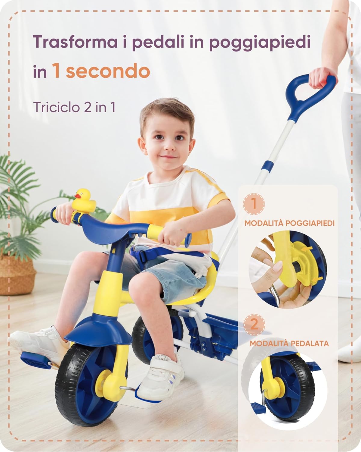 TRICICLO PER BAMBINI PICCOLI 2 IN 1 - Questo triciclo unico per bambini offre diverse opzioni di gioco, come la modalità di spinta da parte dei genitori grazie a un’asta lunga, oppure la tradizionale modalità ciclistica. DIVERTENTE SECCHIELLO DA VIAGGIO - Uno degli aspetti più entusiasmanti di questo triciclo è il piccolo contenitore sul retro, che permette ai bambini di portare con sé un peluche o altri piccoli giocattoli nelle avventure all’aria aperta. PEDALI SGANCIABILI - Grazie al design innovativo, i pedali di questo triciclo per bambini si possono facilmente sganciare dalla ruota senza smontarli; in questo modo i pedali restano fermi quando i genitori spingono oppure i bimbi possono pedalare autonomamente. CAMPANELLO IN GOMMA A PAPERELLA - Pedalare deve essere un'esperienza emozionante e gratificante per i più piccoli. Per questo motivo, il triciclo per bambini da 18 mesi a 4 anni è dotato di una paperella spremibile in gomma, che emette un suono divertente. MANIGLIA DI SPINTA REGOLABILE - Un elemento importante per aiutare i genitori a mantenere il controllo su bimbi più piccoli: la modalità di spinta consente di regolare l'altezza della barra per guidare il bambino in modo sicuro e confortevole.