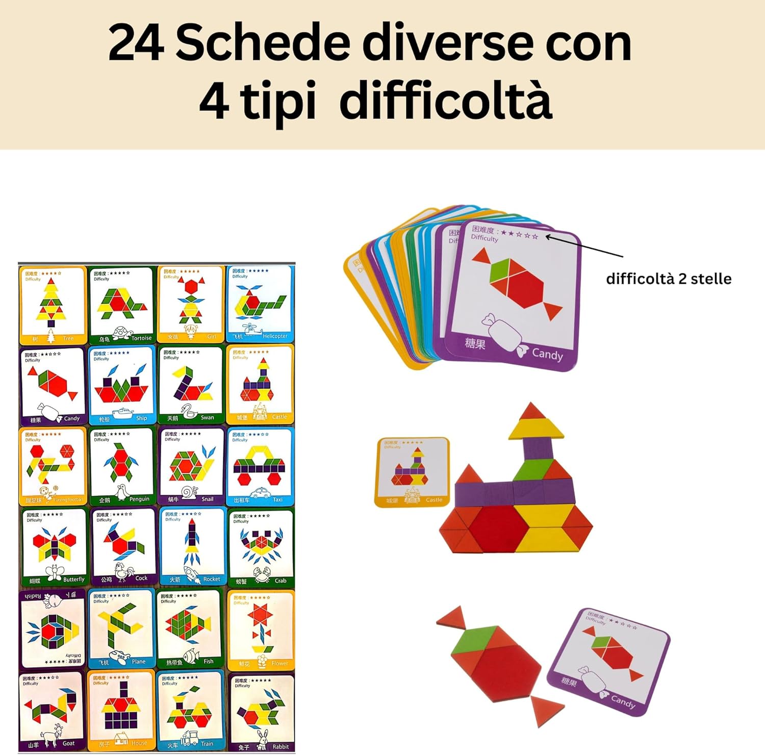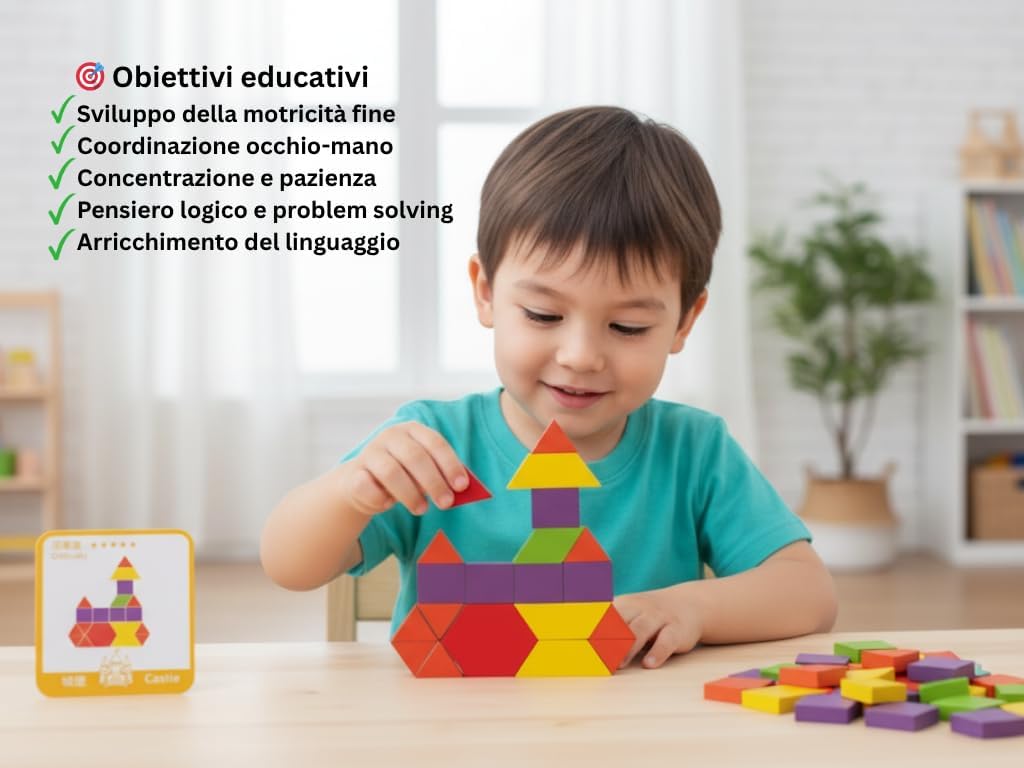 APPRENDIMENTO MULTIFORME: Insegna ai bambini il riconoscimento delle forme geometriche e dei colori, sviluppando al contempo il pensiero logico, la coordinazione occhio-mano e la pazienza. 5 LIVELLI DI DIFFICOLTÀ: Include 24 carte educative con immagini da riprodurre, contrassegnate da stelle per indicare 5 diversi livelli di difficoltà, adatte a crescere con il tuo bambino. MATERIALI SICURI E DUREVOLI: Realizzato con blocchi in legno di alta qualità e colori vivaci, garantendo un gioco sicuro e duraturo. FACILE DA RIORDINARE E TRASPORTARE: Il set include una pratica borsa/custodia in tessuto per riporre tutti i 155 pezzi e le carte, rendendolo perfetto per giocare a casa o in viaggioREGALO IDEALE: Perfetto per bambini dai 3 anni in su come regalo di compleanno o per le feste, offrendo ore di divertimentocostruttivo e apprendimento. SUPPORTO CLIENTI 24/7 : Non restare mai senza una risposta! Il nostro team di supporto è a tua disposizione in qualsiasi momento, 24 ore al giorno, per un'esperienza d'acquisto senza pensieri.