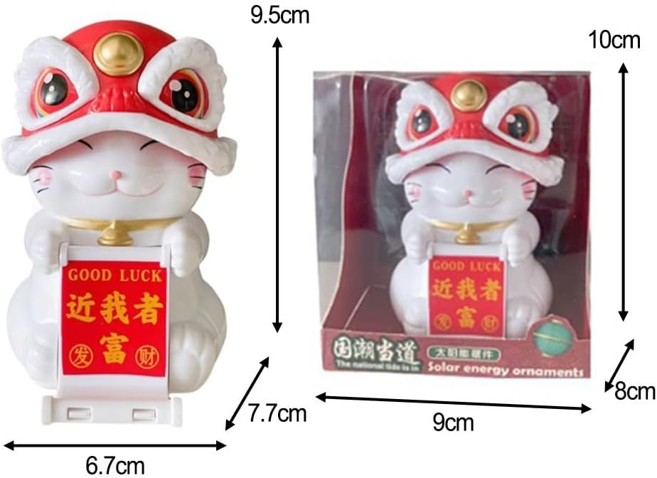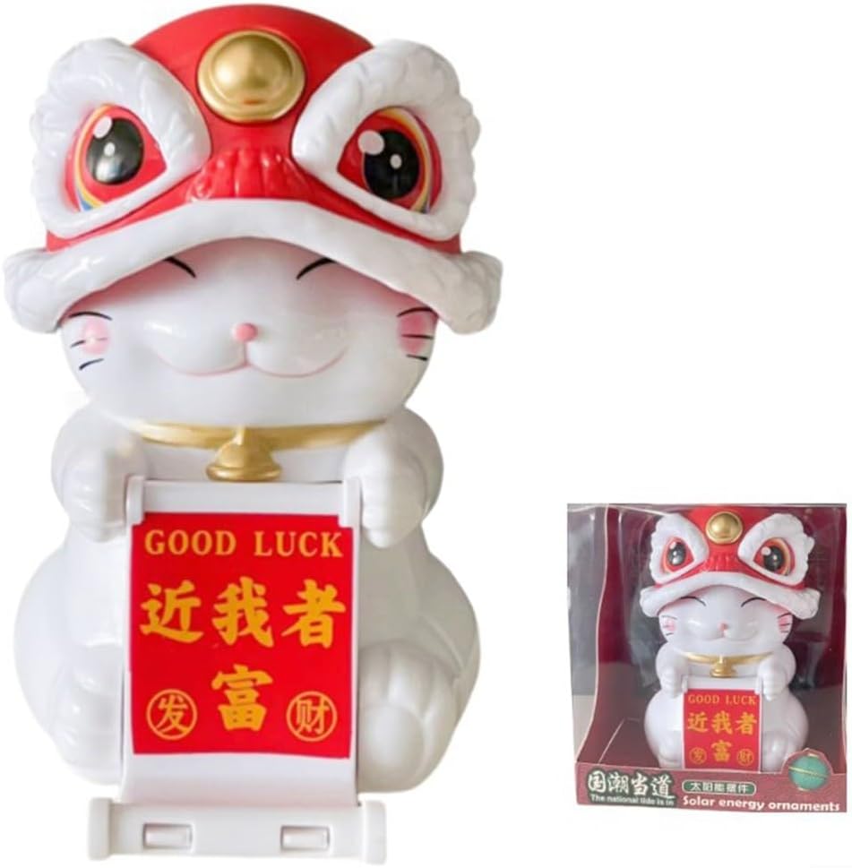 Gatto portafortuna ad energia solare: questo affascinante ornamento oscilla automaticamente alla luce del sole, aggiungendo un tocco vibrante alla tua casa o al tuo ufficio. [Design allegro] Con i suoi colori vivaci e l'espressione allegra, questo gatto fortunato porta felicità ed energia positiva in ogni stanza. [Decorazione] Per illuminare il soggiorno, la scrivania dell'ufficio o anche l'auto, simboleggia buona fortuna e viaggi sicuri ovunque sia posizionato. [Simbolo speciale di buona fortuna] Un emblema tradizionale di ricchezza e buona fortuna, è un regalo premuroso per l'inaugurazione della casa, il compleanno o il matrimonio per condividere gli auguri con i tuoi cari. Materiale: realizzato con una miscela di plastica e componenti elettronici, questo ornamento è progettato per durare e in continuo movimento.