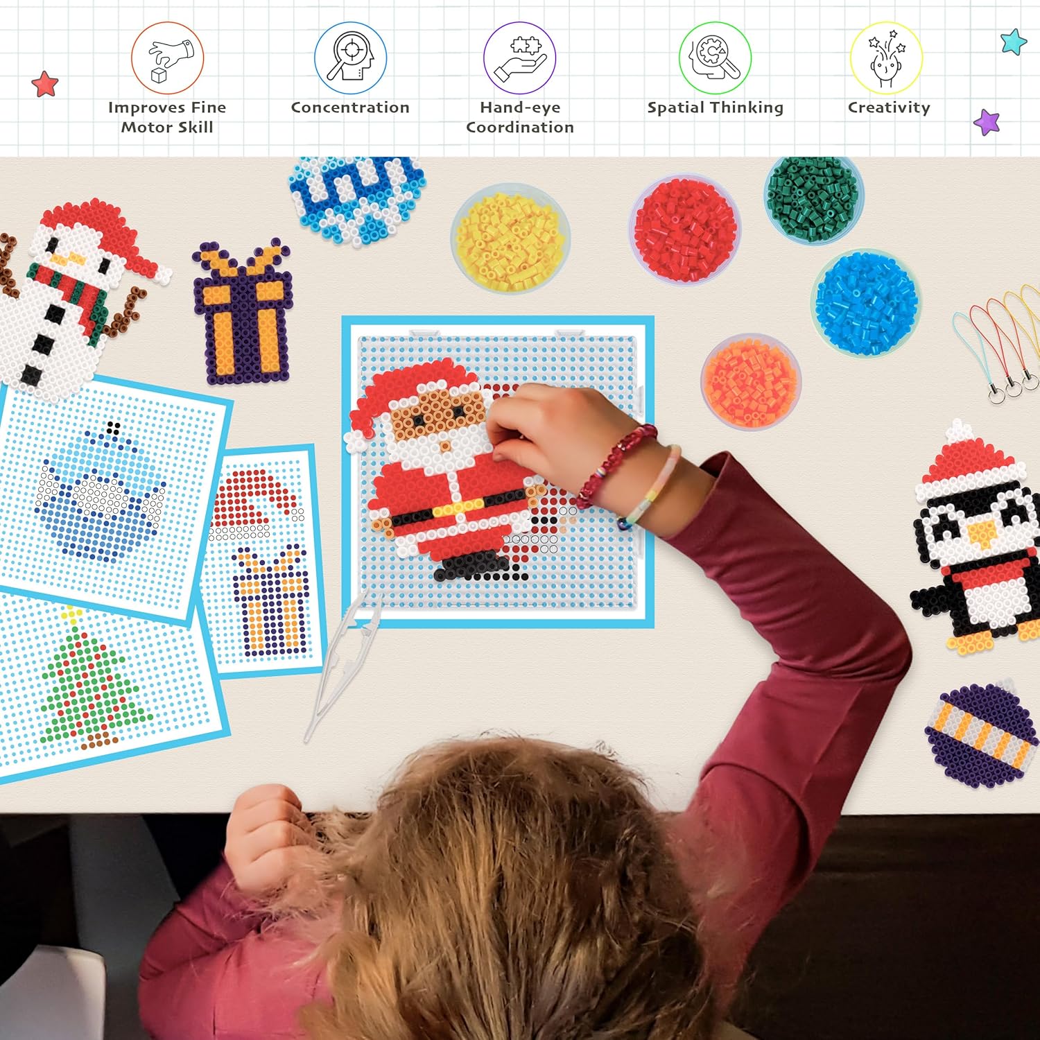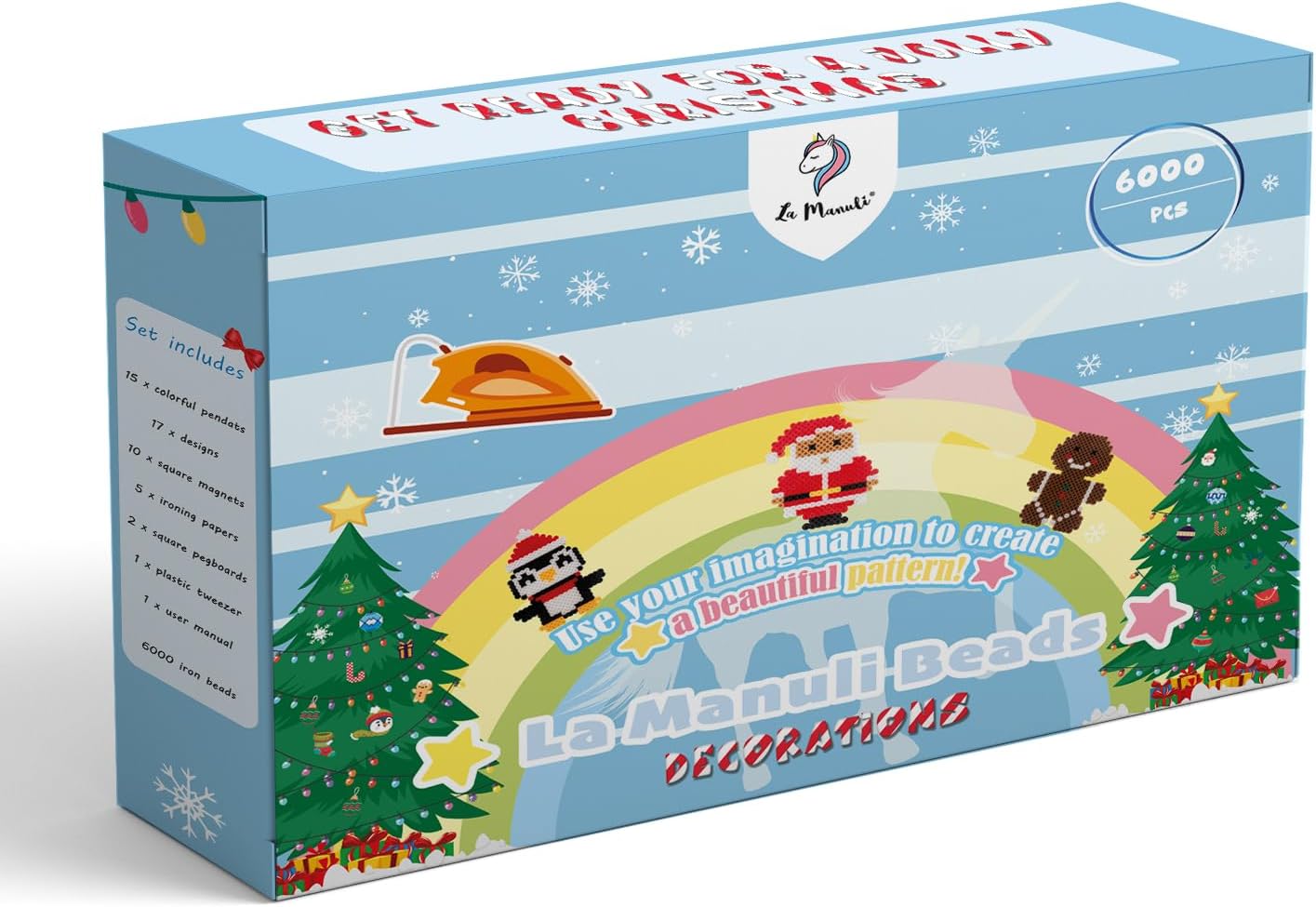 Attività creative di Natale: Con il kit La Manuli di perline da stirare, puoi creare decorazioni uniche per l'albero di Natale. Le 6000 perline fusibili in 12 colori ti permettono di realizzare motivi festivi che incanteranno tutta la famiglia ogni anno Artigianato creativo per bambini: Il set include 17 modelli di decorazioni natalizie come alberi di Natale, stelle e fiocchi di neve. Perfetto per bambini e adulti che desiderano aggiungere un tocco personale alle festività Coffret tutto-in-uno: Il kit comprende 2 basi per perline, 15 pendenti colorati, 10 magneti per frigorifero, 5 fogli trasparenti e 1 pinza. Tutto il necessario per creare gioielli, magneti o decorazioni per l'albero Sviluppa creatività e motricità fine: Questo kit di perline da stirare aiuta a migliorare la coordinazione occhio-mano e incoraggia il riconoscimento dei colori, perfetto per sviluppare le abilità artistiche dei bambini con progetti natalizi fai da te Ottima idea regalo per le feste: Questo set di perline fusibili è adatto come regalo per Natale o compleanni, perfetto per attività creative in famiglia, a scuola o durante campi creativi