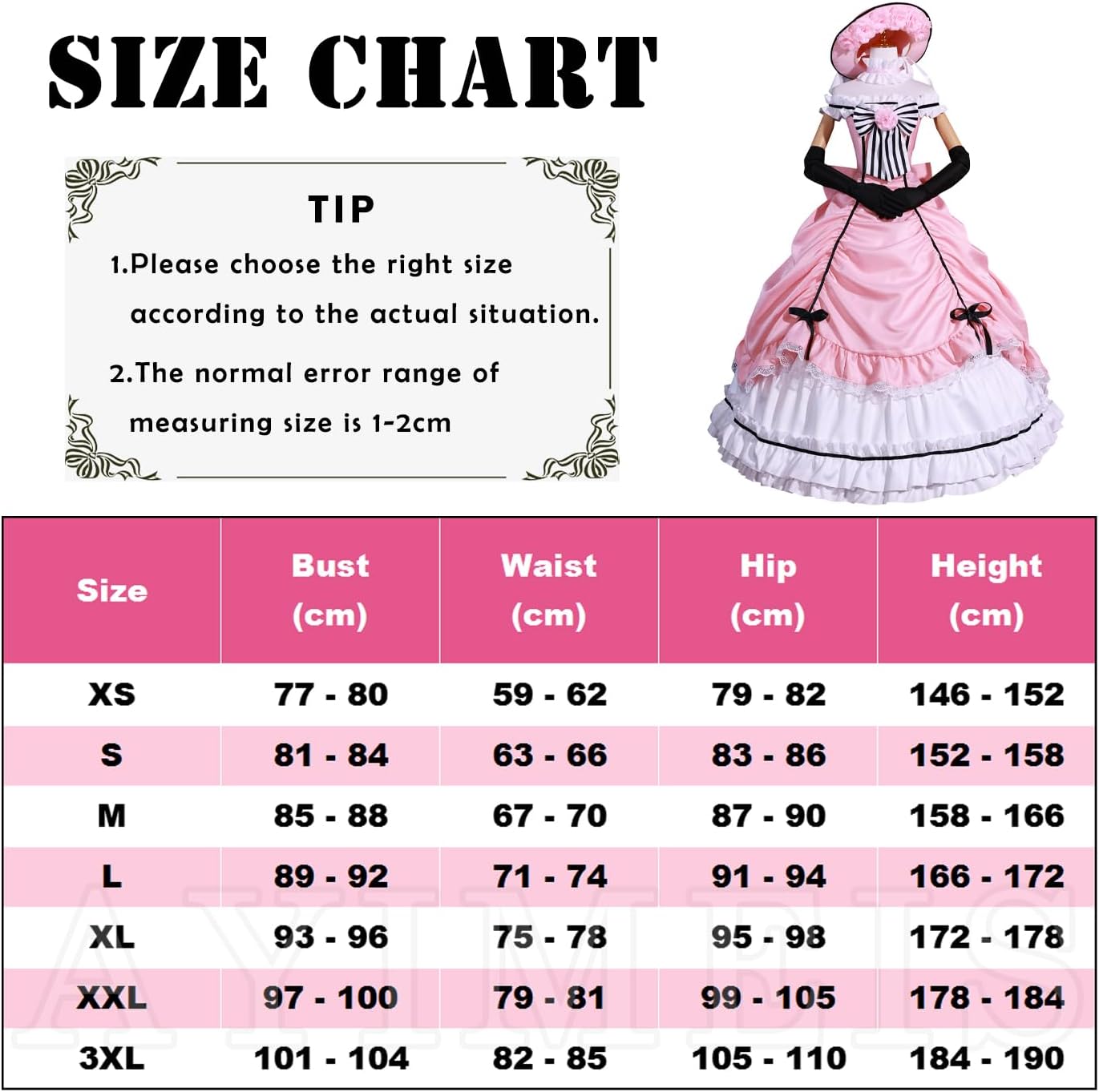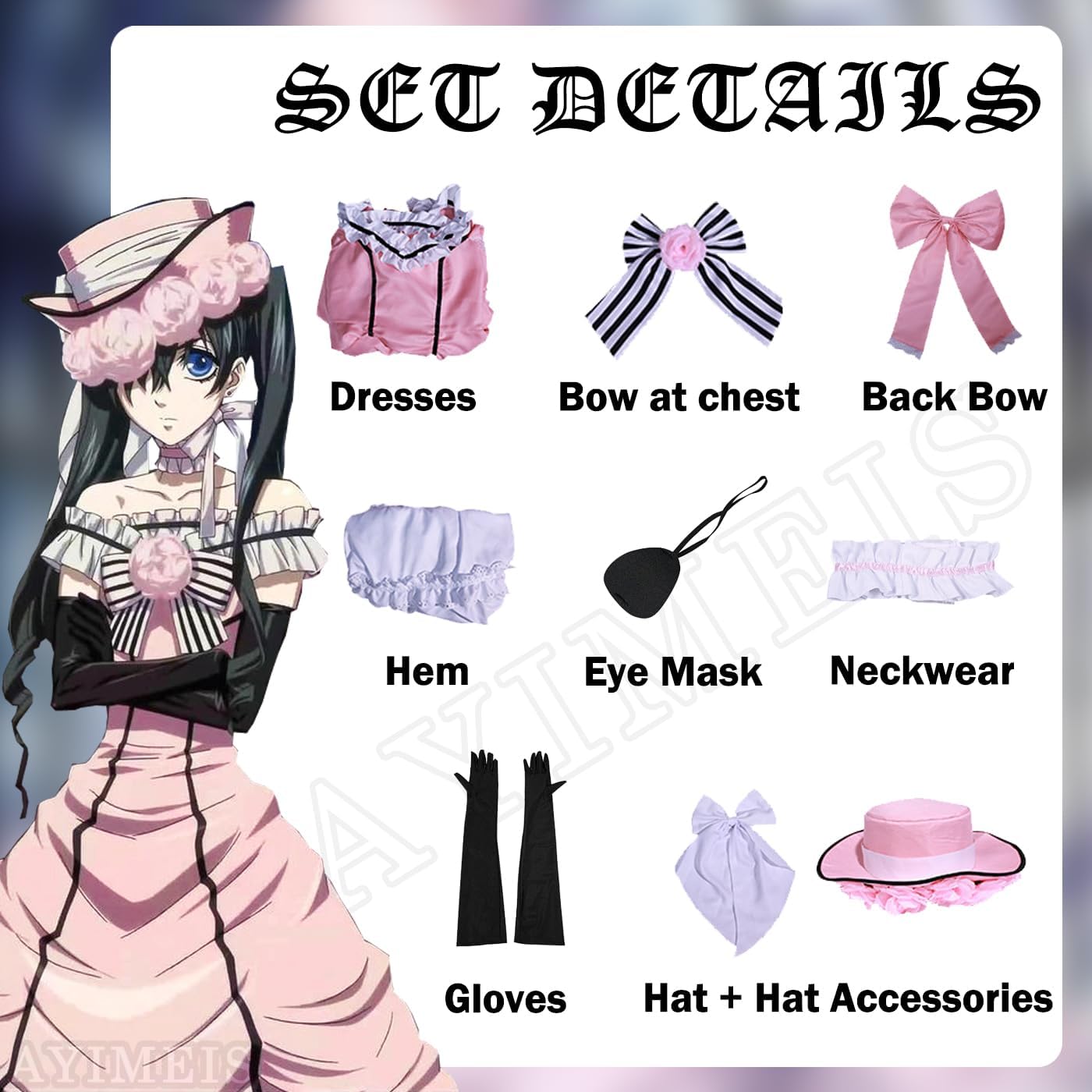 【Il pacchetto include】 - Vestito *1, Fiocco sul petto *1, Fiocco sulla schiena *1, Orlo *1, Maschera per gli occhi *1, Accessorio per il collo *1, Guanti *2, Cappello *1, Accessorio per il cappello *1 (come mostra l'immagine). 【Materiale principale】 - Poliestere. Realizzato in materiale di alta qualità, morbido, comodo da indossare e abbastanza resistente. 【Caratteristiche dell'abbigliamento】 - Costume Cosplay di Kuroshitsuji Ciel Phantomhive, Ripristinando i dettagli dell'abbigliamento di un personaggio animato, con un set completo di accessori, consente di completare facilmente il gioco di ruolo. 【Ampia applicazione】 - Perfetto per feste in costume a tema, festival, Natale, Halloween, carnevali, feste, performance sul palco, fotografia, Comic Con, Cosplay ecc. 【Riferimento taglia】 - Per assicurarti di ottenere una taglia adatta a te, fare riferimento alla nostra tabella delle taglie prima dell'acquisto (ultima foto).