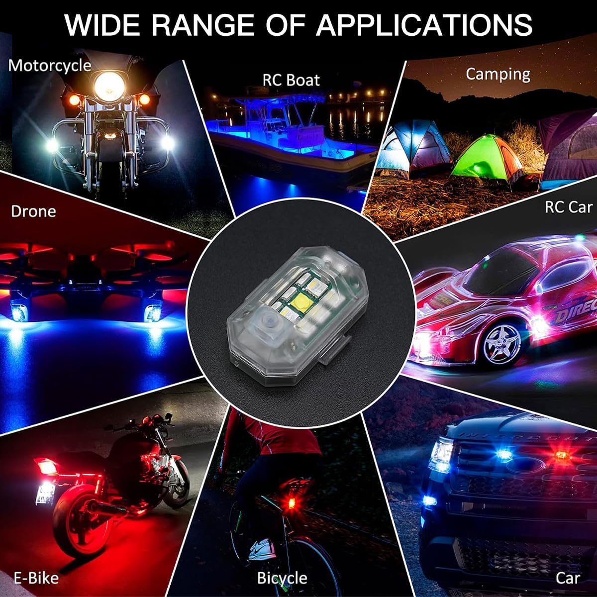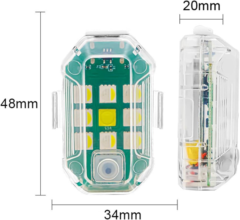 Progettato per l'uso in automobili, aerei telecomandati e altro, questo prodotto fornisce un'illuminazione LED potente e ad alta luminosità per una maggiore visibilità e sicurezza in ambienti scarsamente illuminati. Il dispositivo è dotato di sette colori di luci LED, che consentono di scegliere tra una varietà di colori di luce per migliorare il riconoscimento e l'attrattiva visiva ed è adatto a diversi scenari ed esigenze di utilizzo. Utilizzando un comodo metodo di ricarica USB, non è necessario sostituire frequentemente la batteria. Può durare a lungo dopo la ricarica, rendendolo comodo e pratico. Il dispositivo è facile da usare e può controllare le modalità di illuminazione e gli interruttori tramite il telecomando. È facile da installare ed è adatto a vari veicoli e aerei. Il flash LED ad alta luminosità fornisce effetti di riflessione significativi, che possono ridurre efficacemente il rischio di collisione con droni o altri velivoli e garantire la sicurezza del volo.