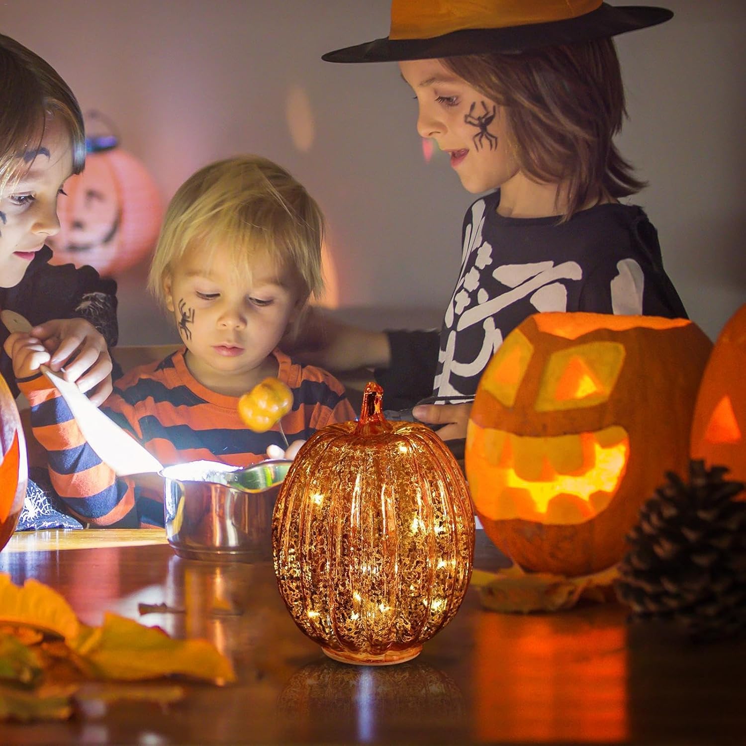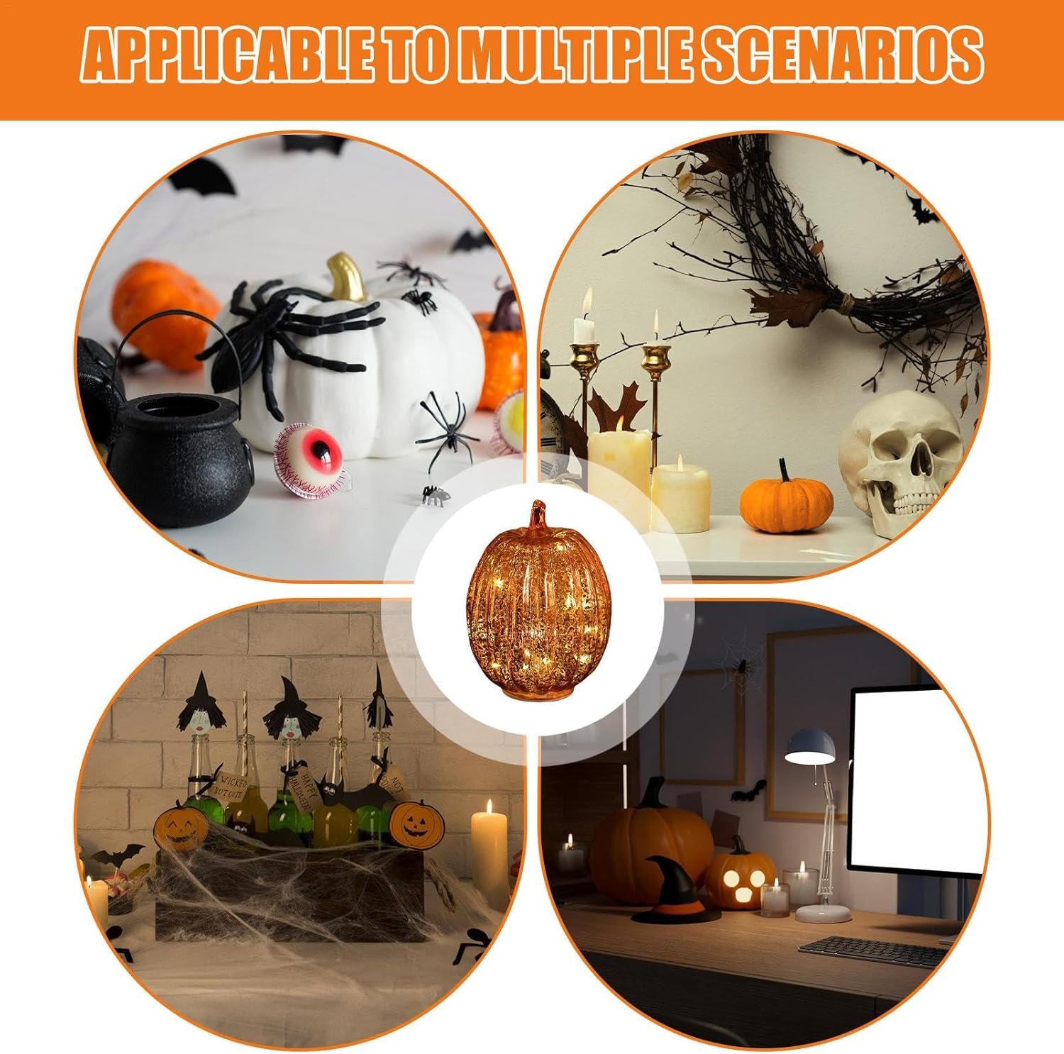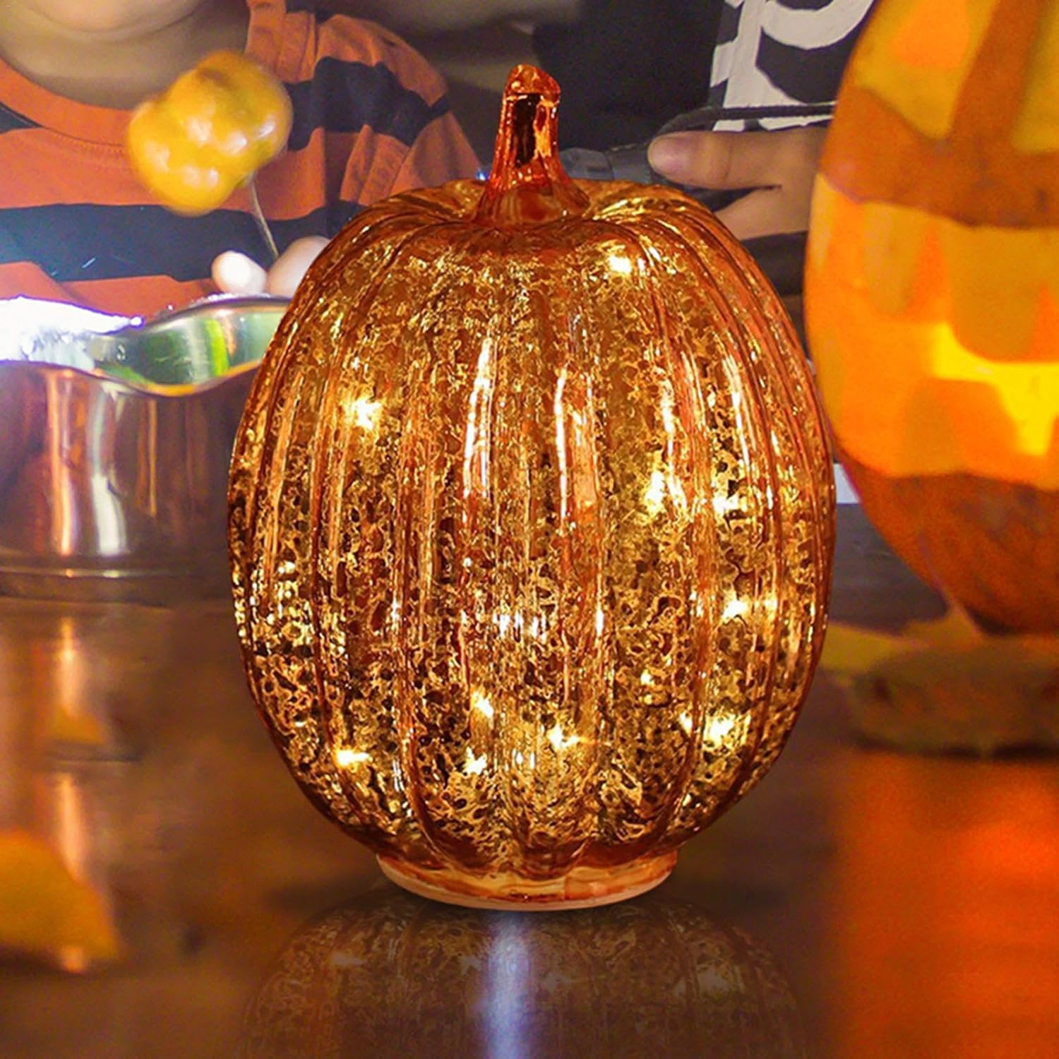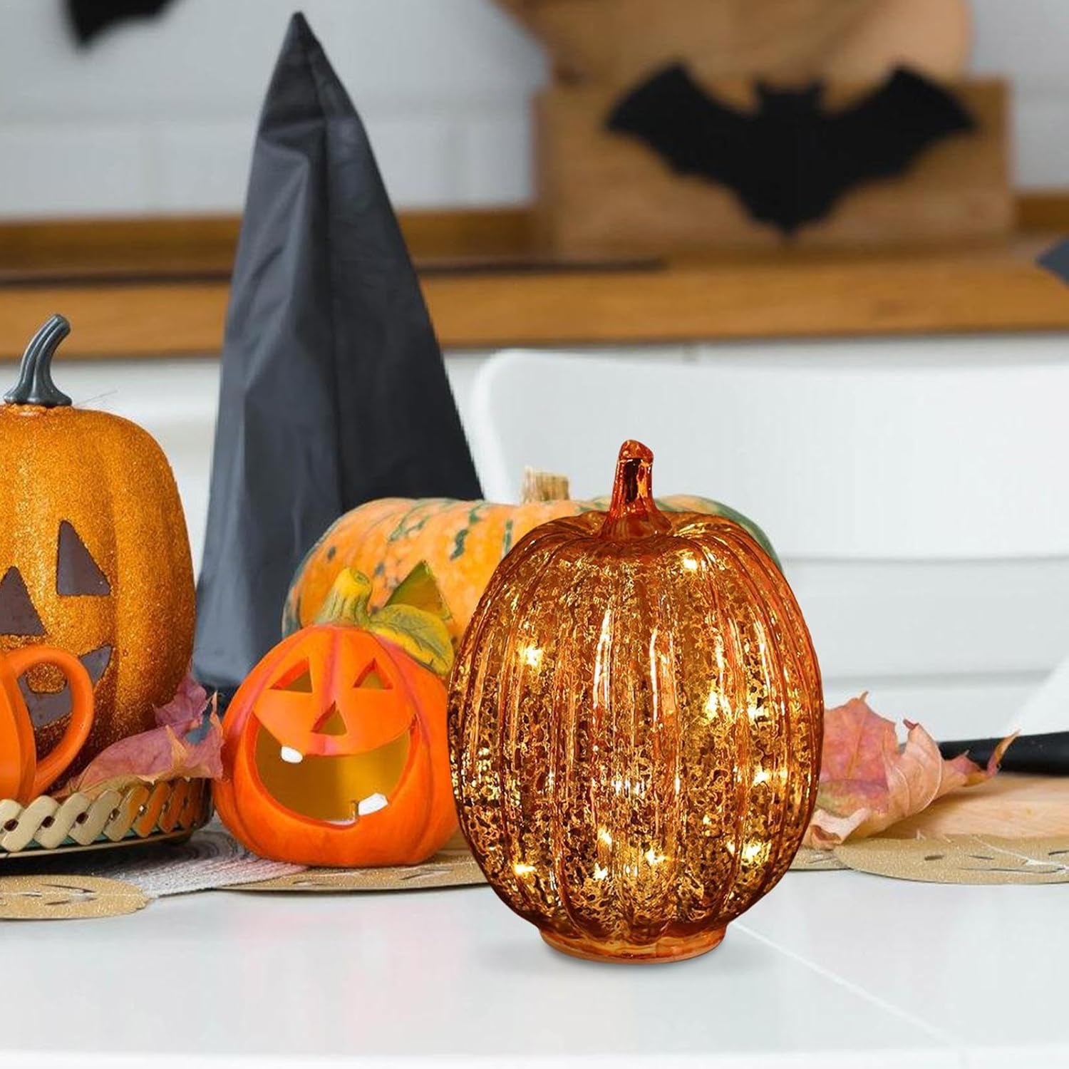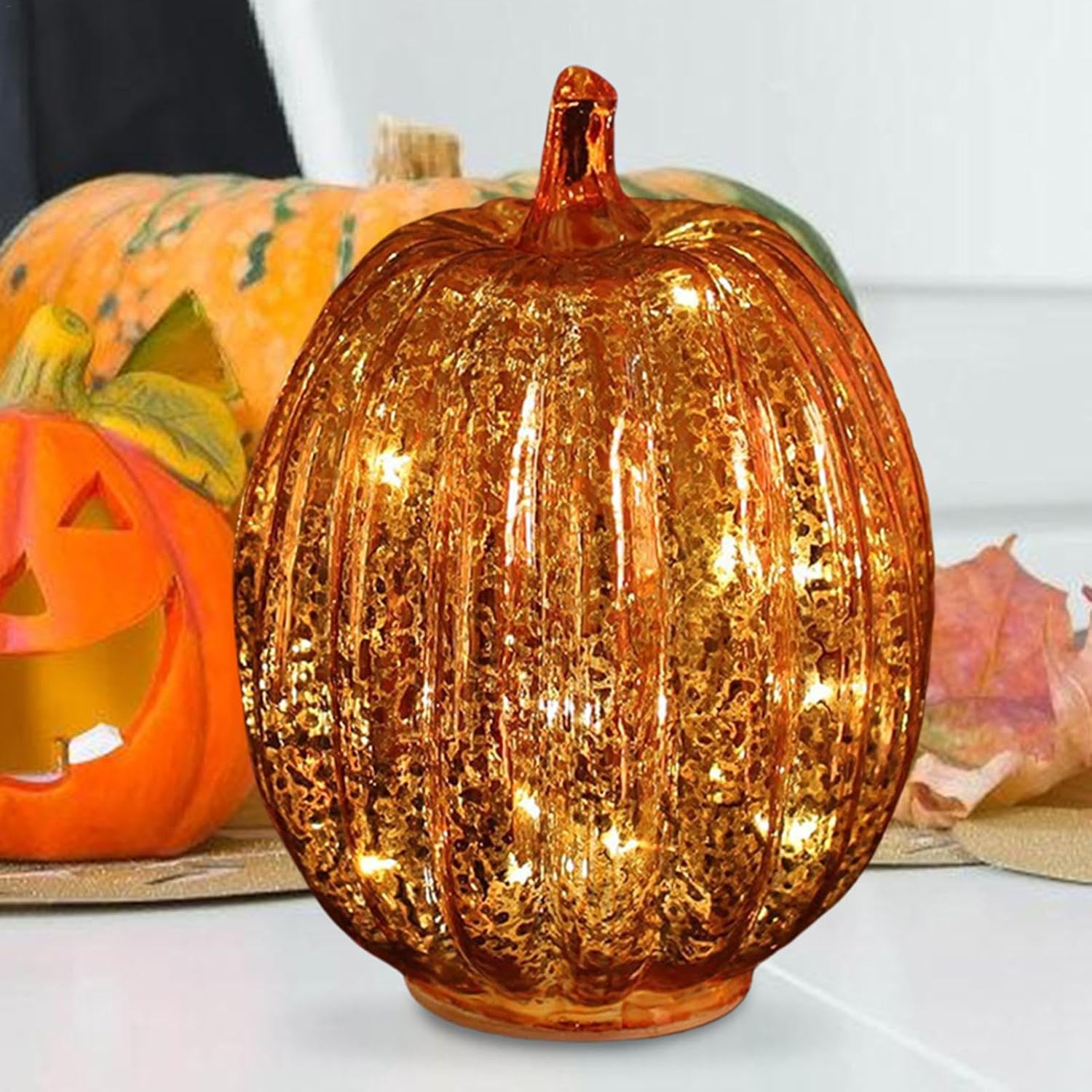 Migliora il tuo arredamento autunnale: goditi un'atmosfera autunnale romantica e calda con queste bellissime luci a forma di zucca in vetro che aggiungono un tocco di eleganza e calore alla tua casa. Perfetto per migliorare le decorazioni del Ringraziamento o di Halloween e creare l'esperienza autunnale ideale. Comodo timer: imposta gli interruttori a 3 posizioni sulla modalità timer e goditi l'incantevole bagliore per 6 ore, seguite da 18 ore di riposo del pilota automatico. Non è necessario l'intervento manuale. Adatto ai bambini: aggiungi un tocco di fascino ad Halloween con le nostre luci in vetro a forma di zucca. Sicuro per bambini e animali domestici, le luci a LED e il vetro colorato eliminano i rischi di incendio. Ogni luce richiede 3 batterie AAA non incluse Delizie decorative: con le nostre luci a forma di zucca in vetro, le luci a LED illuminano le splendide zucche in vetro, rendendole una fantastica luce a forma di zucca illuminata per ogni occasione. Funzionante a batteria, questa delizia decorativa aggiungerà fascino stravagante al tuo arredamento festivo. Ampia applicazione: illumina il tuo spazio con le nostre luci di zucca in vetro, fornendo fascino country e atmosfera autunnale. Perfette per festival a tema autunnale, compleanni, feste, matrimoni e centrotavola a casa o in hotel, queste luci danno vita alle decorazioni autunnali con molte applicazioni