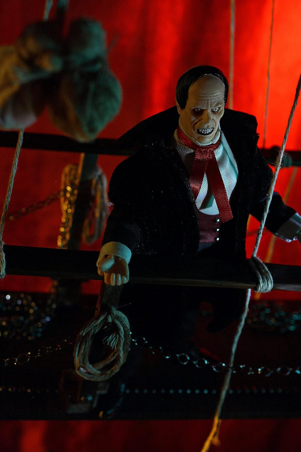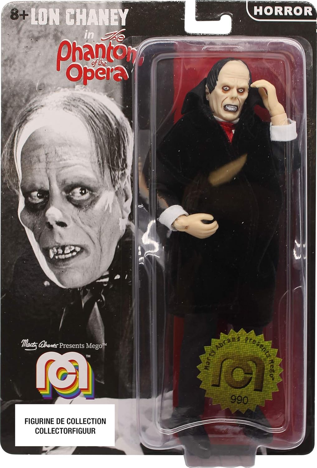 Mego è una serie di figure da collezione provenienti dai mondi essenziali della musica, della TV e del cinema. Edizione limitata! Il Fantasma dell'Opera è la storia di Erik, un uomo rifiutato dalla società che vive nel seminterrato dell'Opera Garnier di Parigi, che si innamora perdutamente di uno dei cantati. La giovane scopre la sua bruttezza e nonostante le promesse di ricatto, la giovane tenta ogni mezzo possibile per sfuggirgli. La figura del Fantasma dell'Opera è alta 20 cm e ha 14 punti di articolazione. Scopri una collezione di più di venti figure costantemente rinnovate. Gli argomenti sono numerosi: horror, musica, cinema, fantascienza. Da 8 anni in su.