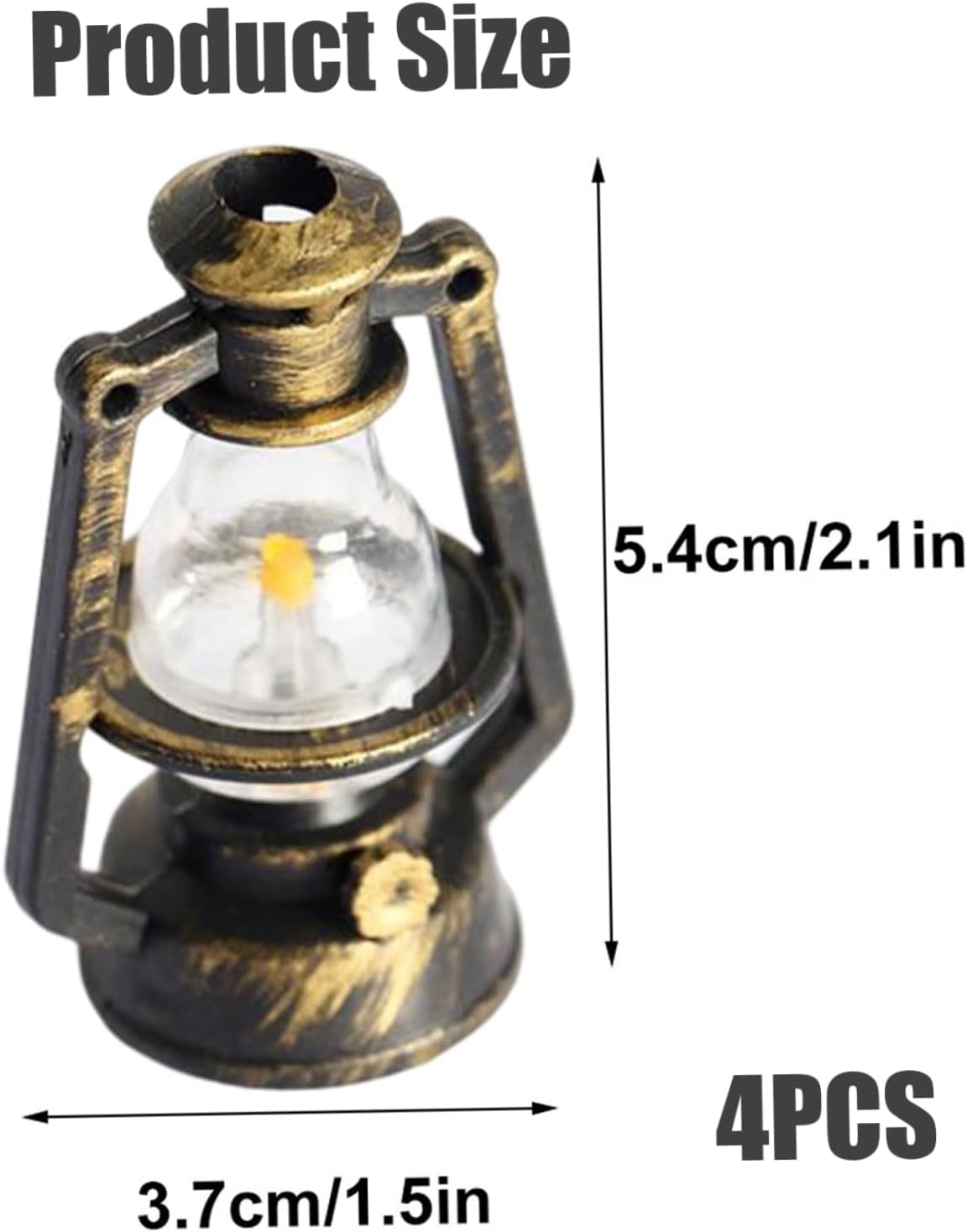 Ampiamente usato: il design vintage della lampada a gas ti offre un ambiente medievale realistico, che può rendere la tua casa delle bambole più interessante..Puoi giocare a questo ornamento per la casa delle bambole con i tuoi bambini e divertirti e sarebbe assolutamente perfetto per i bambini interessati al gioco della casa delle bambole. Set di 4 lampade a cherosene in miniatura: la nostra confezione include 4 pezzi di affascinanti lanterne in miniatura in stile retrò da 3,7x5,4 cm/1,46x2,13 pollici..Queste lampade a olio vintage sono progettate in scala 1:12, aggiungendo un tocco realistico e nostalgico all'arredamento della tua casa delle bambole. Decorazione versatile: queste lampade a cherosene in miniatura non limitano alla decorazione della casa delle bambole..Possono essere utilizzati anche per altre ambientazioni in miniatura, diorami, lavori manuali e terrari..Lascia che la tua creatività incorpori queste lampade a olio vintage in vari progetti. Squisito design retrò: ogni lampada a cherosene in miniatura è realizzata con cura con attenzione ai dettagli, caratterizzata da un design retrò che replica l'eleganza delle lampade a olio vintage..I motivi intricati e la finitura anticata esaltano l'autenticità di questi accessori per la casa delle bambole. Perfetta decorazione natalizia per la casa delle bambole: che sia Natale o qualsiasi altro periodo dell'anno, queste lanterne in miniatura sono un'aggiunta meravigliosa all'arredamento della tua casa delle bambole..Crea un ambiente accogliente e festoso con la calda luce di queste lampade a olio retrò.