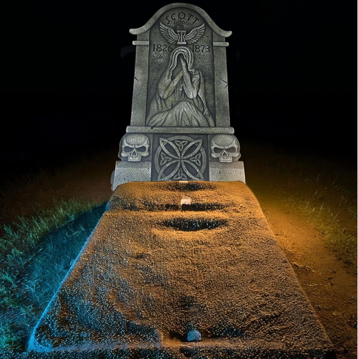 Lapide di Halloween dettagliata con figura che piange Aspetto di pietra realistico con rilievi di teschi spaventosi Dimensioni: ca. 90 x 48 cm - ideale per giardini e ingressi Realizzato in materiale leggero Facile da montare, combinabile in molti modi con altre decorazioni spaventose