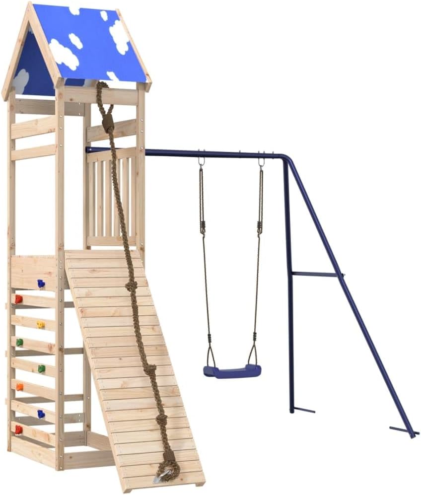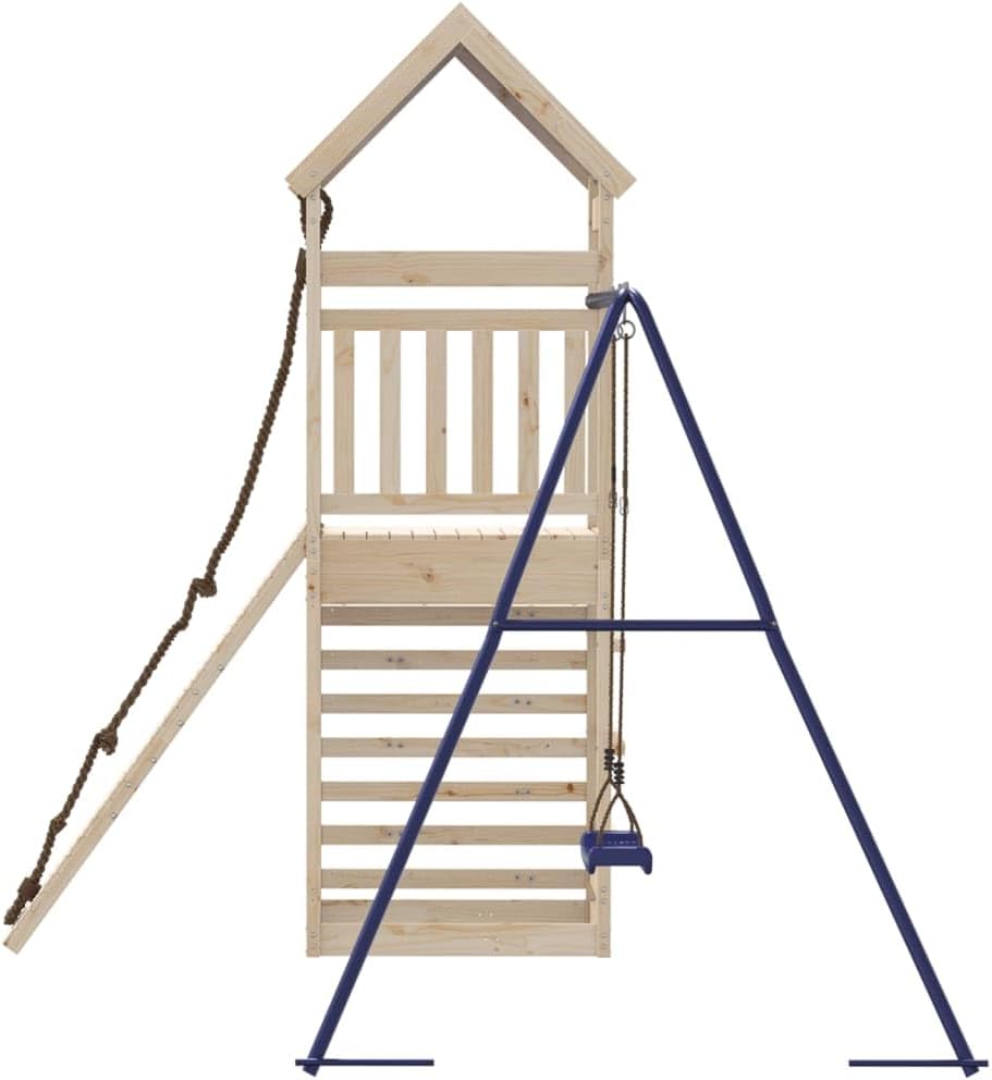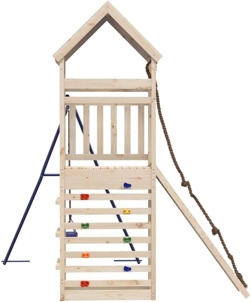 Materiale durevole: Questo parco giochi da giardino è realizzato in legno massello di pino. Il legno massello di pino è noto per la sua resistenza e durata. Le sue venature dritte e i suoi nodi caratteristici contribuiscono al suo fascino rustico. Telaio robusto in legno: La struttura in legno della casetta da giardino garantisce robustezza e stabilità. Inoltre, le gambe a forma di "A" dell'altalena per Bam bini consentono l'equilibrio.
