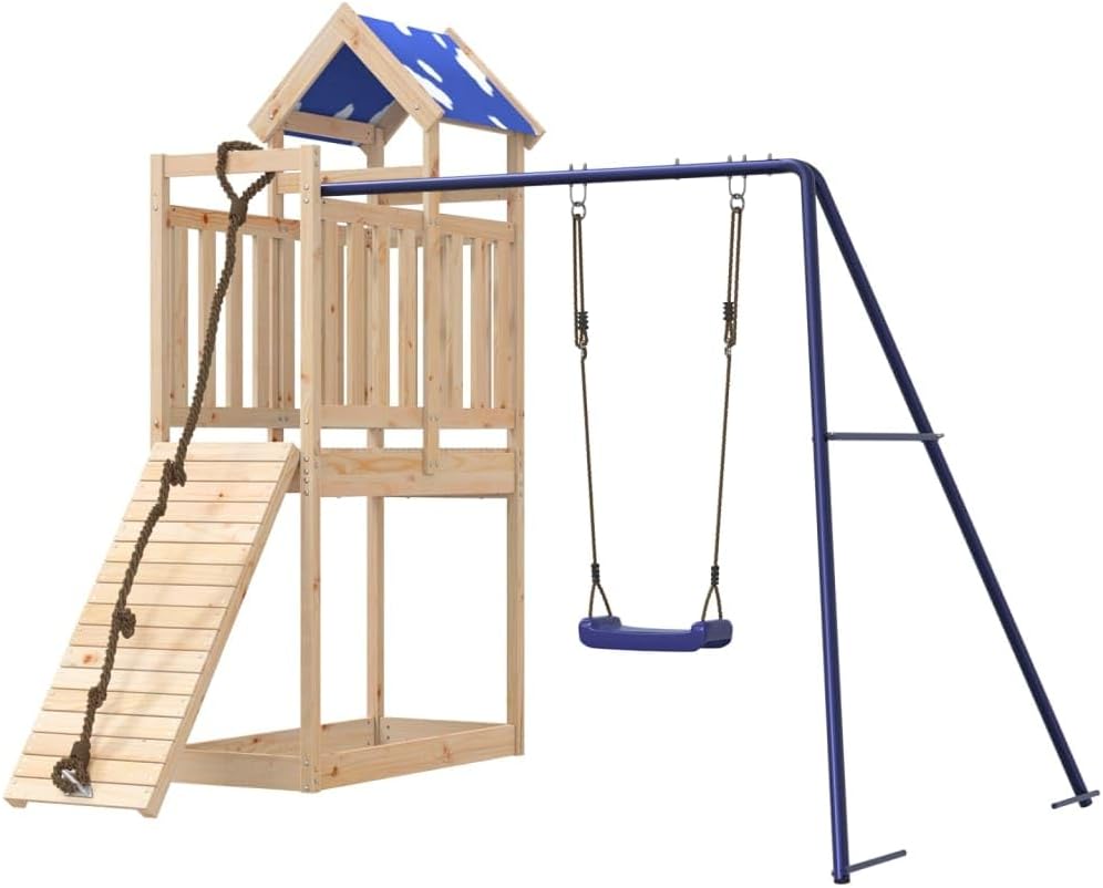Materiale durevole: Questo parco giochi da giardino è realizzato in legno massello di pino. Il legno massello di pino è noto per la sua resistenza e durata. Le sue venature dritte e i suoi nodi caratteristici contribuiscono al suo fascino rustico. Telaio robusto in legno: La struttura in legno della casetta da giardino garantisce robustezza e stabilità. Inoltre, le gambe a forma di "A" dell'altalena per Bam bini consentono l'equilibrio.