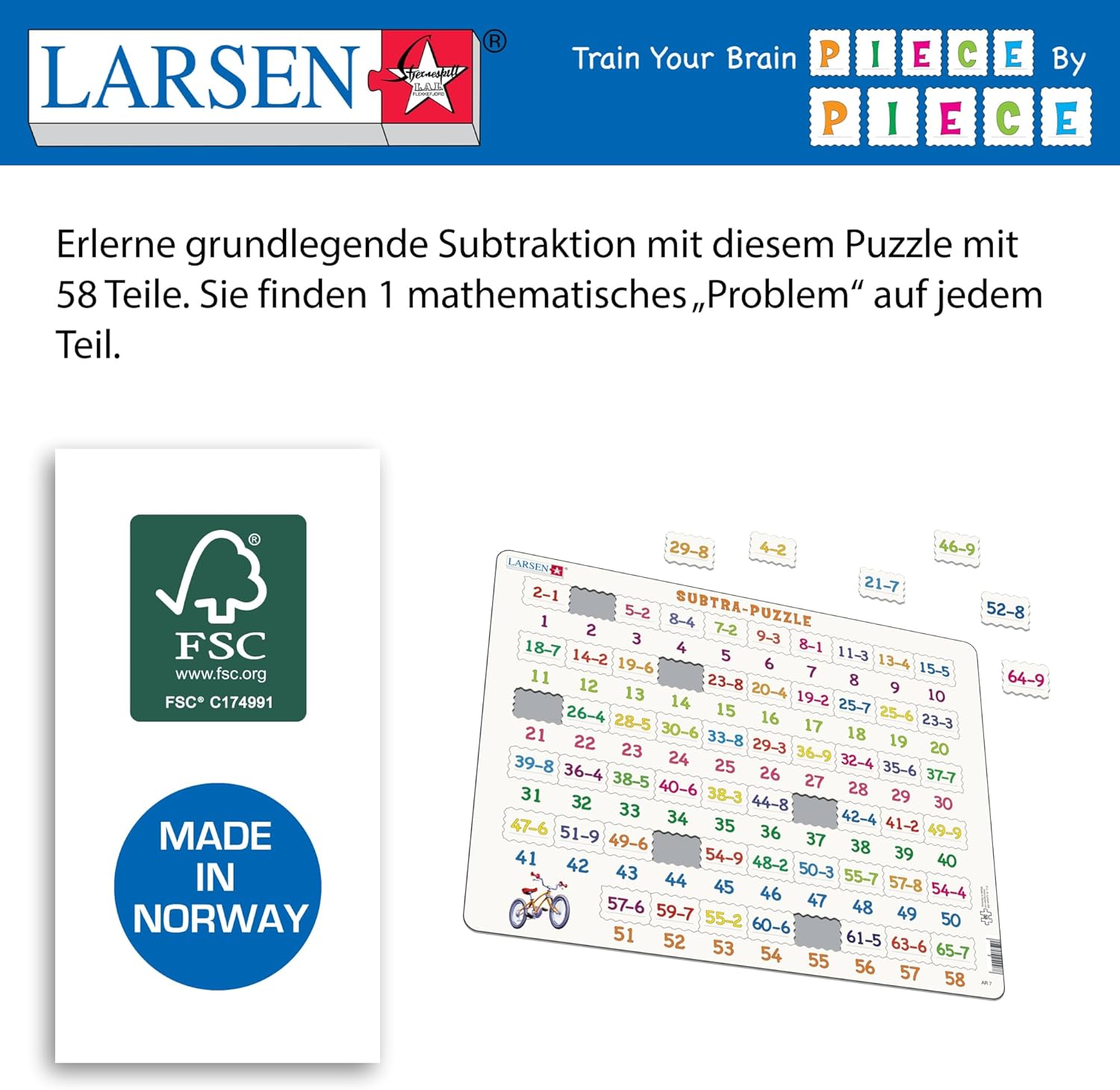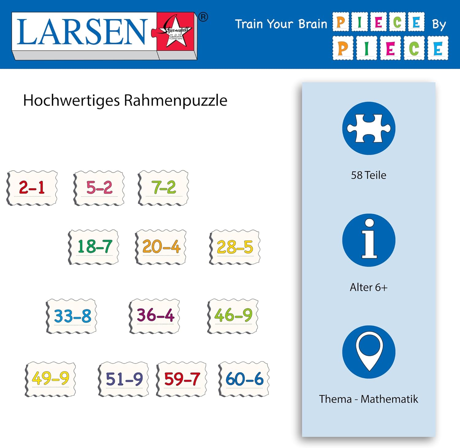 EDUCAZIONE - Questo puzzle aiuta i bambini a imparare la matematica. La pratica rende perfetti e più volte il puzzle viene completato, meglio il bambino lo ricorderà. QUIZ PUZZLE - Ogni pezzo mostra un problema che deve essere risolto e la cornice mostra le risposte. Se la parte si adatta, il problema è stato risolto correttamente. SENZA SCATOLA - Il design salvaspazio del vassoio e del telaio non richiede una scatola di immagazzinaggio, rendendolo facile da riporre. AIUTO ALL'APPRENDIMENTO - I puzzle consentono al puzzle di lavorare al proprio ritmo e sviluppare la capacità di concentrazione. DESIGN ROBUSTO - Il cartone extra spesso e robusto rende il puzzle durevole e duraturo pur essendo facile da maneggiare per i bambini di tutte le età.