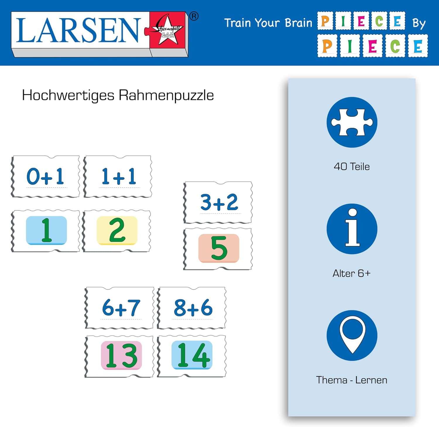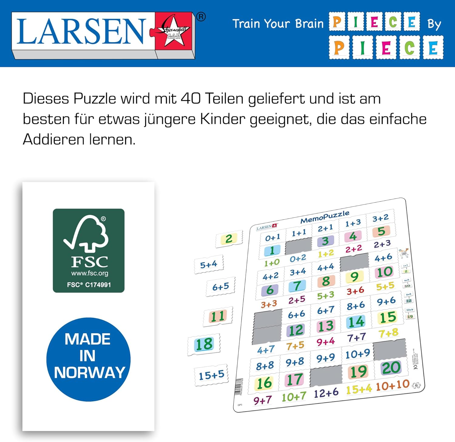 ISTRUZIONE - Questo puzzle aiuta i bambini ad imparare la matematica. La pratica rende perfetto, quindi più volte il puzzle viene completato, meglio il bambino ricorderà. MEMO PUZZLE - Inizialmente un MemoPuzzle è destinato ad essere utilizzato come Quiz Puzzle, dove ogni pezzo mostra il problema da risolvere ponendo il pezzo dalla risposta corretta sulla cornice. In seguito i pezzi possono essere usati per giocare a Memo. IMPARARE L'AIUTO - I rompicapi permettono alla persona perplessa di lavorare al proprio ritmo e di sviluppare la capacità di concentrazione. SCATOLA NO - Il design del vassoio e del telaio, efficiente dal punto di vista dello spazio, non richiede una scatola per l'immagazzinamento, il che lo rende facile da riporre. VASSOIO E TELAIO - Tutti i nostri puzzle sono realizzati con vassoio e un bordo permanente che tiene i pezzi in posizione durante il puzzle.