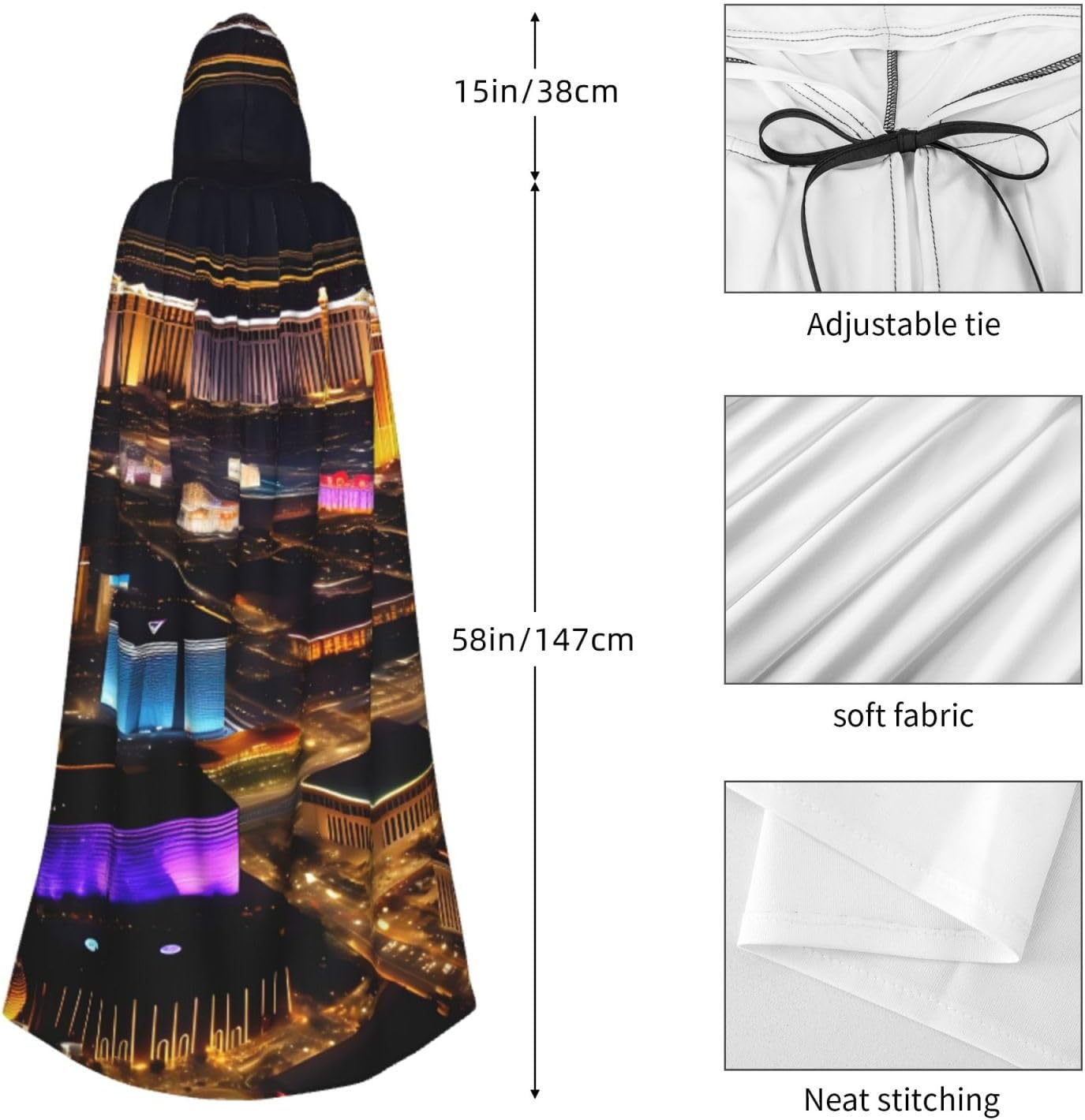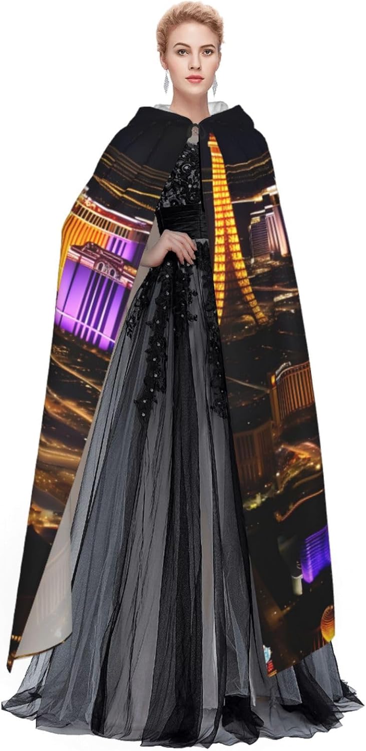Realizzato in poliestere, questo mantello con stampa notturna di Las Vegas con cappuccio garantisce longevità e comfort. Le sue dimensioni ottimali assicurano una copertura completa per tutte le età, facendoti risaltare in qualsiasi evento. Che tu sia diretto per Halloween, un evento cosplay, un costume da palcoscenico, una festa in maschera, una festa a tema, un ballo o una convention di fumetti, questo mantello è una scelta ideale. Il suo design unico, completo di un grande cappuccio e cravatte collare. Inoltre, puoi dire addio ai metodi di pulizia complicati. Questo mantello con cappuccio con stampa notturna di Las Vegas è lavabile in lavatrice e a mano, offrendo una cura senza sforzo. Esci con stile e comfort con il nostro mantello con cappuccio, il tuo compagno per tutti gli eventi e le occasioni.