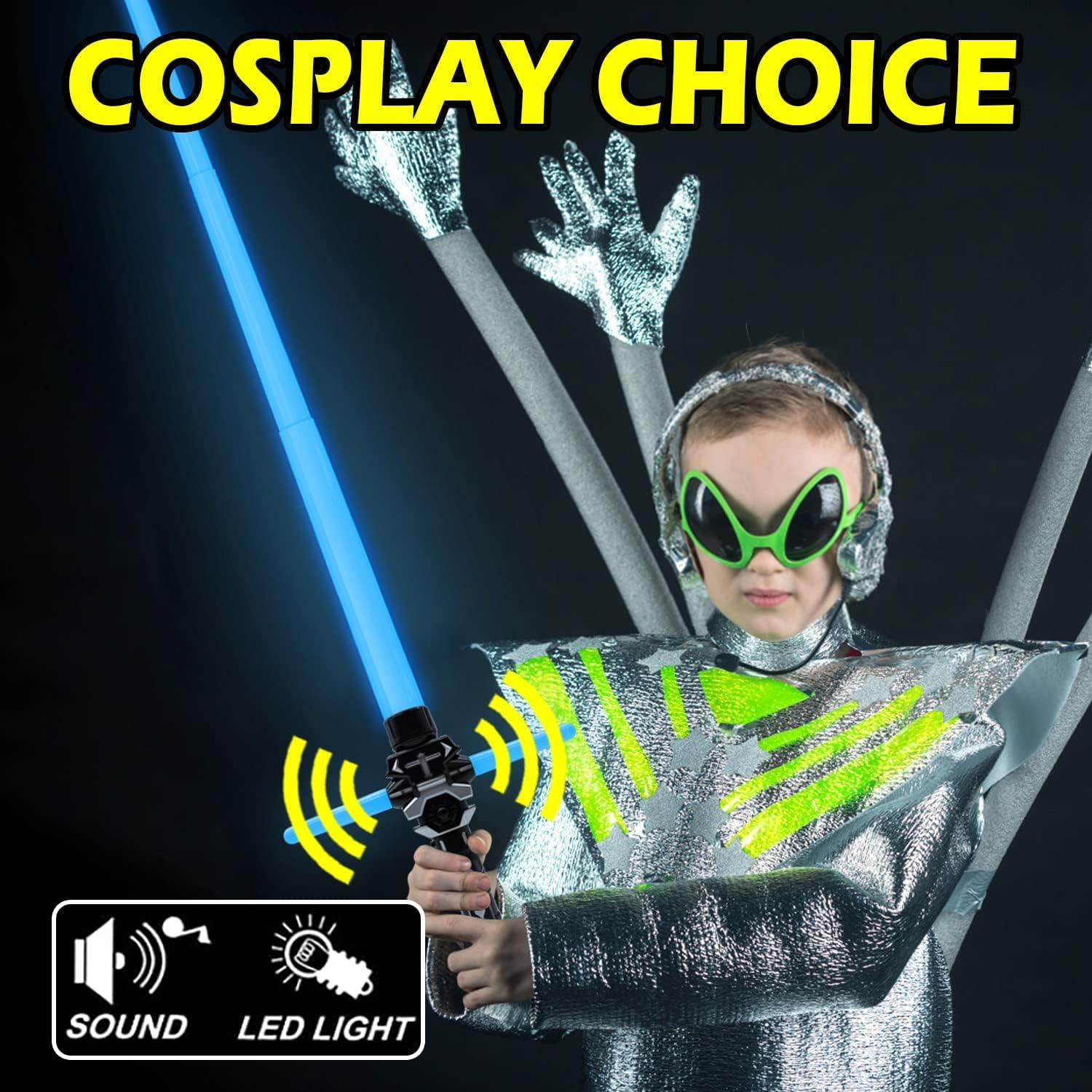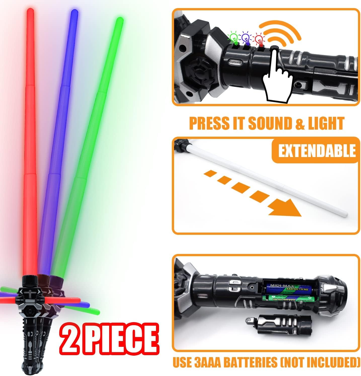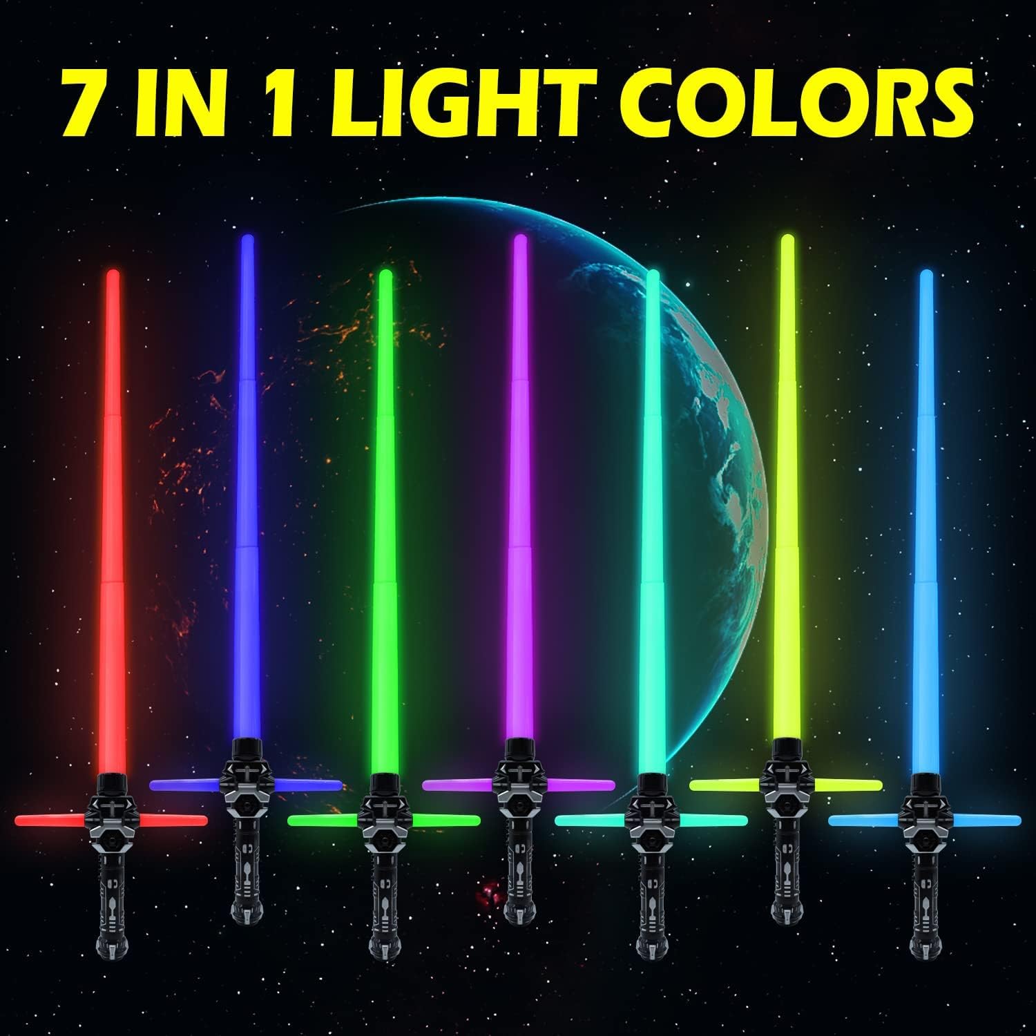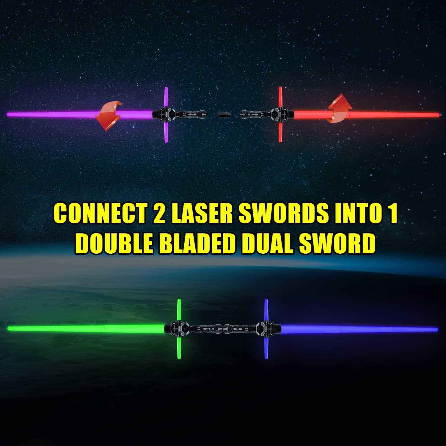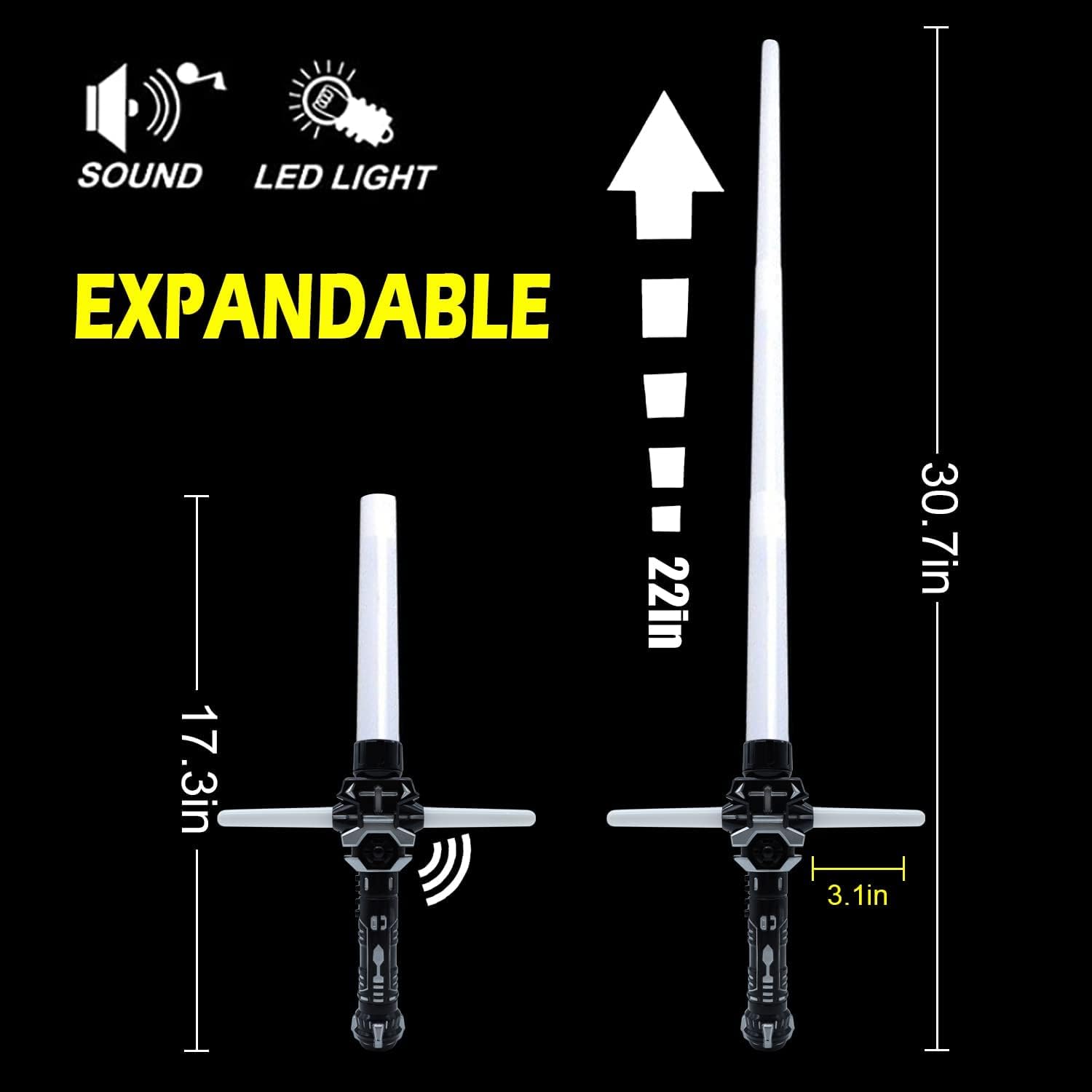 Spada laser per bambini con effetti sonori: otterrai 2 spade laser, 2 in 1 spade laser per bambini, puoi cucire le due spade insieme, la spada laser RGB può emettere 7 colori diversi (con suono, può essere disattivata), retrattile, che è facile da negozio e uno forte Ha il senso dell'uso Ogni spada laser richiede 3 batterie AAA (batteria non inclusa) Basta premere il pulsante sull'elsa per attivare il suono della battaglia e gli effetti di illuminazione a LED. Materiali di alta qualità: porta divertimento infinito a ragazzi, ragazze e adulti. La spada laser è realizzata in plastica di alta qualità. È durevole, sicuro per i bambini, facile da usare e atossico. Adatto a bambini di età superiore ai 3 anni. Luci LED luminose ed effetti sonori: queste spade laser giocattolo hanno luci LED luminose che possono brillare al buio e illuminare la scena. Ci sono 7 colori chiari, 6 modalità lampeggianti possono essere commutate e l'effetto sonoro corrispondente alla battaglia sarà prodotto durante la battaglia. Porta una spada a doppio taglio e mostra le tue abilità di combattimento nello spettacolo di luce con i tuoi amici. Accessori per costumi: questa spada luminosa in 2 pezzi è un'ottima aggiunta a qualsiasi film fantasy o costume da gioco di ruolo. In incontri epici con amici e nemici, queste armi possono anche diventare le tue armi preferite e accuratamente selezionate. Ottima guida alla lista dei giocattoli dei regali di vacanza: i giocattoli guida per le vacanze possono utilizzare spade laser tra uomini e donne, che possono portare sorprese in ogni occasione. Natale, Halloween, compleanno o qualsiasi occasione speciale regalo sono grandi opportunità per dare questo set di spada laser 2 in 1.