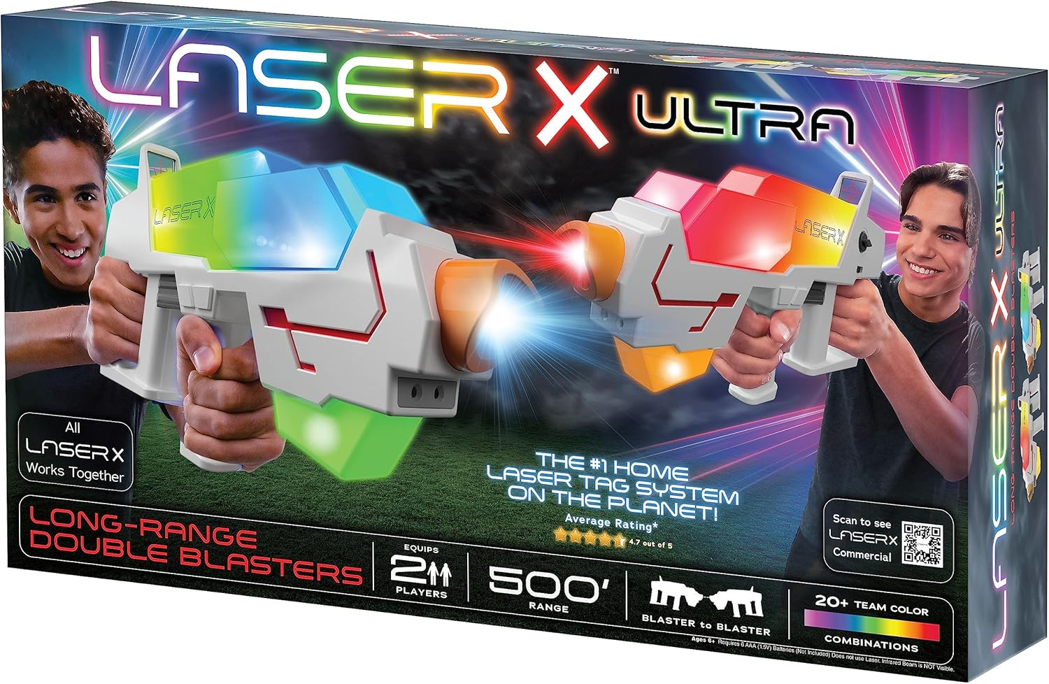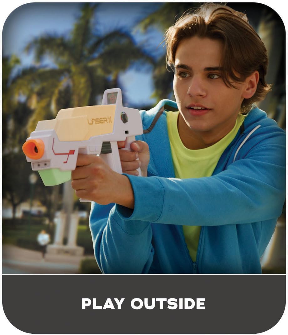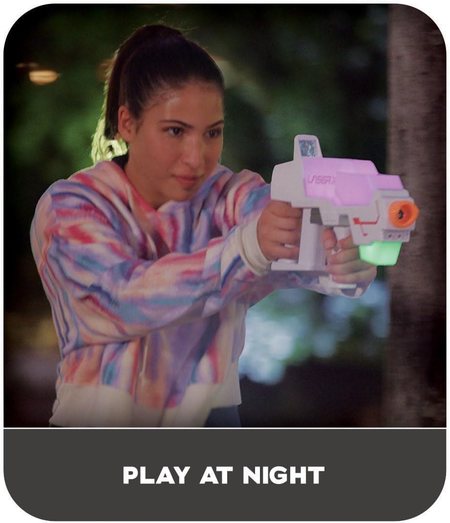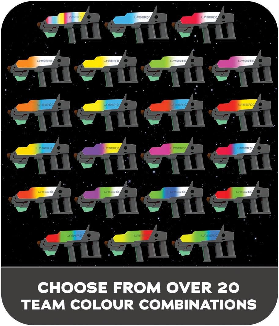 Tutti i LaserX lavorano insieme, equipaggiare 2 giocatori blaster al blaster. Il sistema di etichette laser n. 1 sul pianeta! Scegli tra oltre 20 combinazioni di colori del team con una portata di 150 m. La modalità ultra ti consente di passare attraverso tutti i colori. I ricevitori Ultra consentono di vedere chi ti ha taggato, giocatori illimitati. Gioca il giorno, gioca di notte, gioca dentro, gioca fuori. Scorrimento rapido.