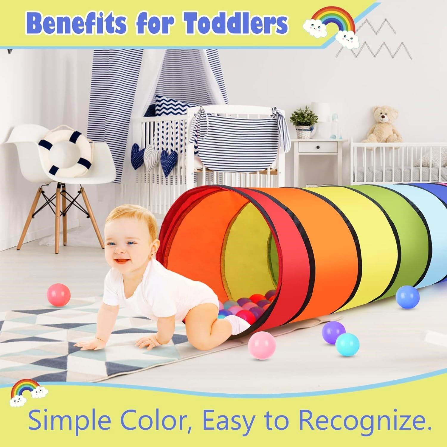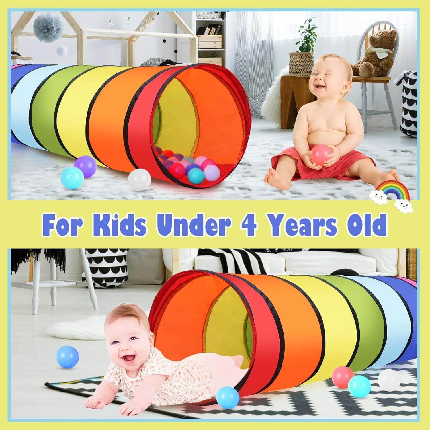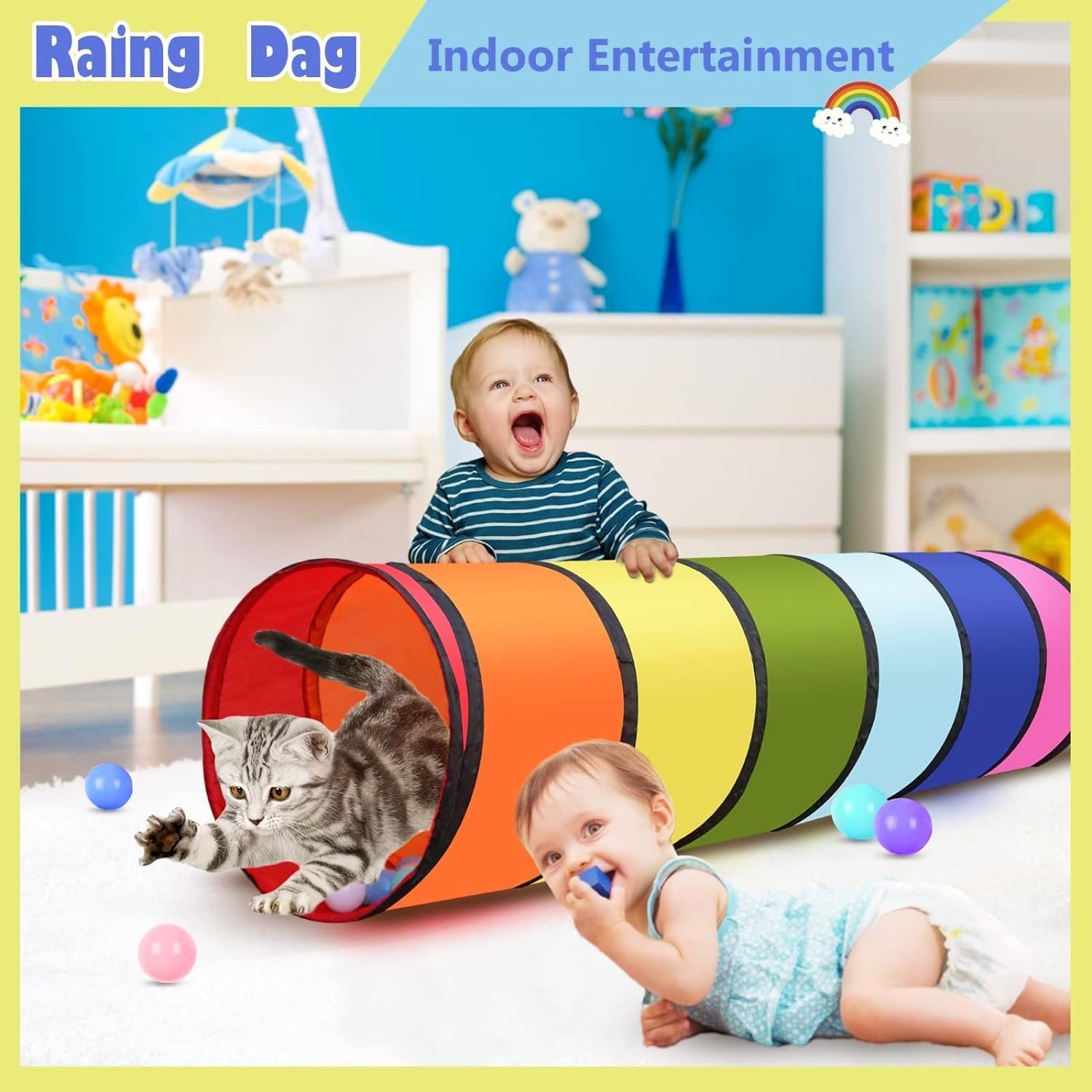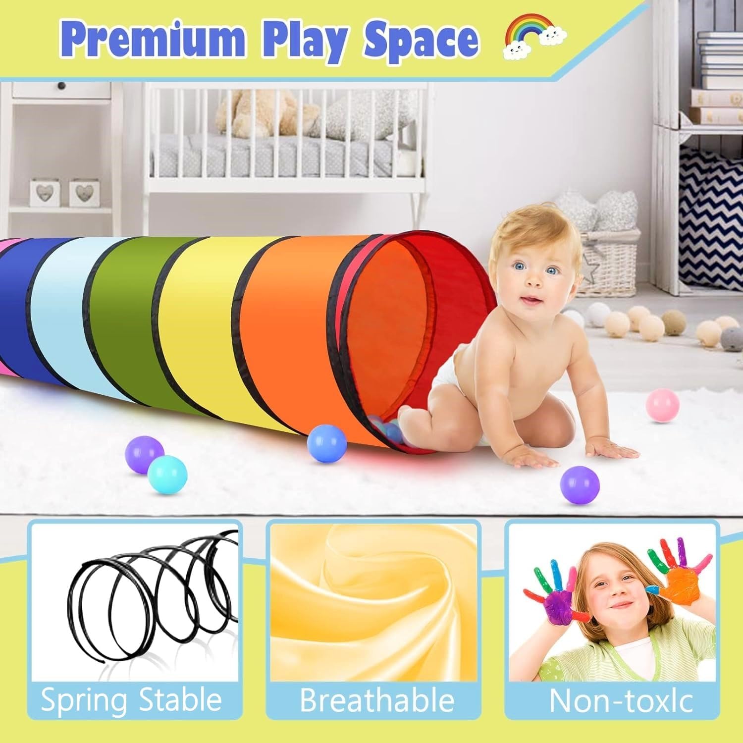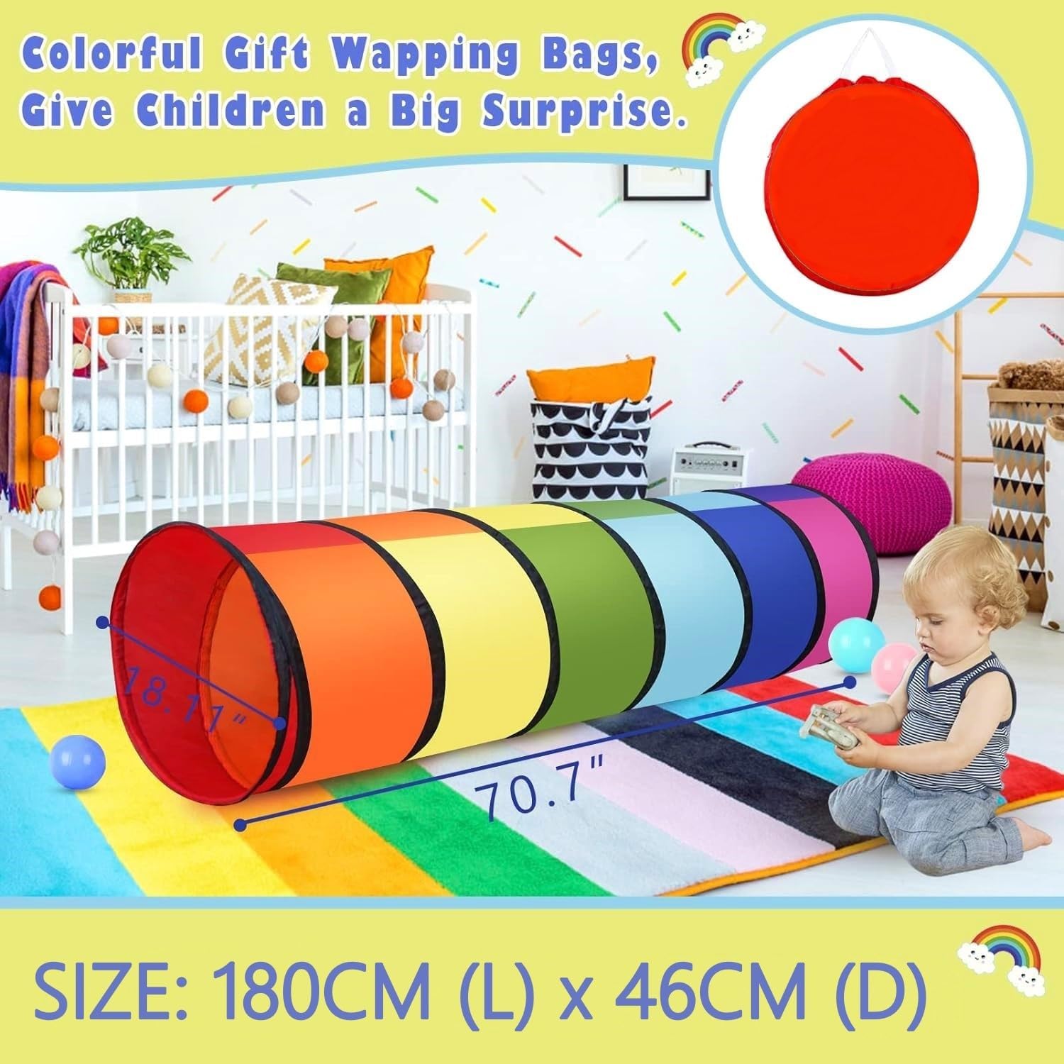 [Alta qualità] Realizzato in poliestere di alta qualità, morbido e confortevole, non facile da strappare e rompere, in linea con le linee guida sulla sicurezza dei giocattoli; All'estremità del filo viene aggiunto un cappuccio di gomma e il primo anello del tubo di gomma è sigillato per evitare che il filo penetri nel tessuto, sicuro per i bambini [Avventura nel tunnel] Può strisciare, inseguire, nascondersi e cercare nel tunnel di gioco color arcobaleno, non solo esercitare l'abilità fisica di gattonare del bambino, ma anche allenare la capacità di giudicare la direzione; Possono essere posizionati ostacoli sicuri come cuscini e giocattoli di peluche nella tenda, per creare il gioco della "perforazione del foro dell'ostacolo". [Facile da usare] Con un design pop-up, puoi ottenere una bellissima tenda a tunnel quando apri la borsa, senza bisogno di attrezzi; Viene fornito con una borsa leggera con cerniera per riporlo e trasferirlo facilmente (Nota: lasciare spazio quando si apre il tunnel della giungla per evitare di colpire il bambino quando spunta fuori) [Dimensioni] Lunghezza: 180 cm, diametro: 46 cm, il tunnel può essere piegato in molte forme interessanti per promuovere il gioco creativo o collegare la casetta all'aperto ad altri cubi da gioco o tende da gioco, scivoli per bambini, ecc.; Facile da pulire, può essere facilmente pulito con un panno umido e sapone neutro [Applicabile] Goditi il divertimento dei tunnel per bambini interni ed esterni! È il miglior regalo per ragazzi e ragazze di 3 anni o più, perfetto per l'asilo nido, la scuola materna, l'asilo o per giocare in attività indoor e outdoor come cortile, parco o parco giochi ecc. Adatto anche per animali domestici, gatti, cani, ecc.