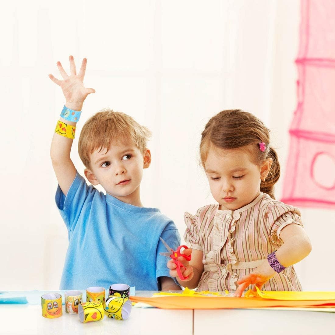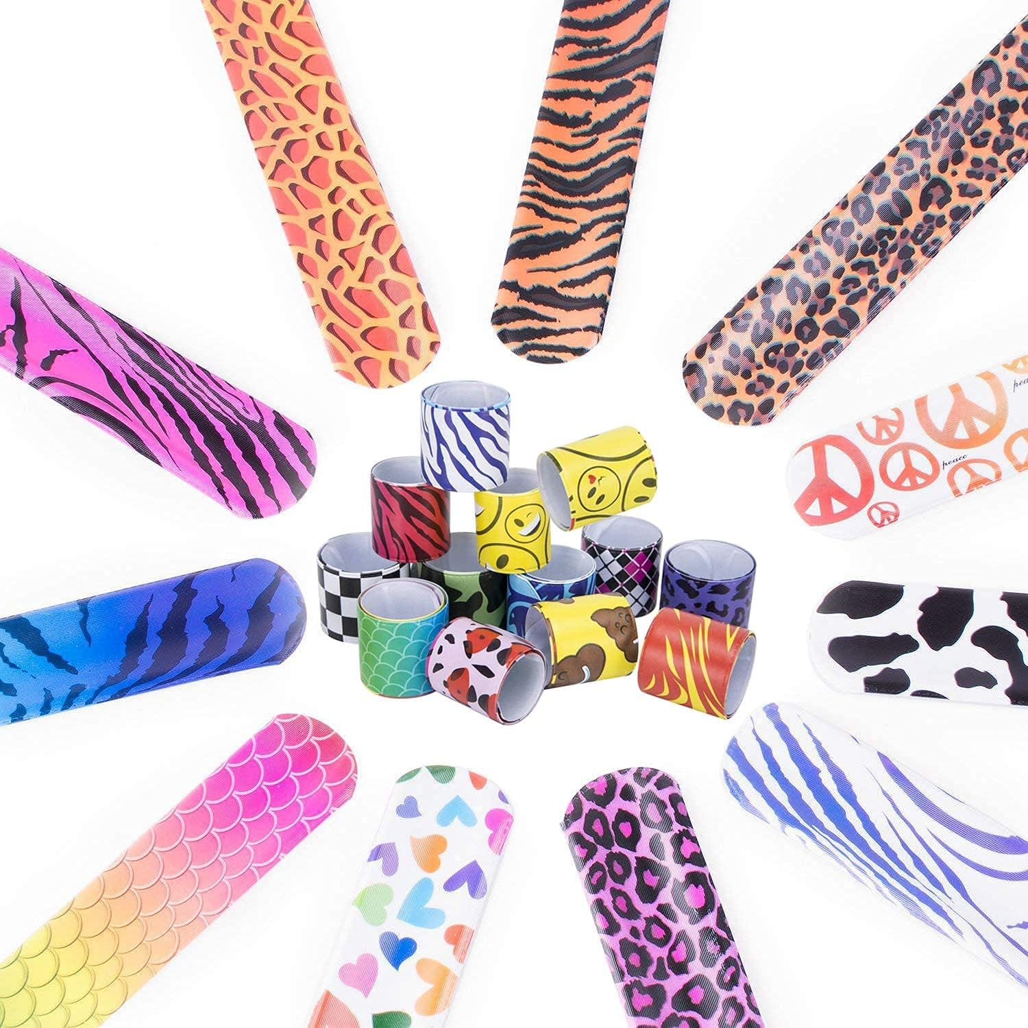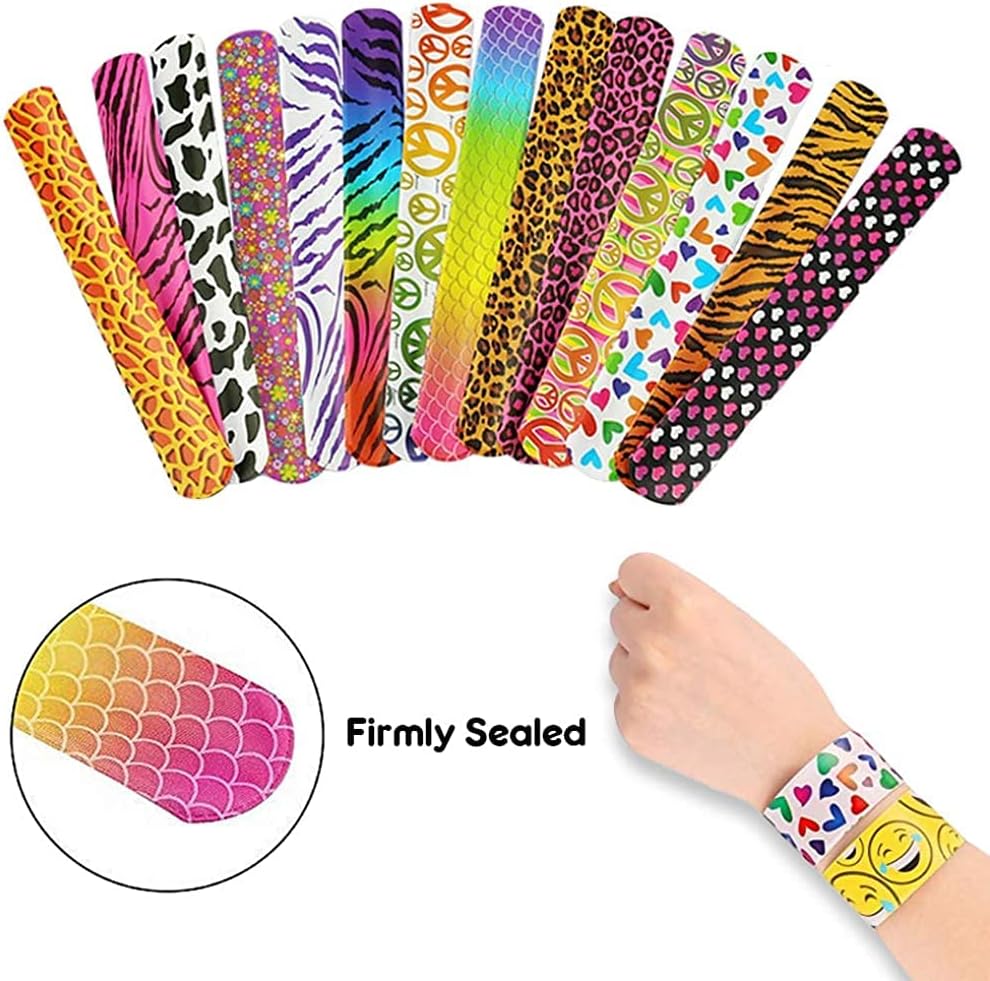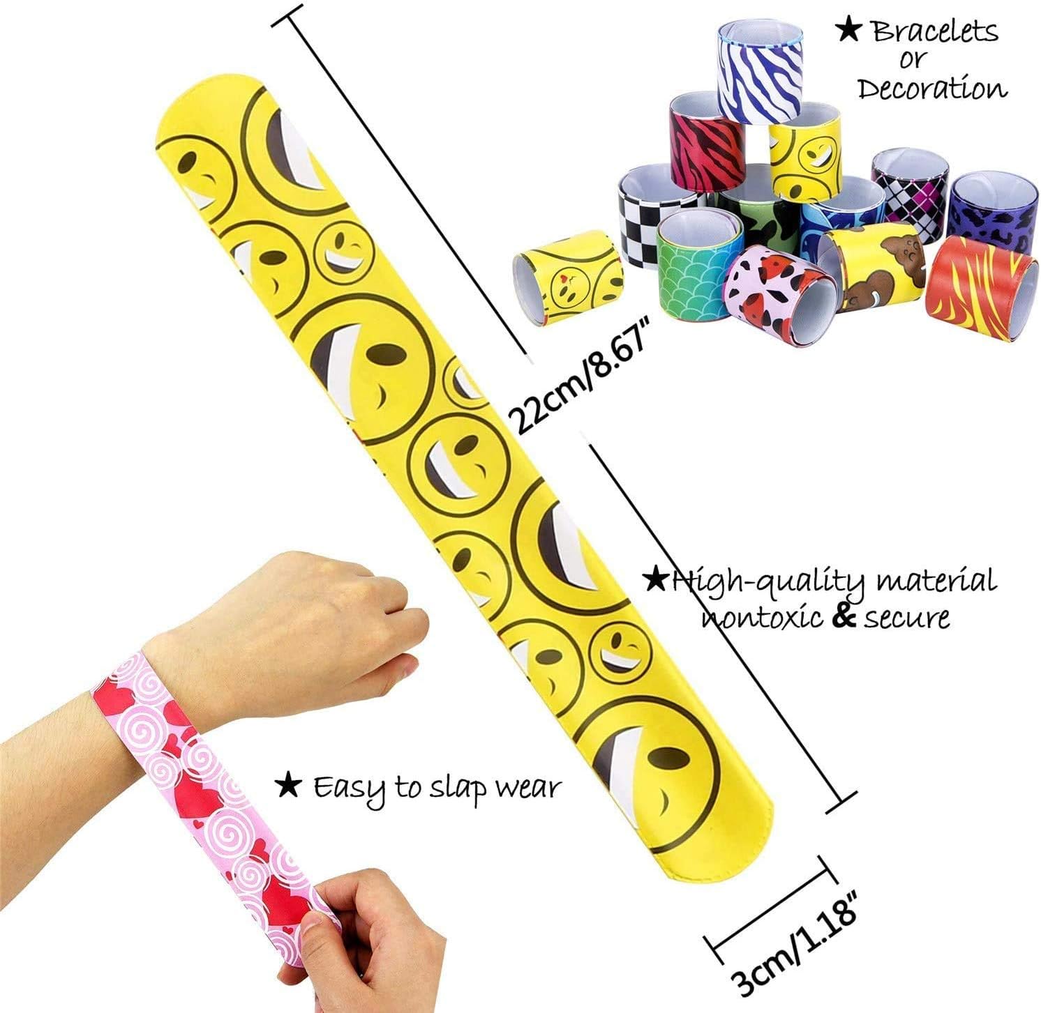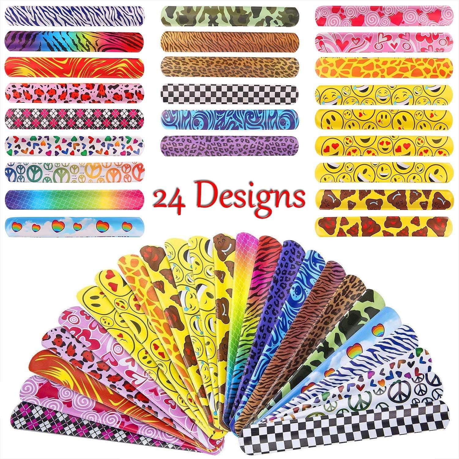 [Vari braccialetti slap] Contiene tre di ciascuno dei 24 colori e motivi e 28 colori e motivi in ordine casuale, inclusi emoji, cuori, segni di pesca e motivi geometrici, stampe animalier, stampe leopardate e altro ancora [Alta qualità] Realizzato in morbida ecopelle, atossica e insapore, comoda da indossare, molto delicata sulla pelle dei bambini. Il colore non cade facilmente. [Durevole] Nucleo interno di alta qualità, buona flessibilità, può essere piegato a qualsiasi angolazione per adattarsi al diverso spessore del polso. Durevole e duraturo, senza perdita di flessibilità [Facile da trasportare] Ogni dimensione della fascia schiaffo è: 22 x 3 cm, leggera e compatta, facile da trasportare, adatta per adulti e bambini, facile da regolare [Applicabile] Il giocattolo perfetto per le feste dei bambini!!! Ideale per bomboniere, riempitivi di piñata, regali di compleanno, premi di giochi, premi per studenti e sacchetti regalo. Un giocattolo classico divertente per tutte le età