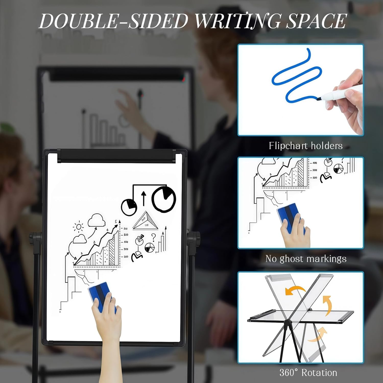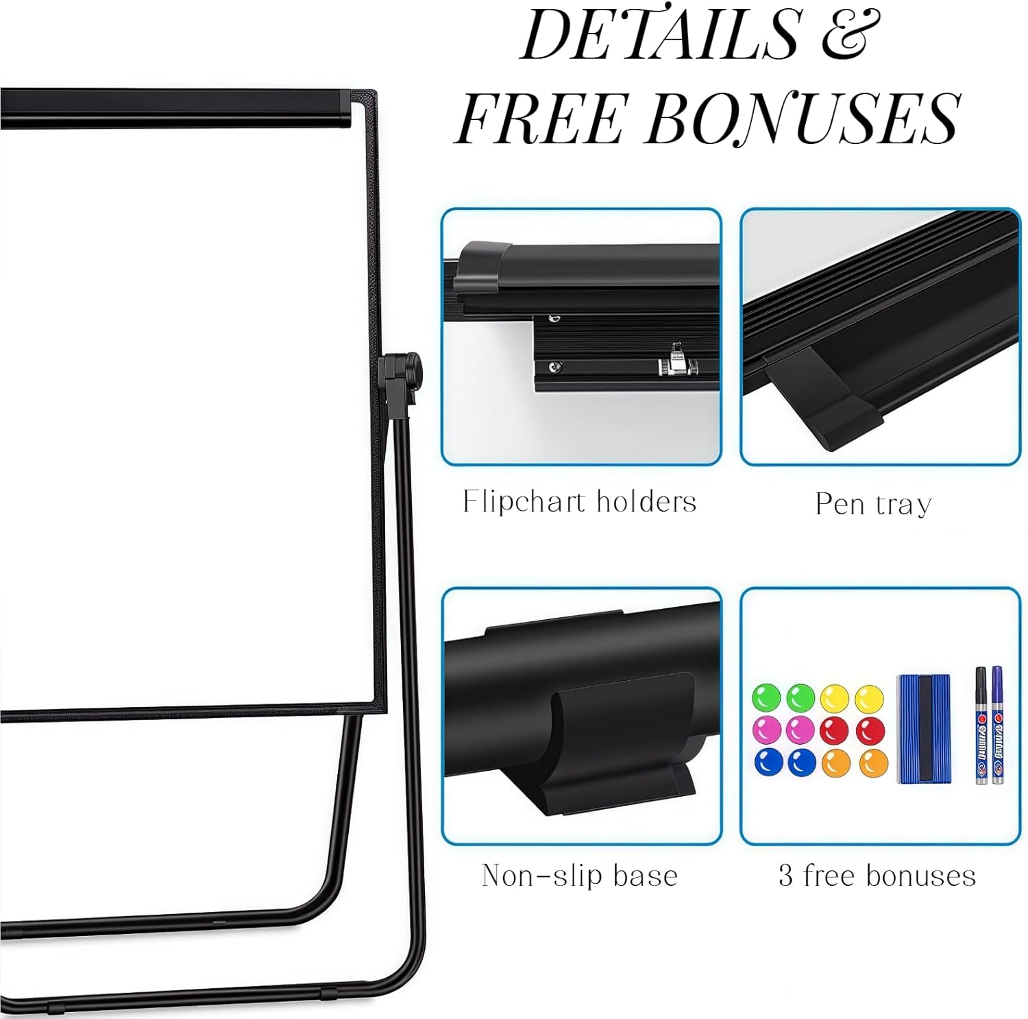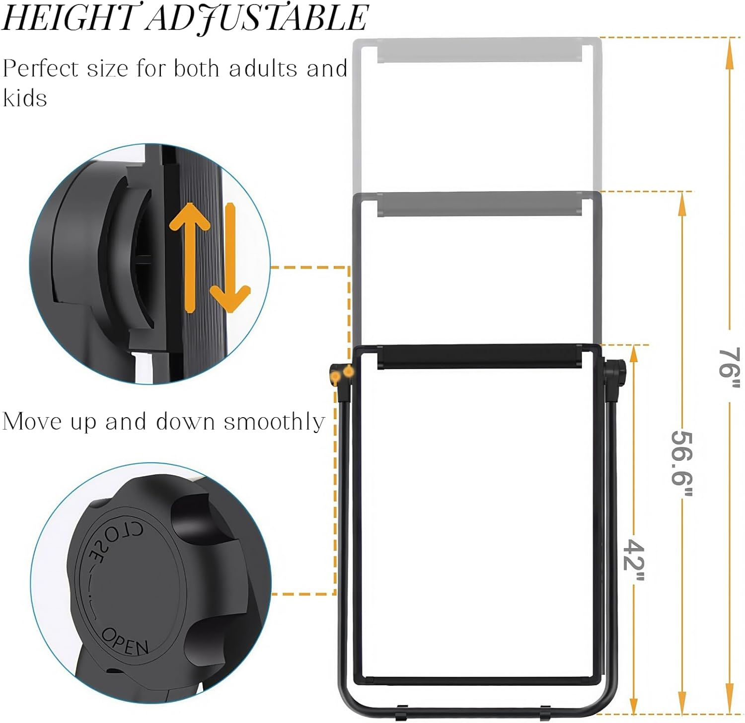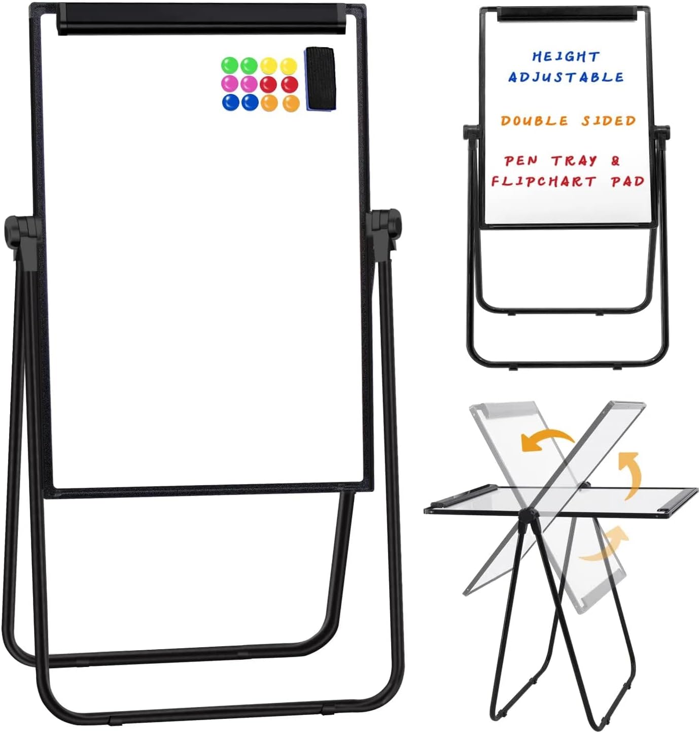 Design bifacciale: la lavagna bianca bifacciale non solo offre ampio spazio di scrittura, ma rende anche il prodotto multifunzionale. Un lato può essere utilizzato come espositore e l'altro come lavagna bianca per scrivere. Facile da usare: la lavagna bianca leggera e pieghevole è progettata per l'uso quotidiano su progetti in qualsiasi luogo. Il prodotto è dotato di un gancio per lavagna a fogli mobili e di un portapenne per la massima praticità. Altezza regolabile: questa lavagna bianca si regola facilmente e ruota di 360 gradi, in modo da poter scrivere o guardare all'angolazione e all'altezza migliori per bambini o adulti, seduti o in piedi. Struttura solida e robusta: questa lavagna bianca è composta da un telaio in lega di alluminio di alta qualità, clip e staffe in tubo di ferro, quindi la qualità è affidabile. Allo stesso tempo, il prodotto adotta una staffa a U e piedini in gomma rinforzata antiscivolo per garantire la stabilità della lavagna bianca a cavalletto all'esterno. Eccellente servizio post-vendita: miriamo a fornire prodotti e servizi di qualità. Risponderemo e risolveremo ogni problema il prima possibile.