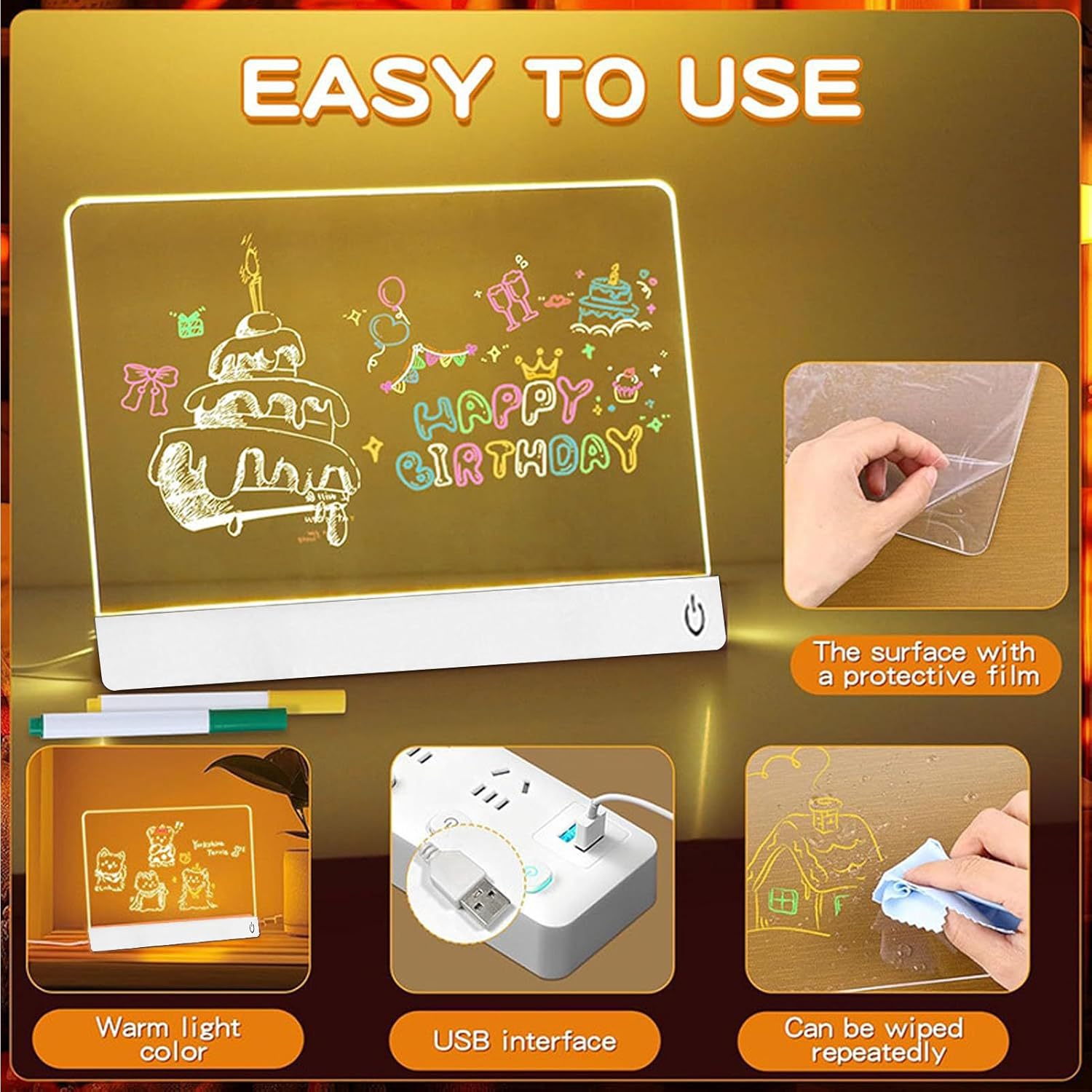 [Illuminazione RGB vibrante] La lavagna per appunti a LED presenta 7 brillanti opzioni di luce RGB e 4 modalità dinamiche: statica, saltante, lampeggiante e sbiadita, per rendere la tua esperienza di disegno divertente e coinvolgente. [Batteria a lunga durata] Dotato di una batteria ricaricabile ad alta capacità, questo tabellone luminoso può essere utilizzato senza fili fino a 5 ore, rendendolo adatto a feste e compleanni senza il fastidio dei cavi di alimentazione. [Kit di accessori completo] La bacheca luminosa viene fornita con tutto ciò di cui hai bisogno: 7 pennarelli vivaci, un espositore da tavolo, un panno per la pulizia, un cotone per la pulizia, un flacone spray e un gancio con catena per appenderlo. [Ampio spazio] Con un design spazioso di 11,8 pollici x 8 pollici, la lavagna cancellabile a secco in acrilico LED offre ampio spazio per disegnare. La sua superficie liscia rende la scrittura e la cancellazione un gioco da ragazzi. [Uso versatile] I bambini possono disegnare o imparare con questa bacheca LED, mentre gli adulti possono utilizzarla come blocco note o decorazione festiva. Adatto per segnaletica personalizzata, feste o per aggiungere una luce calda a qualsiasi stanza.