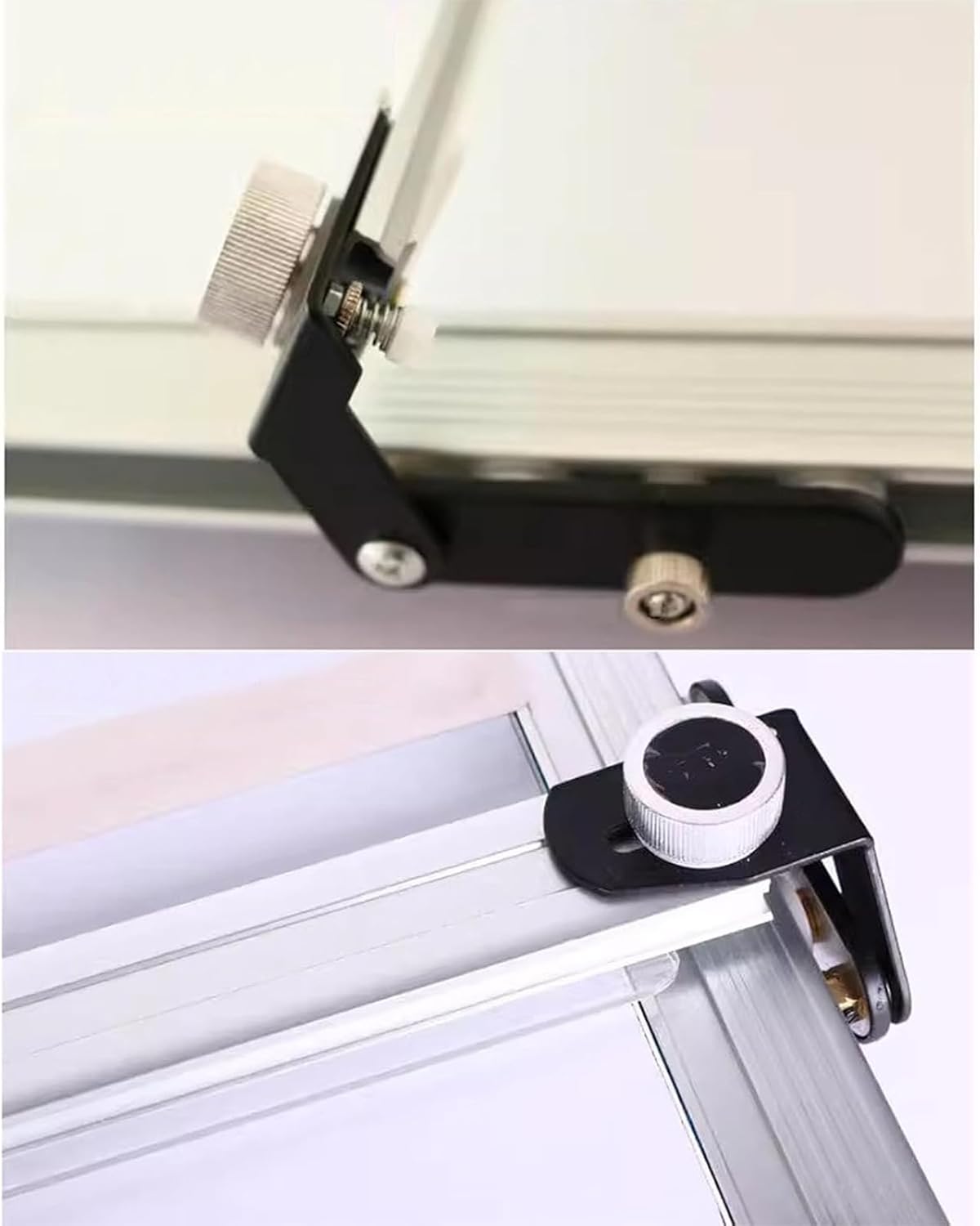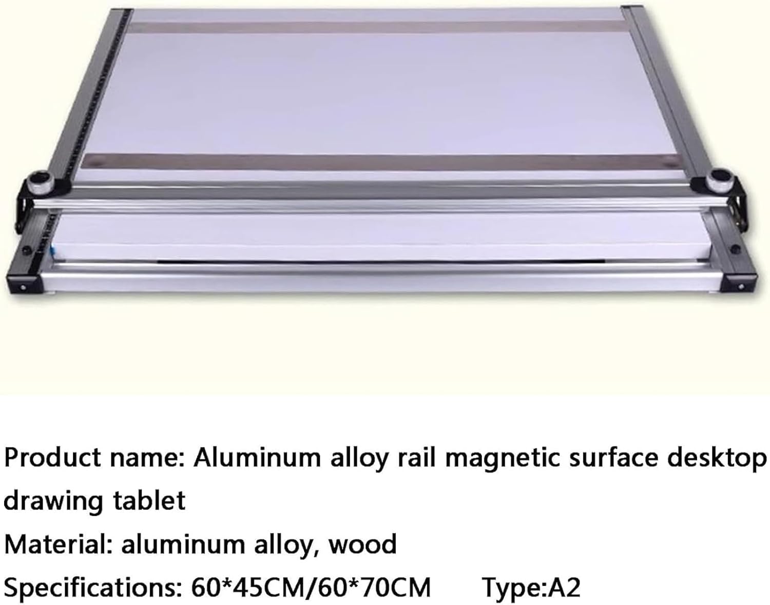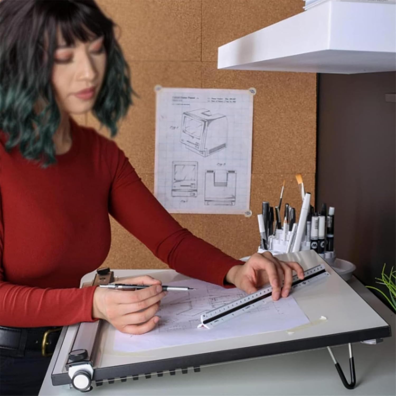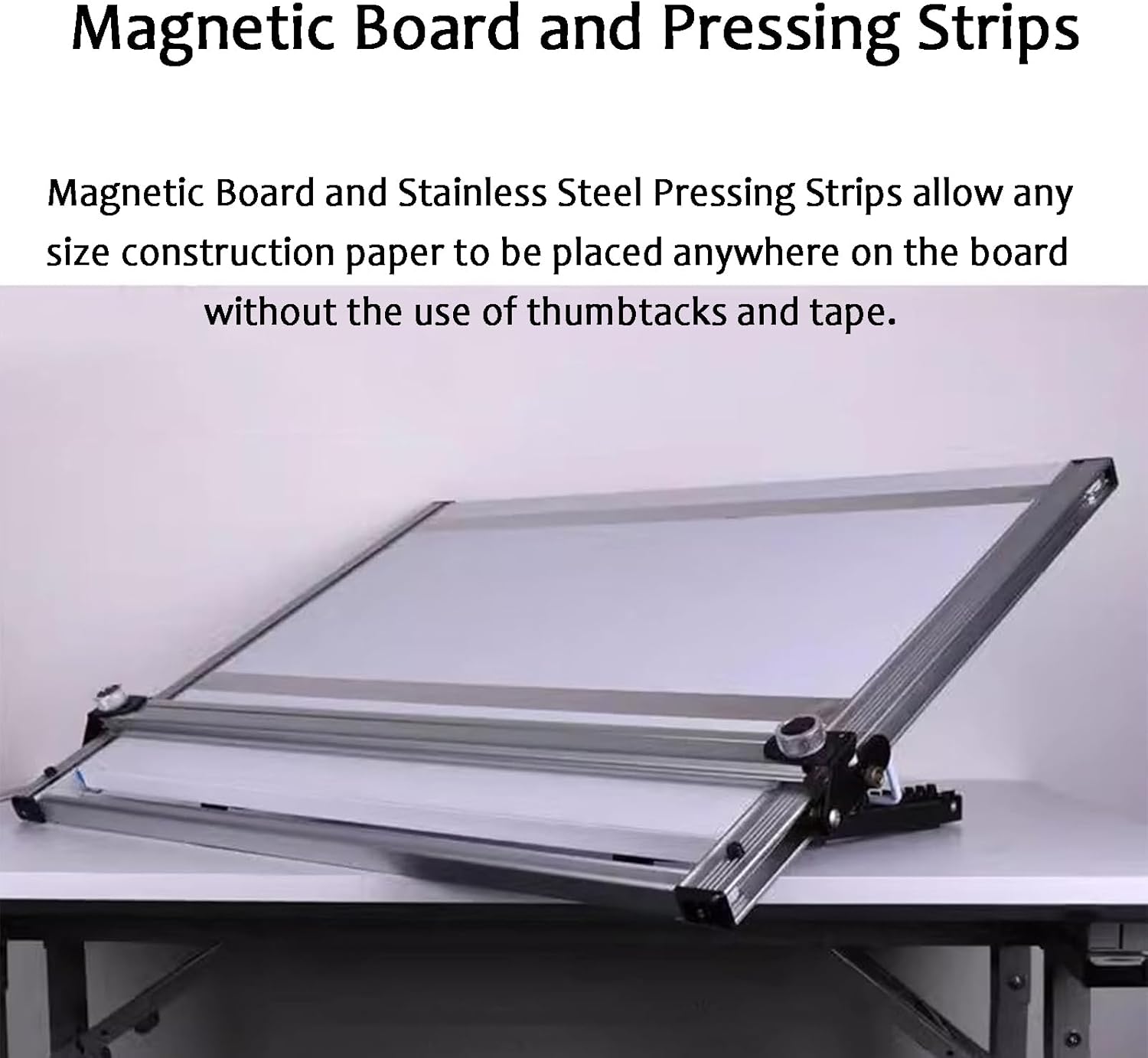 Strumenti di misurazione di precisione: il tavolo da disegno A2 presenta un righello scorrevole trasparente contrassegnato in pollici, insieme a lunghe guide con linee equidistanti, consentendo agli artisti di liberare la loro creatività su progetti più complessi e su larga scala con facilità. Regolazione ergonomica: con un meccanismo ad angolo regolabile a 6 livelli, questo tavolo da disegno consente agli utenti di modificare l'inclinazione in base al loro comfort, riducendo significativamente l'affaticamento del collo e delle braccia, migliorando così l'efficienza e il comfort del disegno. Meccanismo di bloccaggio sicuro: dotato di una manopola di controllo sul lato sinistro, questa tavola consente al righello di essere fissato saldamente in qualsiasi posizione mediante una semplice rotazione, facilitando il disegno di figure geometriche speciali senza scivolare. Sistema di fissaggio magnetico: l'inclusione di piastre magnetiche e strisce in acciaio inossidabile assicura che la carta da disegno di qualsiasi dimensione rimanga saldamente in posizione ovunque sulla lavagna, eliminando la necessità di puntine o nastro adesivo per una superficie di disegno più pulita e precisa. Applicazione versatile: progettato per architetti, disegnatori, artisti e ingegneri, questo tavolo da disegno portatile è ideale per una varietà di impostazioni, tra cui schizzi all'aperto, lezioni di pittura interna e studi di design, rendendolo uno strumento versatile per professionisti creativi.