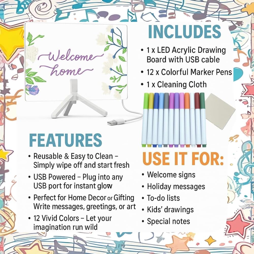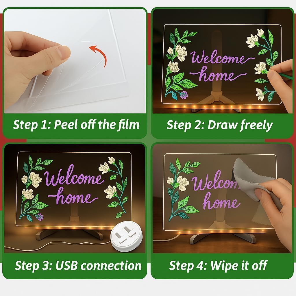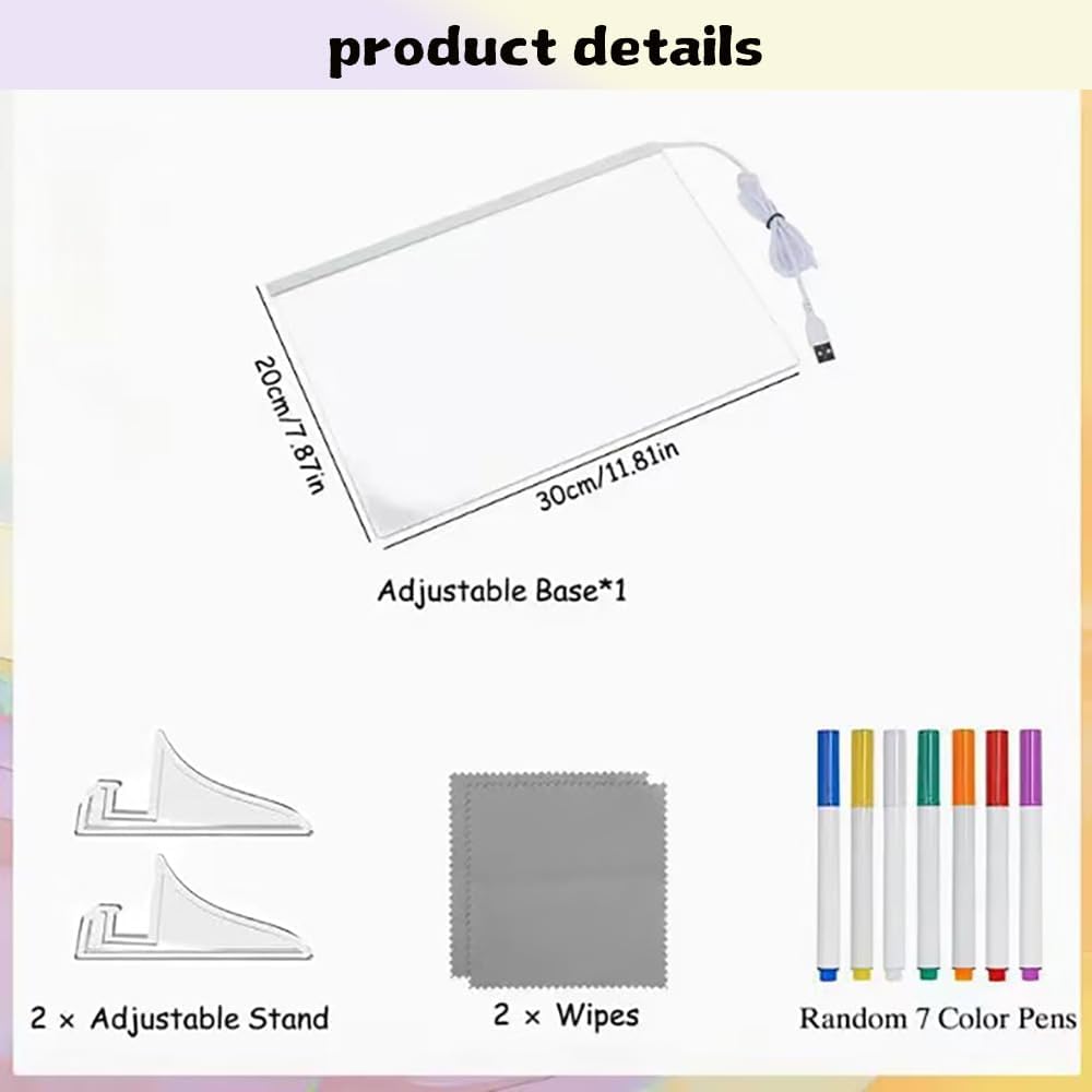 Brillante illuminazione a LED: l'illuminazione soffusa integrata rende ogni messaggio, promemoria o opera d'arte spicca magnificamente, trasformando le tue note in display accattivanti perfetti per ambienti con scarsa illuminazione. Esperienza di scrittura e disegno definitiva: include 12 penne dai colori vivaci per note espressive - prendere e disegnare schizzi creativi sulla superficie acrilica liscia di alta qualità che aggiunge un po 'd'acqua e si cancella in modo pulito senza residui. Design salvaspazio: dimensioni compatte 30 x 20 cm con supporto regolabile si adatta perfettamente a qualsiasi scrivania, bancone o parete aggiungendo un tocco decorativo moderno al tuo spazio. Messaggio multifunzionale ampio: ideale come strumento di produttività per uffici, lavagna di comunicazione per case, tela creativa per bambini o display promozionale per caffè - con funzionamento ecologico riutilizzabile. Regalo perfetto: accuratamente confezionato con tutti gli accessori inclusi, questa lavagna illuminata è un regalo unico e pratico per bambini, studenti, professionisti, coppie e creativi per ogni occasione
