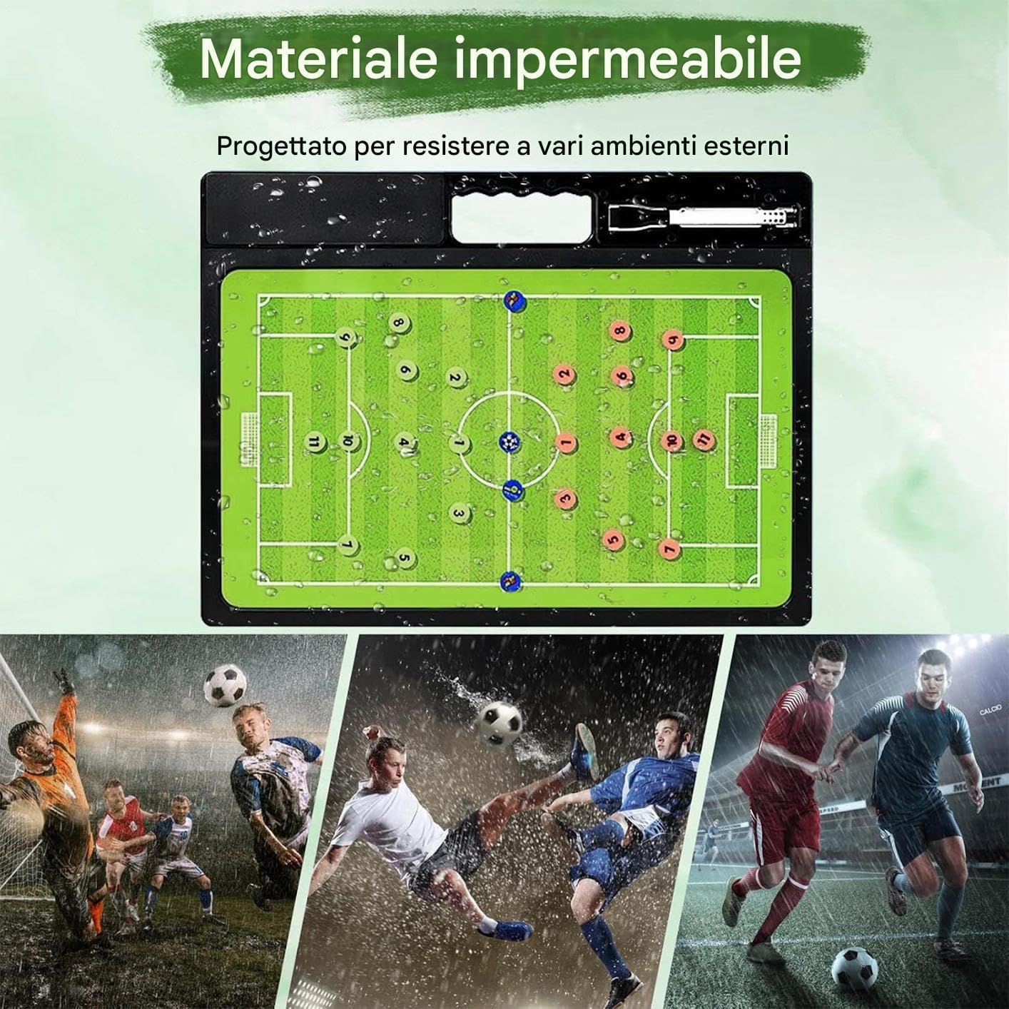 Design Organizzato: Caratterizzata da linee luminose di facile lettura, la lavagna da calcio garantisce una scrittura scorrevole e e potenzia la chiarezza 'apprendimento mantenendo una superficie ordinata durante le modifiche, permettendo agli allenatori di concentrarsi sullo sviluppo a con strumenti intuitivi e una cancellatura senza residui per un uso ripetuto. Pianificatore di Gioco Magnetico: Progettato per la praticità, il tavolo da calcio combina un di marcatori magnetici e strumenti user-friendly come penne scanalate, rendendo facile organizzare formazioni e posizioni per un coaching in qualsiasi contesto sportivo, con una gestione intuitiva e senza sforzo. Affidabilità Tutto : La lavagna per allenamento calcio vanta un design resistente a sudore e pioggia, fornendo un'utilità affidabile stagione dopo stagione; la struttura regge un uso giornaliero rigoroso, e l'esterno facile da pulire assicura visualizzazioni chiare, essenziale per la pianificazione tattica durante gli allenamenti, con performance durevoli in ambienti esterni e condizioni climatiche variabili per un supporto costante al training calcistico. Efficienza nel Coaching: Abilitando configurazioni dettagliate e formazioni e un tracciamento fluido e sostituzioni, la lavagna magnetica per calcio migliora l'efficienza degli allenatori e la preparazione a . Assicura che i team siano pronti per partite competitive e drill di allenamento produttivi, ottimizzando la pianificazione tattica e la gestione e risorse. La sua praticità d'uso lo rende adatto a vari scenari, aiutando a visualizzare e adattare le strategie in modo Monitoraggio Movimenti Strategici: Questa lavagna magnetica per calcio include diagrammi doppi campo che mostrano chiaramente le rotte dei giocatori, consentendo agli allenatori di insegnare strategie di posizionamento mentre supporta la pianificazione per campo intero e mezzo campo. Il tracking visivo dei movimenti aiuta a ottimizzare le formazioni e le tattiche durante gli allenamenti, offrendo una visione dettagliata e traiettorie che migliora l'efficacia 'insegnamento per squadre di