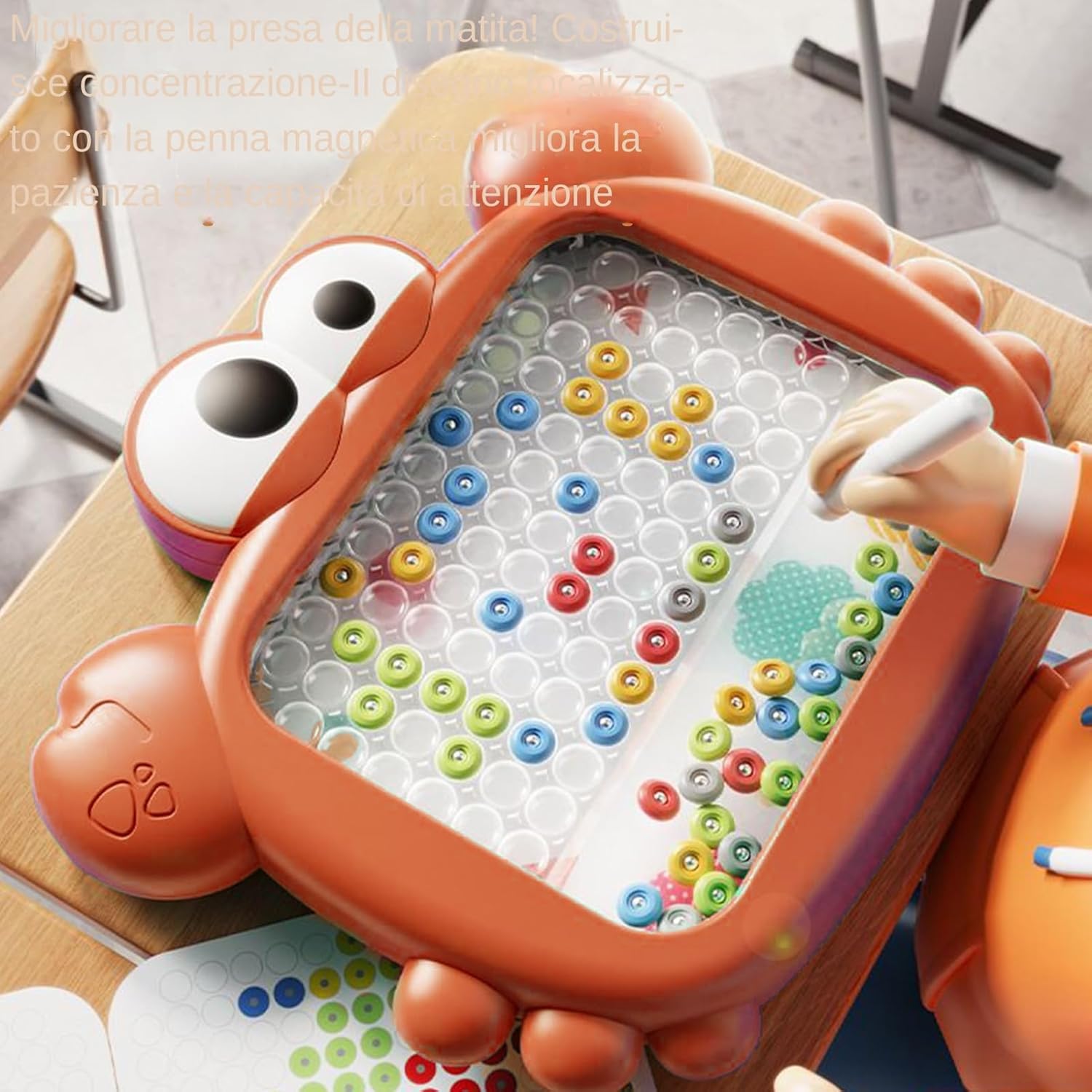 Preso comodo migliorato: La lavagna magnetica offre un'esperienza di presa ergonomica con bordi arrotondati lisci, incoraggiando l'esplorazione creativa grazie ai vivaci colori brillanti e al design a tema animaletto per un appeal aggiuntivo Risorsa didattica dinamica: Stimola l'esplorazione di forme, colori e modelli, insieme ad attività di abbinamento numerico, per affinare le tecniche di ordinamento cromatico e rafforzare la coordinazione mano-cervello attraverso un gioco interattivo e coinvolgente Ampio Spazio da Disegno: Offrendo 89 caselle per disegnare, questa lavagna garantisce una tela spaziosa per ispirazione artistica, promuovendo più gioco e la capacità di formare design dettagliati in modo seamless e piacevole Organizzazione Senza Sforzo: Progettato con un vano di riporlo incorporato, organizza i giocattoli in modo efficiente, conserva la penna magnetica in sicurezza, incoraggia l'abitudine all'ordine e riduce al minimo il rischio di smarrire i componenti, ideale per una gestione ordinata. Sollevamento perlina sicuro: I magneti interni resistenti forniscono una sicurezza costante delle perline, incoraggiando lo sviluppo delle abilità e consentendo espressione artistica senza interruzioni per un impegno creativo prolungato