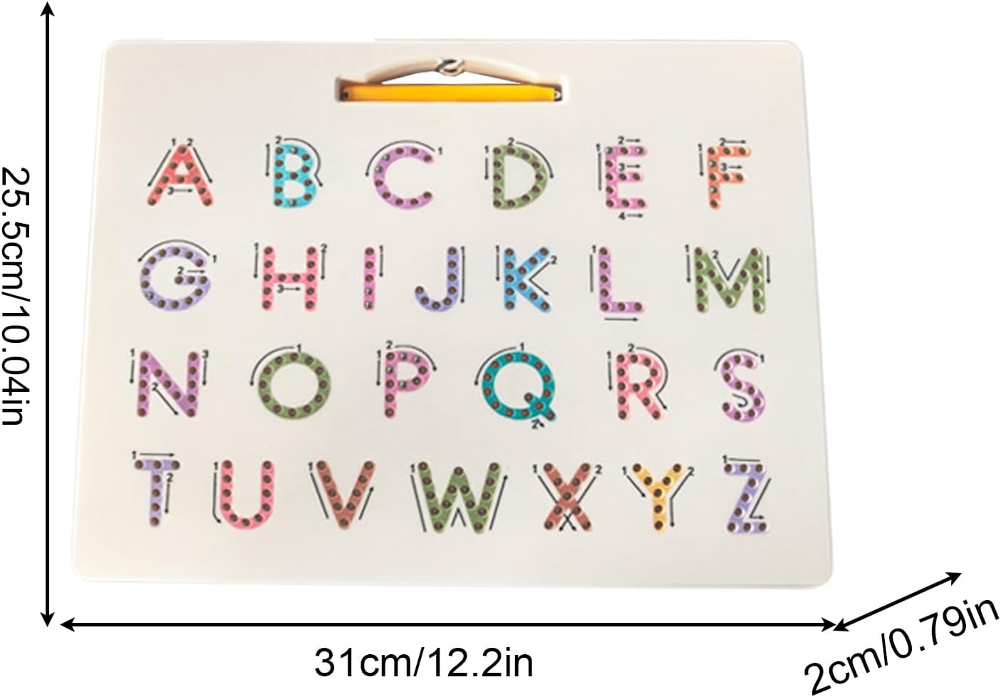 Esperienza Apprendimento Giocoso: Integra magneti con esercizi di tracciamento per creare un'esperienza didattica divertente, incoraggiando l'esplorazione attiva e trasformando l'educazione in un'attività coinvolgente. Design Innovativo: La struttura a doppia faccia promuove una migliore pratica di scrittura guidando i bambini nella corretta formazione delle lettere. La penna magnetica inclusa sviluppa la memoria muscolare attraverso l'uso ripetitivo, supportando un costante nelle abilità di scrittura. Riporlo Comodo Penna: Penna magnetica sempre attaccata alla lavagna, incentiva la pratica e offre accessibilità senza sforzo durante l'uso o quando si riporla. Regalo per Progressi:Fonde divertimento e funzionalità per incoraggiare la crescita cognitiva, eccellente opzione regalo per bambini che progrediscono nelle tappe di apprendimento. Sicurezza Ottimale: Bordi arrotondati e materiali resilienti proteggono le mani dei bambini, mantenendo la forma perfetta della lavagna magnetica nonostante l'uso continuativo nel .
