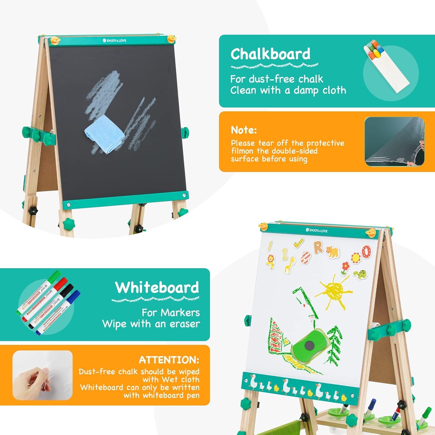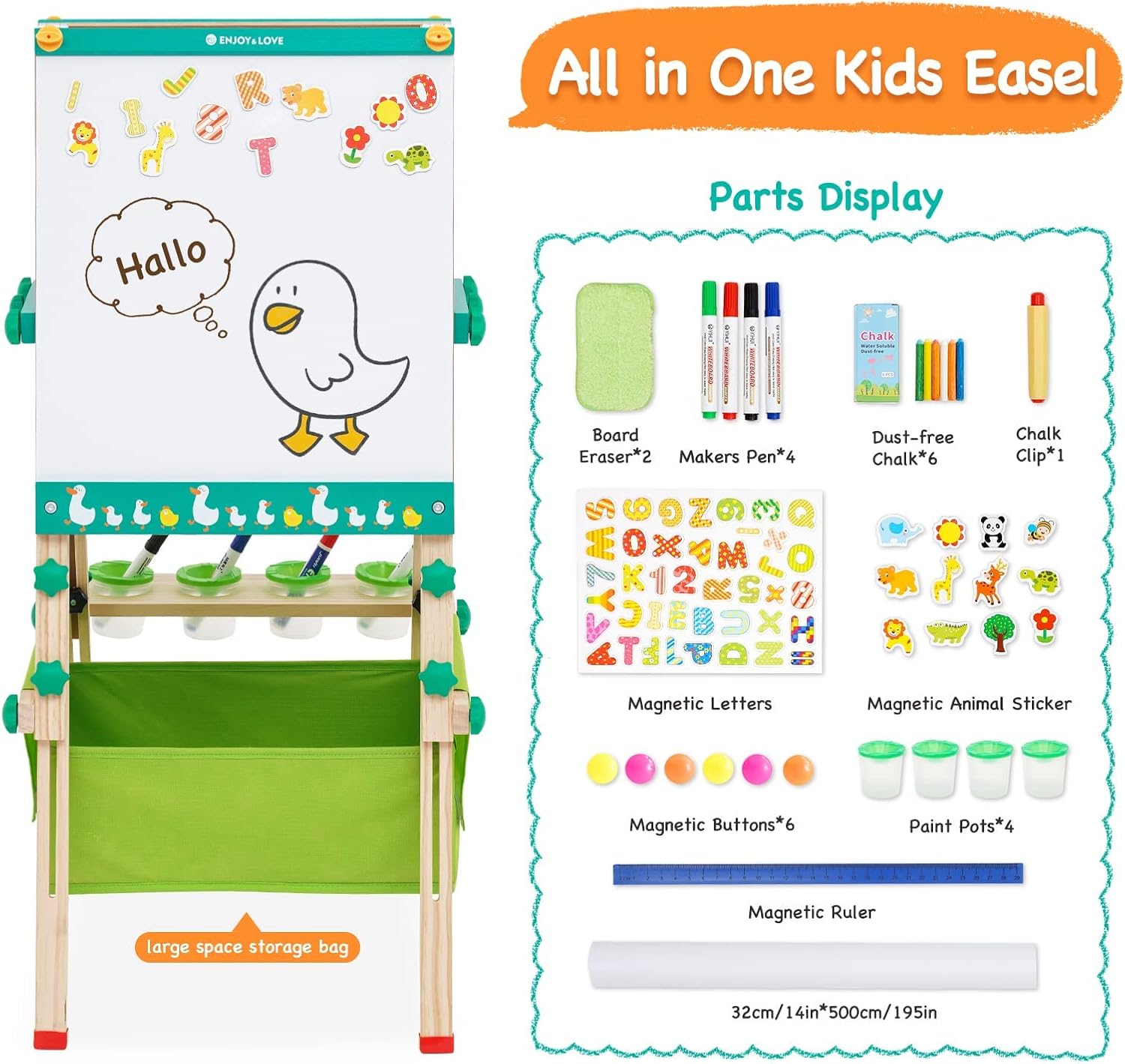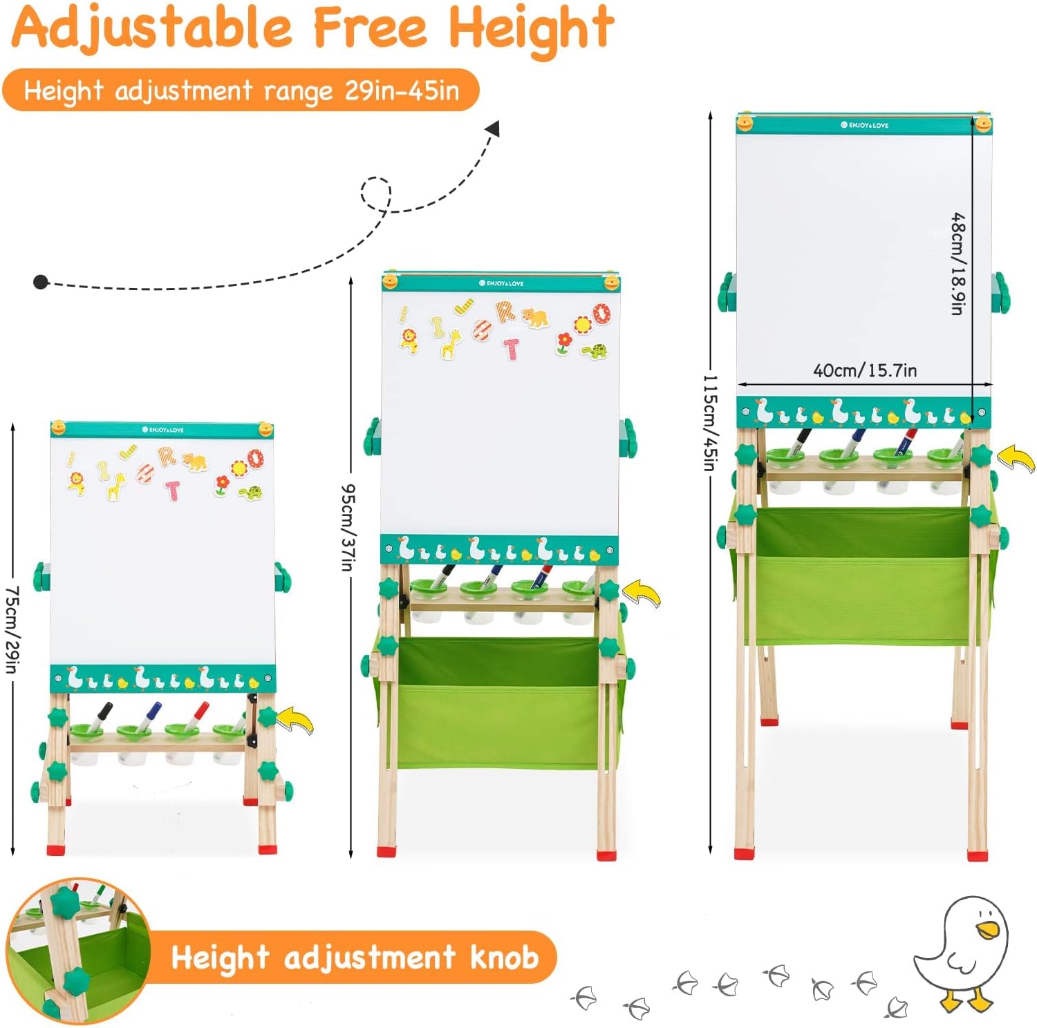 【LAVAGNE A DOPPIA FACCIA】Questo popolare cavalletto artistico multifunzionale a doppia faccia per bambini stimola l'immaginazione e la creatività e aiuta anche i bambini a esprimere idee attraverso la pittura, gli schizzi, gli scarabocchi, ecc.; la carta da disegno integrata (195 pollici) è più favorevole per risparmiare carta ed evitare di sprecare troppa carta quando i bambini disegnano 【FACILE DA ASSEMBLARE】Dotato di un robusto telaio in legno, questo cavalletto è facile da montare, si piega per riporlo ed è regolabile in altezza. Nella confezione del prodotto sono presenti le istruzioni. È possibile installare seguendo le istruzioni o fare riferimento al video di installazione e montaggio sul sito web 【ALTEZZA REGOLABILE】Man mano che l'altezza del bambino cambia, il cavalletto può essere regolato a diverse altezze. L'intervallo di altezza regolabile del cavalletto è 74-124 cm 【ACCESSORI RICCHI】 il tavolo da disegno è composto da accessori di lusso, carta da 195 pollici, 1 grande scatola portaoggetti, 4 bicchieri portaoggetti, 1 set di set di lettere colorate e set di matematica, 6 fibbie, 6 adesivi per cartoni animati, 4 pennarelli, gomme e così via 【MATERIALE SICURO PER I BAMBINI 】Questo cavalletto da arte per bambini è realizzato in legno di alta qualità, con una superficie liscia e senza sbavature, che è naturale ed ecologico. Viene fornito con copripiedi antiscivolo stabili e sicuri per il tuo bambino 【Promemoria caldo】 strappare la pellicola protettiva prima dell'uso