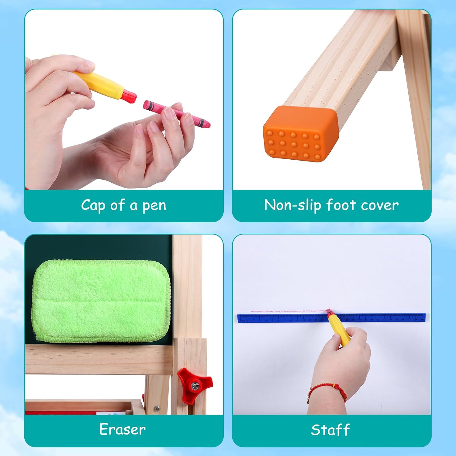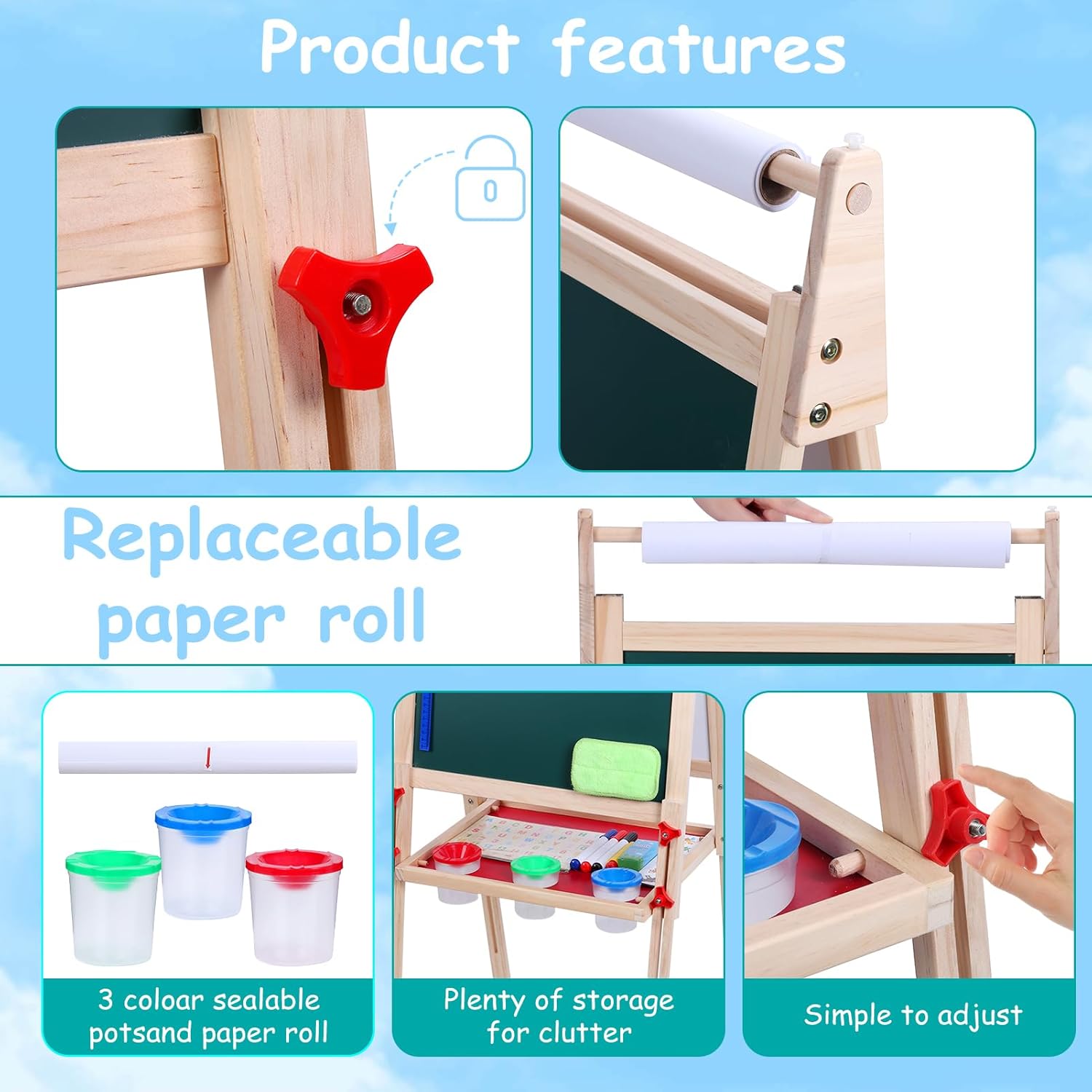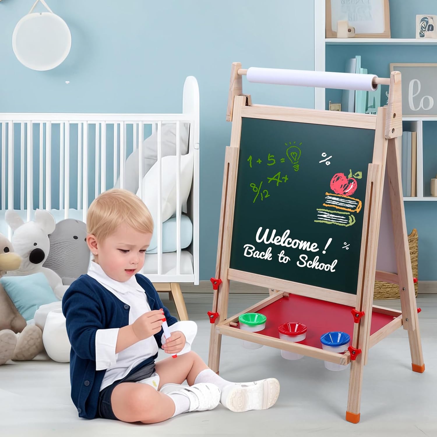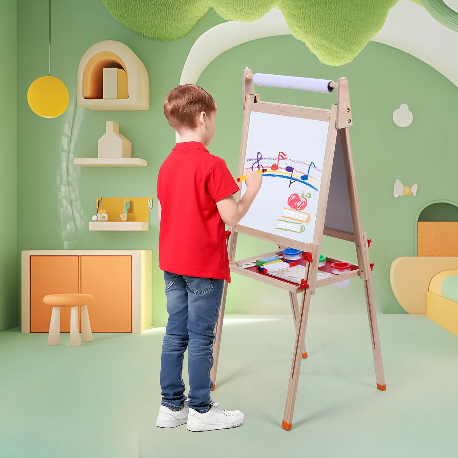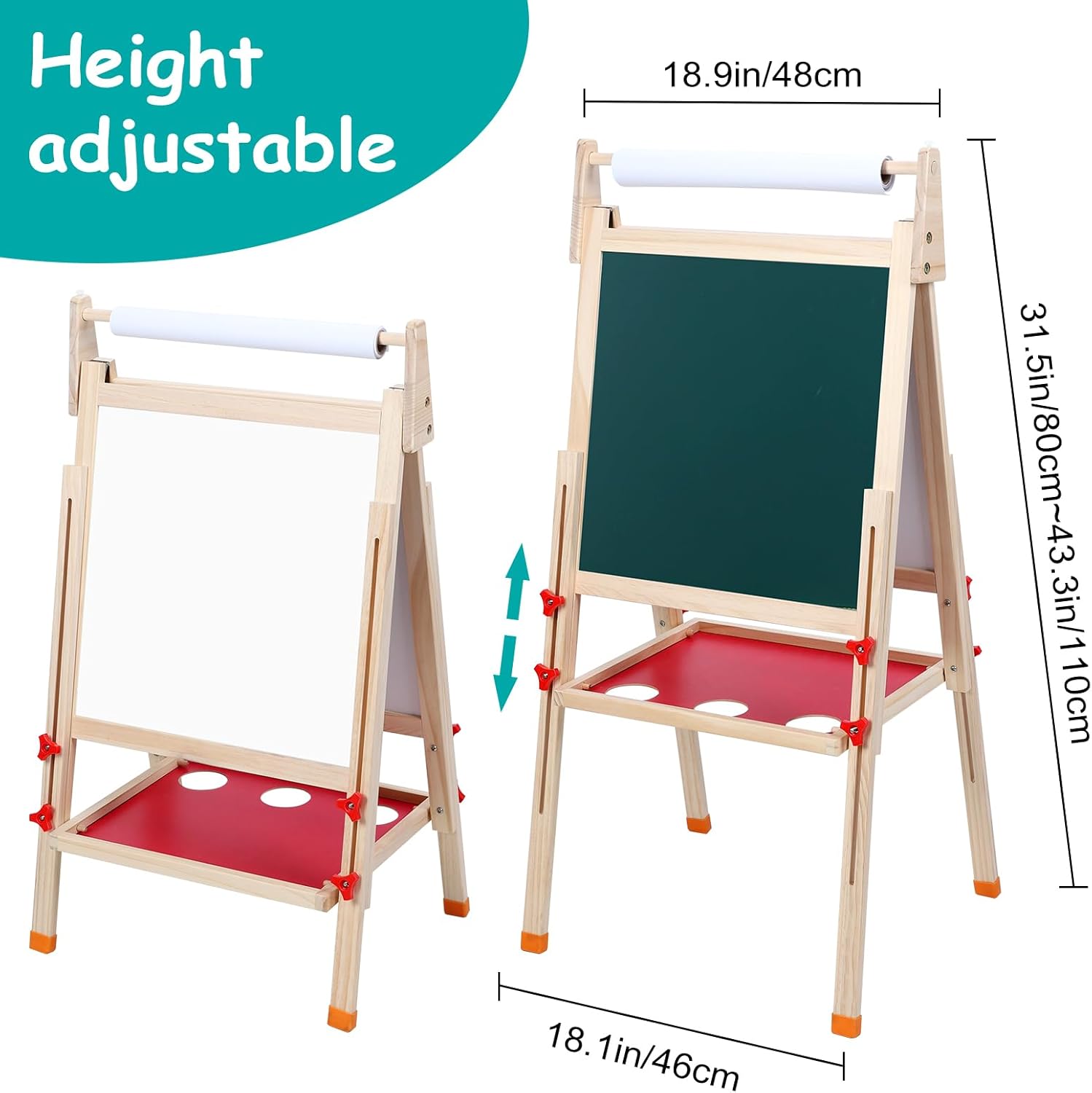 Design stimolante per la creatività: questo cavalletto ispira ore a dipingere, disegnare, scrivere e giocare di matematica: una combinazione perfetta di divertimento e istruzione per bambini e lavagna da disegno per bambini Lavagna da disegno double face: con lavagna bianca + lavagna (con funzione magnetica per bambini) e pratico vassoio rotante per penne, gesso e rotolo di carta. La clip integrata mantiene il blocco da disegno formato A3 scuola elementare al sicuro Materiale in legno sicuro: realizzato in legno di alta qualità (testato contro le sostanze nocive secondo gli standard internazionali) per giocare senza rischi. Ideale come lavagna per motilità o per pittura Regolabile in altezza (80-110 cm). Cresce con! Si adatta dalla lavagna per bambini di 2 anni al tavolo da disegno per bambini di 12 anni. Dimensioni telaio: 48 x 46 x 110 cm, per uso interno ed esterno Flessibile per l'età: perfetto per bambini (2-4 anni) e scolari (4-12 J). Include rotolo di carta per pittura e spazio per il set da colorare per bambini. Stimolare le capacità motorie attraverso l'esperienza su entrambi i lati