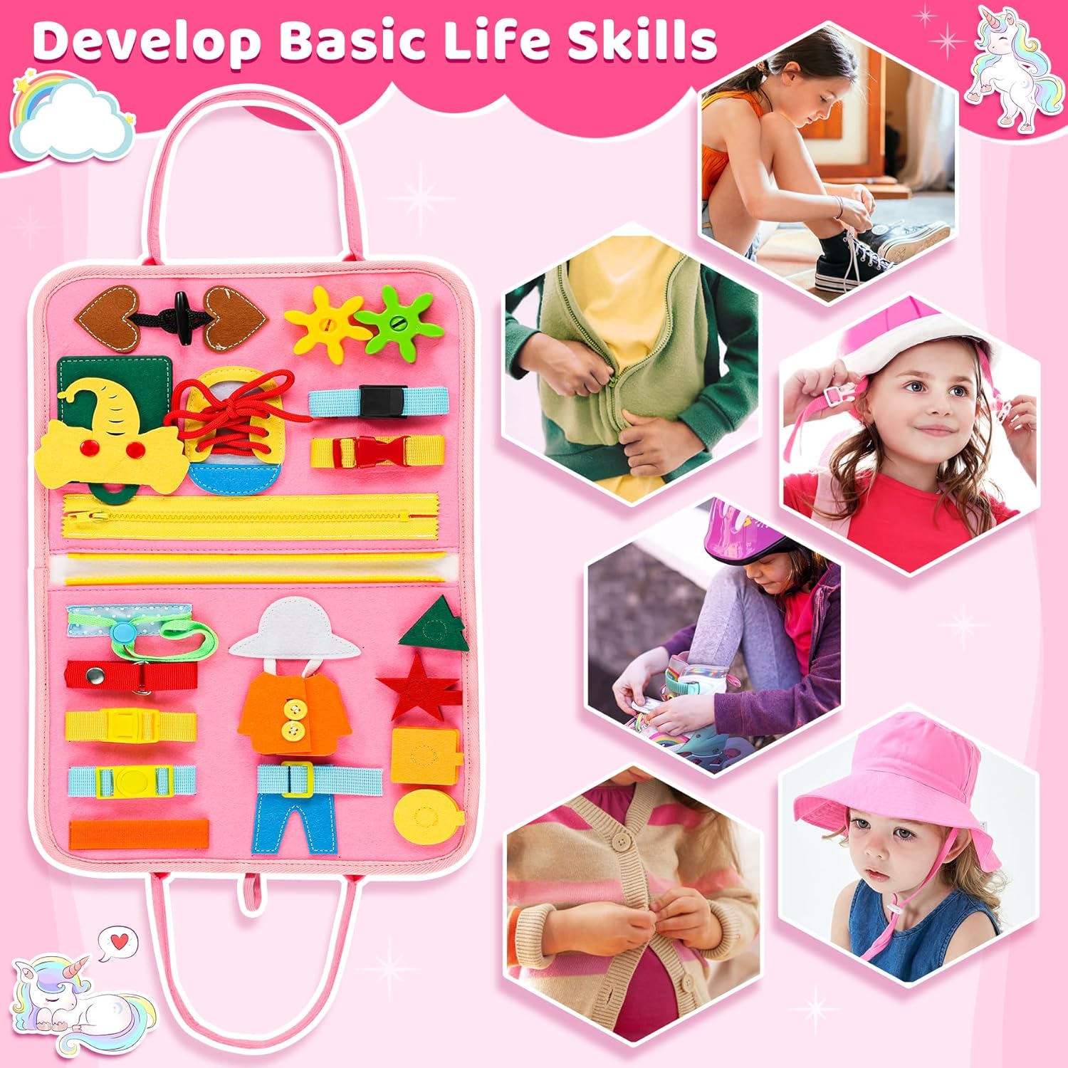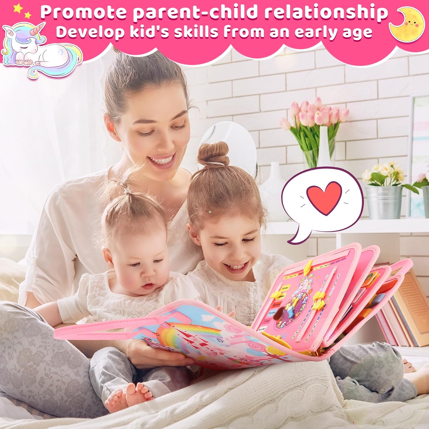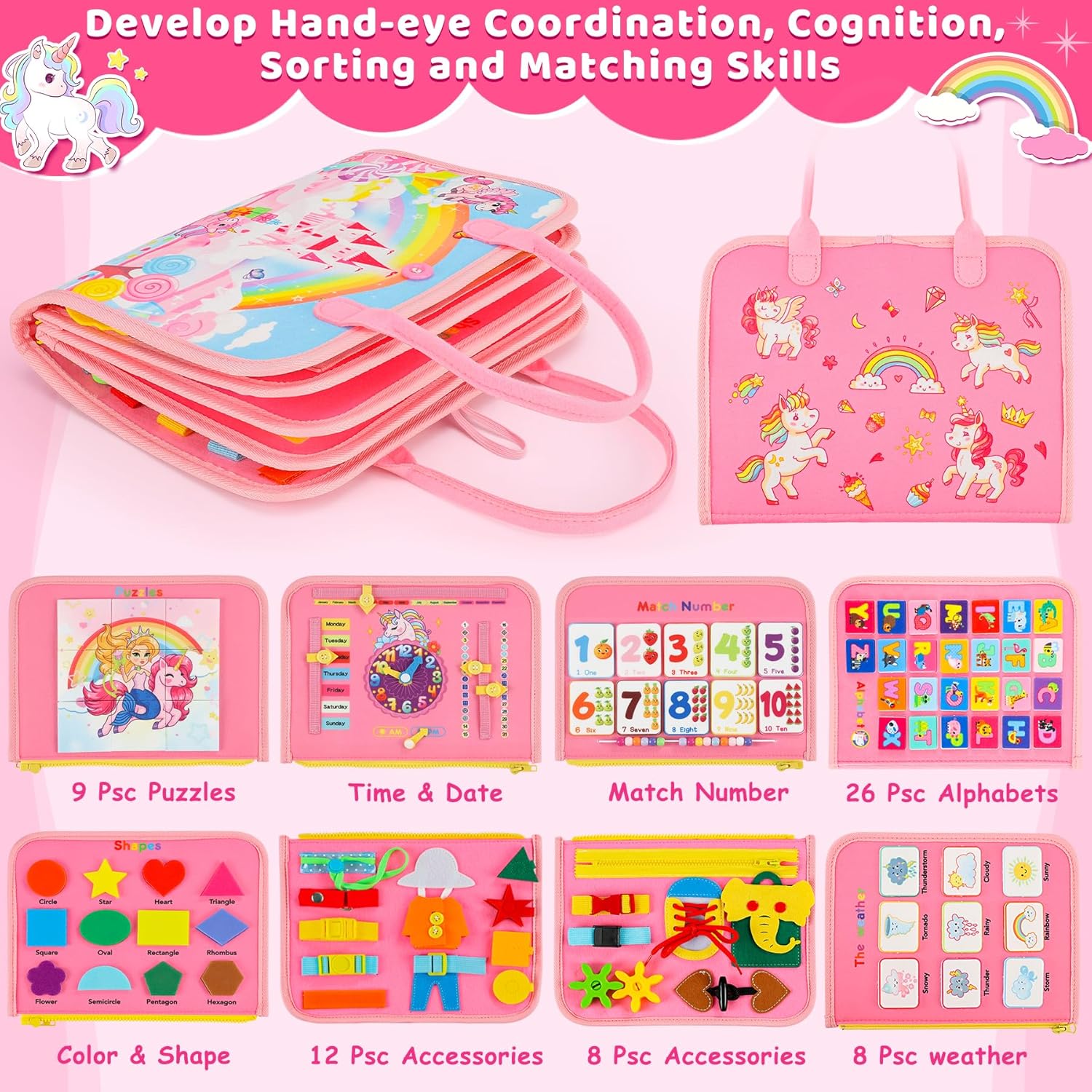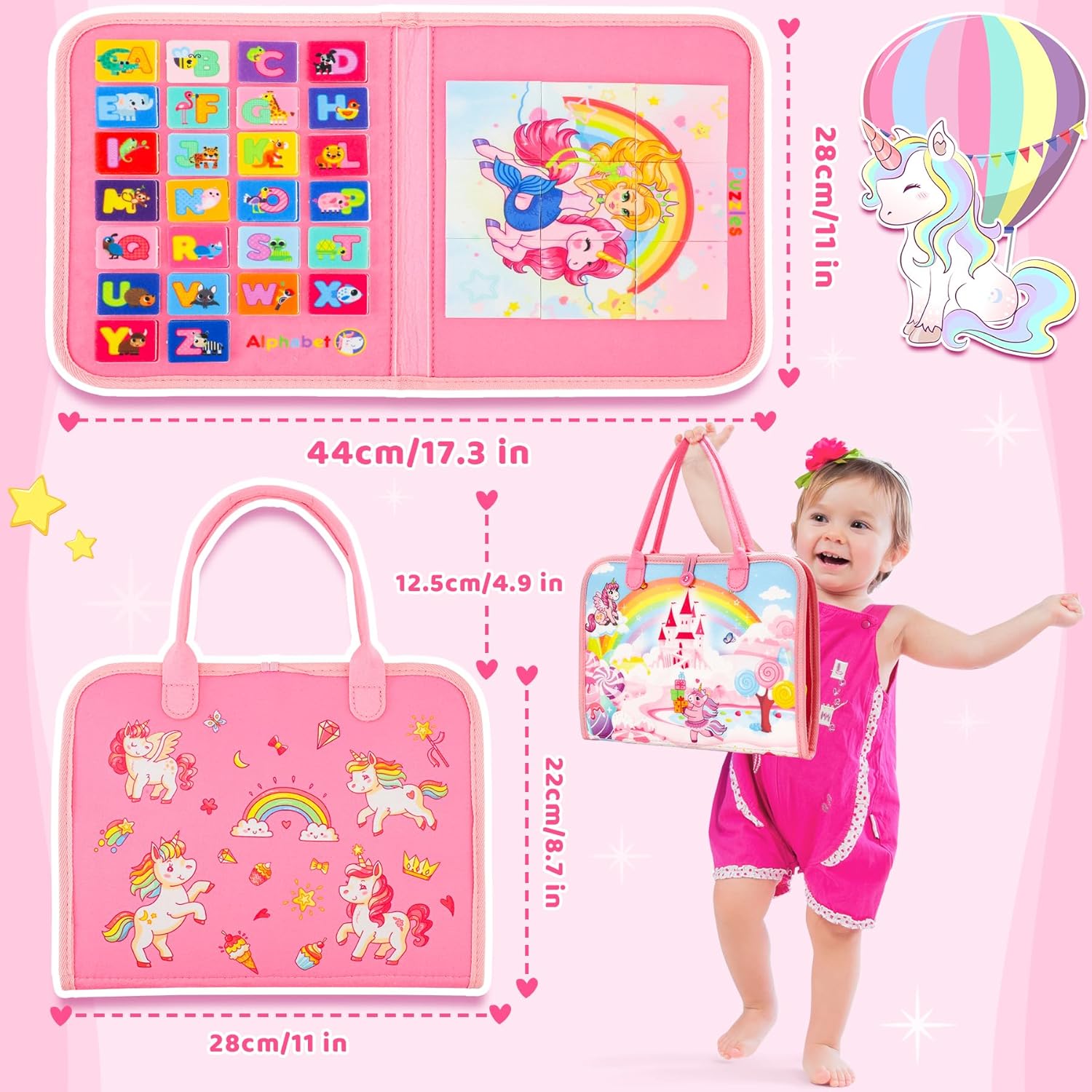 【Tavolo da gioco 20 in 1】 Il tabellone di gioco contiene vari componenti sensoriali, divertenti attività di apprendimento per insegnare ai bambini l'alfabeto, i numeri, la data, le forme, i colori, i puzzle, vestirsi, abbottonare, allacciare i lacci delle scarpe e chiudere la cerniera, ecc. Aiutano i bambini a migliorare le loro capacità motorie e promuovere la loro indipendenza. 【Giocattolo sensoriale ideale per la crescita dello sviluppo】 La nostra tavola Montessori è un giocattolo sensoriale ideale che promuove lo sviluppo di capacità di risoluzione dei problemi, pensiero creativo e abilità di vita di base. Con le sue attività interattive e tattili, i bambini possono allenare la percezione sensoriale e la coordinazione occhio-mano giocando e divertendosi. È anche un efficace aiuto didattico per bambini con autismo o logopedia. 【Giocattoli educativi sicuri e durevoli】 Il pannello delle attività per i giocattoli sensoriali dei bambini è realizzato con materiali in feltro morbido di alta qualità ed è atossico, delicato sulla pelle e privo di spigoli vivi. Tutte le parti sono fissate saldamente in modo che i bambini possano giocarci in modo sicuro e protetto. Compagno di viaggio portatile: il nostro giocattolo montessori da tavolo è dotato di 2 tavole centrali rimovibili con cerniera. 2-4 bambini possono giocare insieme contemporaneamente, il che promuove la socializzazione e la cooperazione. I nostri giocattoli da viaggio manterranno i bambini occupati e intrattenuti per lunghi viaggi e assicureranno che i genitori possano viaggiare con i loro piccoli senza stress.,Regalo perfetto: il nostro giocattolo Montessori ispirato all'unicorno è un ottimo regalo per Natale, Capodanno, compleanni e altre occasioni speciali. Questo è il modo perfetto per mostrare il tuo amore e sostegno a tuo figlio, incoraggiando al contempo la sua naturale curiosità e creatività.