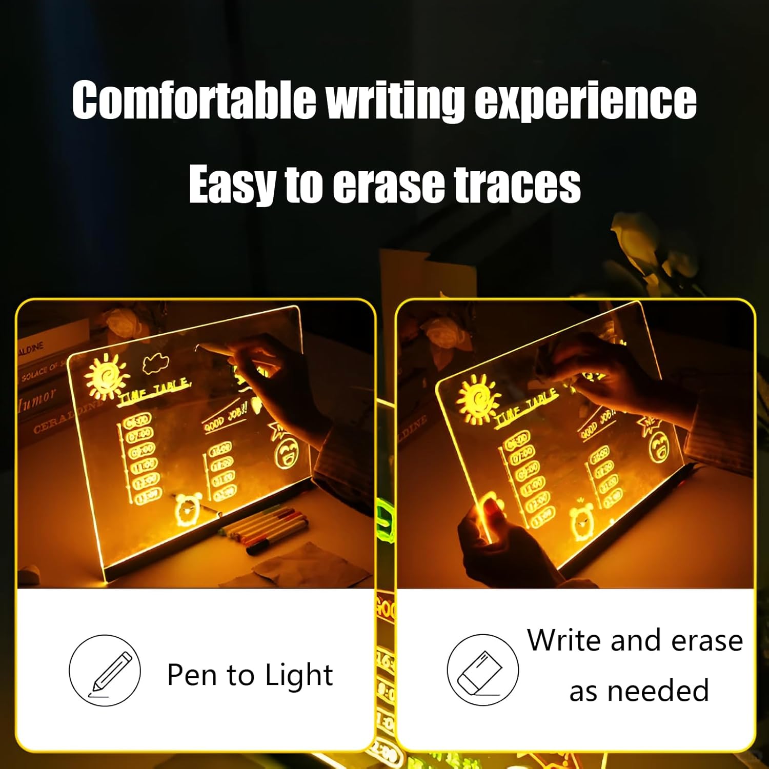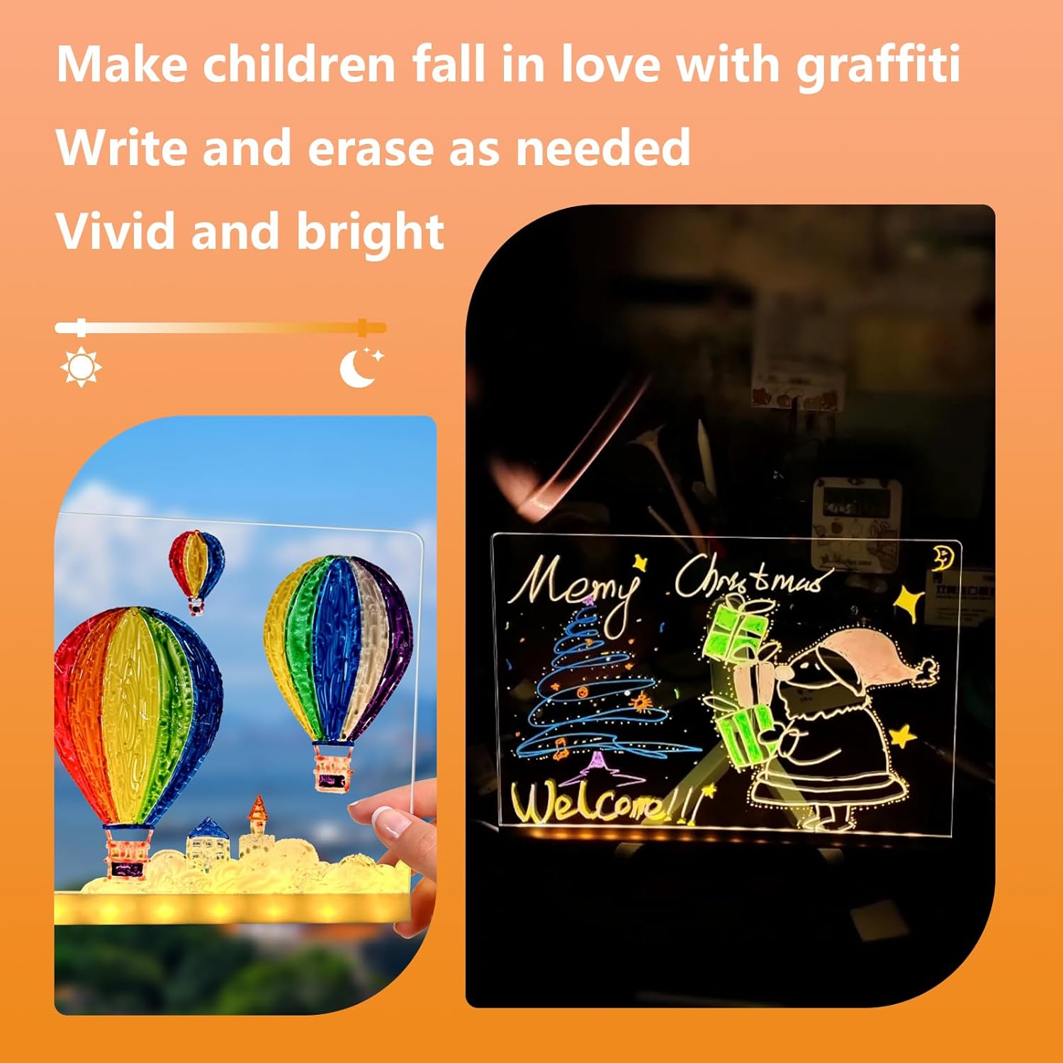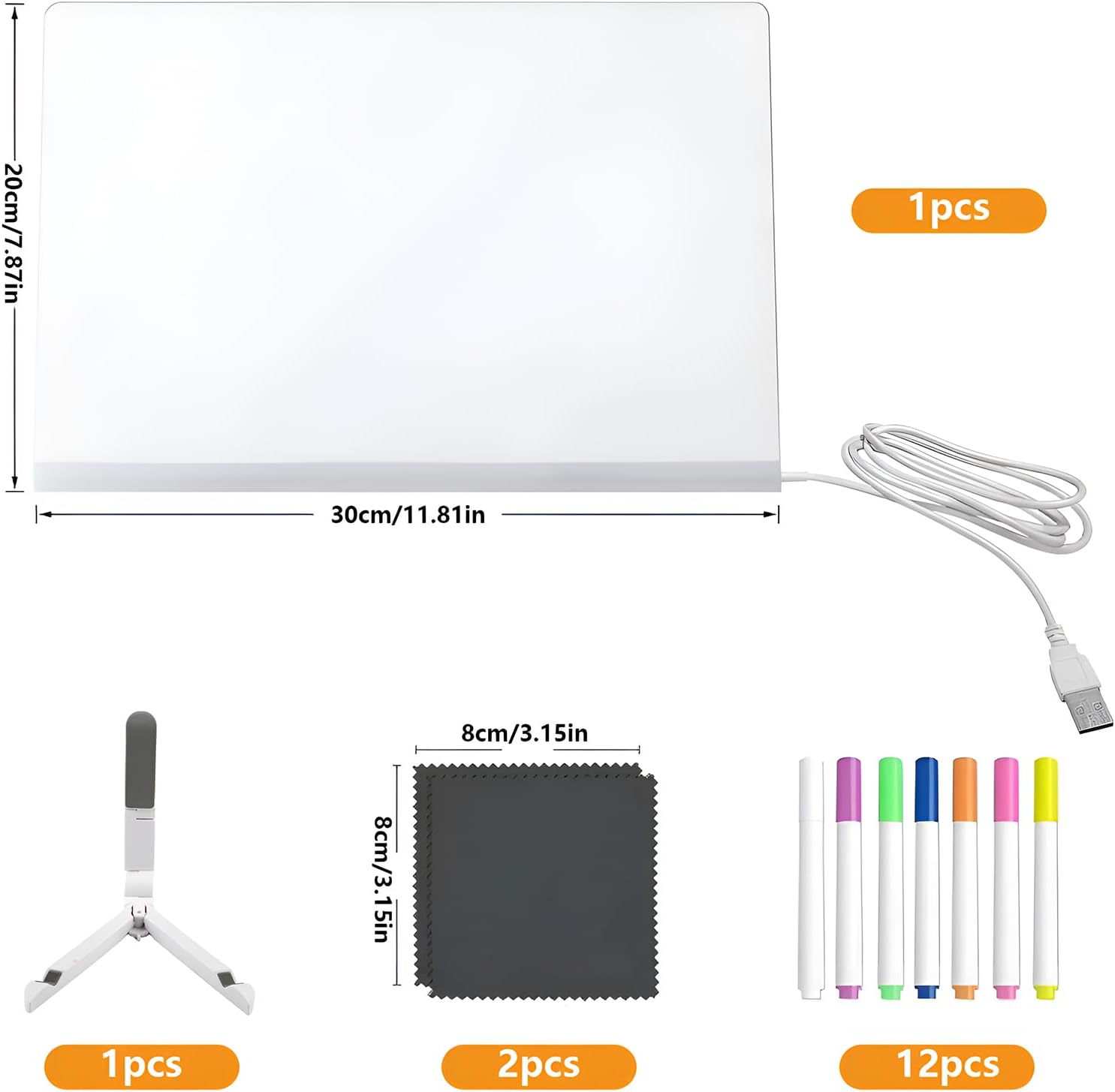 Materiale: Lavagnetta cancellabile bambini realizzato con piastre acriliche trasparenti di alta qualità, è resistente, estinto e non lascia facilmente macchie e ammaccature. Contenuto di imballaggio: l'imballaggio contiene penne cancellabili a 12 colori, 2 salviette, staffa regolabile X1, taglia 30x20cm, con spina USB a strisce di luce, adatto per pittura e graffiti. Staffa regolabile: Lavagnetta cancellabile fornito con un treppiede regolabile e può essere posizionato all'angolo giusto. Regalo fai -da -te: Porta USB, facile da usare. Le luci a LED che emettono la luce morbida rendono il dipinto più attivo e forniscono un effetto visivo unico per l'espressione creativa. Utili Multipli: lavagna luminosa per disegnare essere in camera da letto, soggiorno, bagno, bar, negozio, festa o altro tavolo da pranzo e sono ideali per la casa o l'ufficio. Puoi anche lasciare messaggi per famiglia, colleghi o amici.