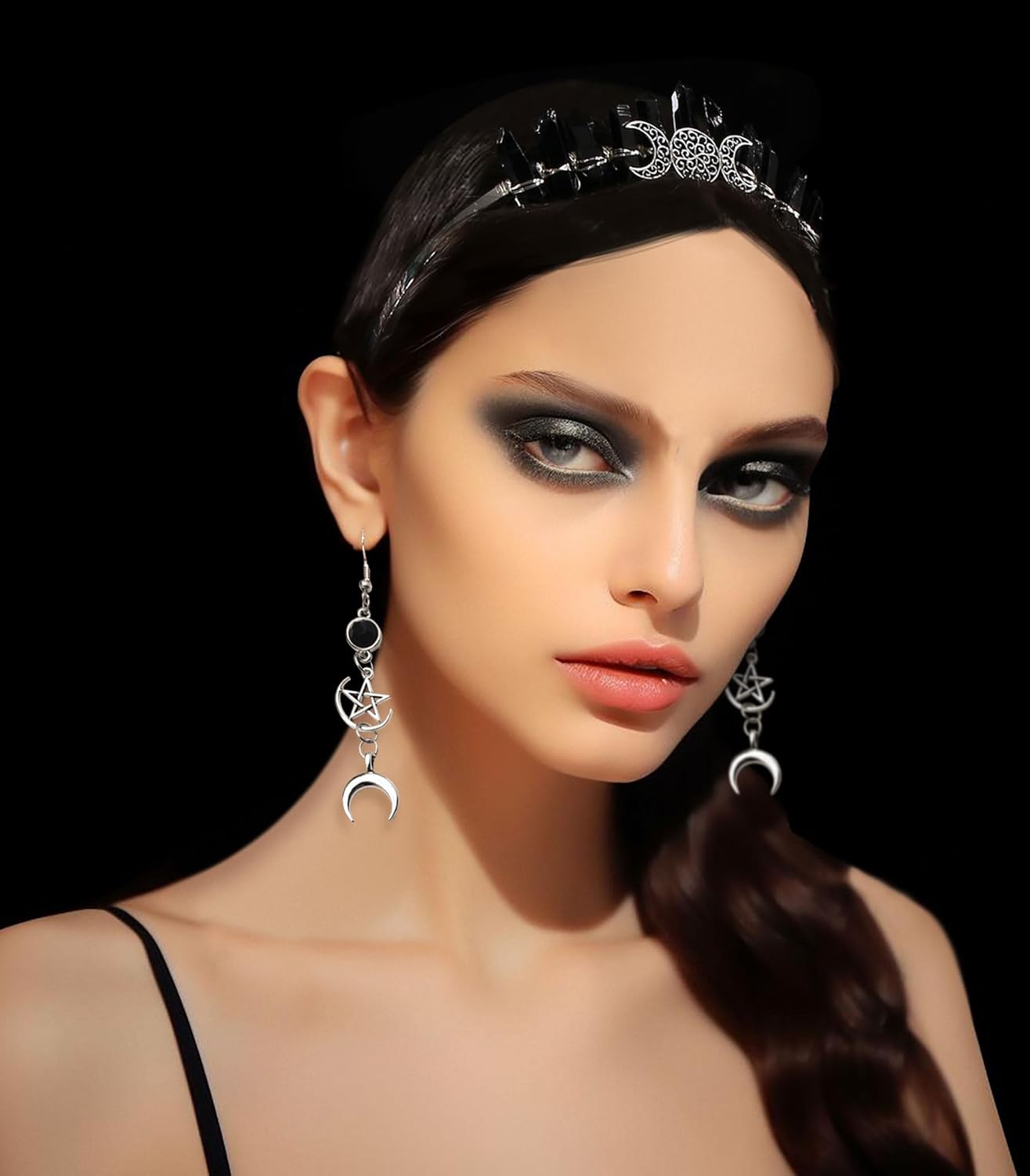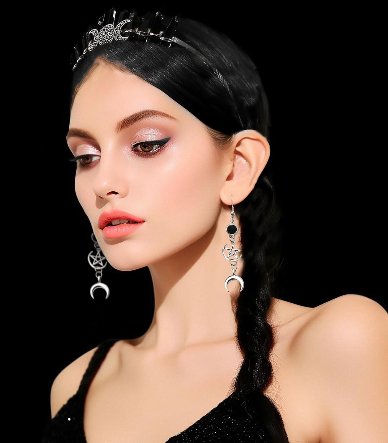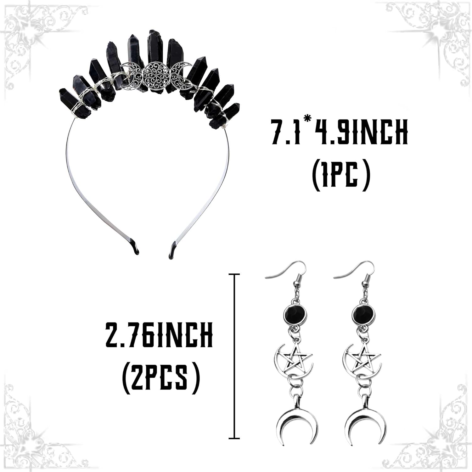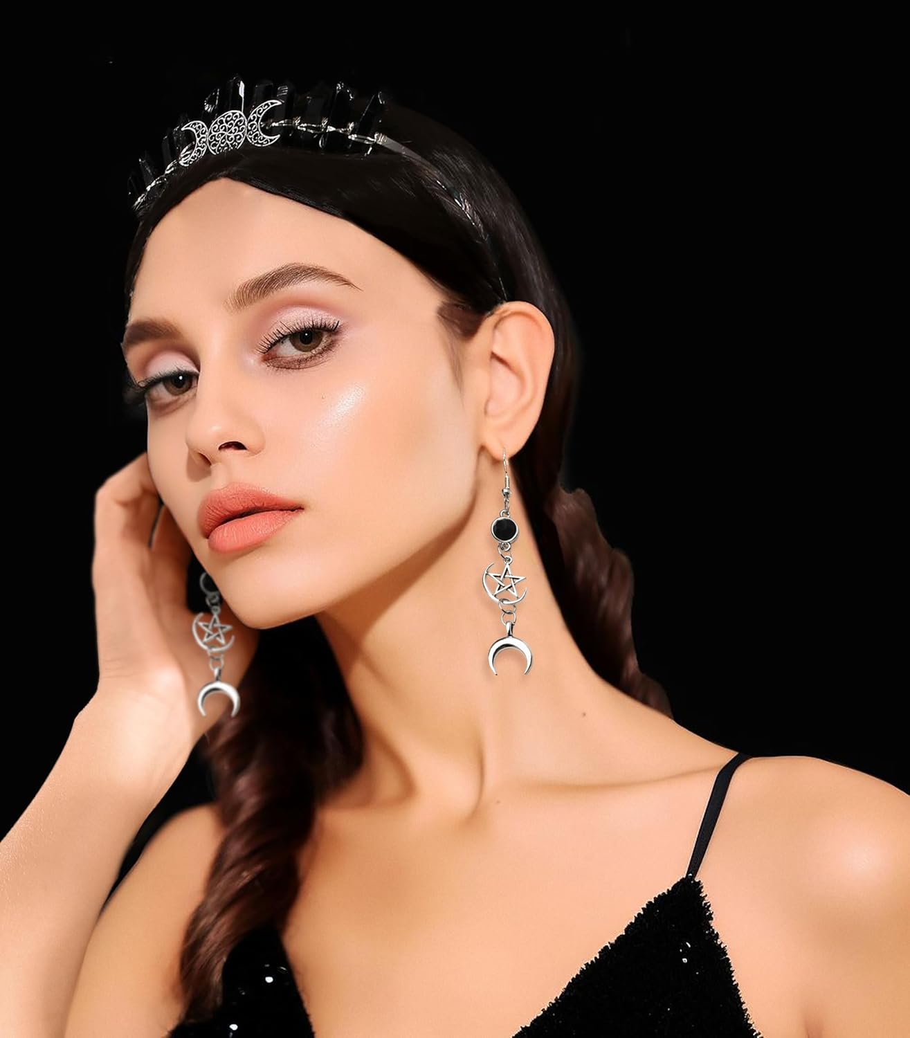 Lavare solo a mano, si otterrà: 1 x luna nera Corona Headband, 2 x orecchini luna. Per adulti. Questo copricapo aureolato da dea è per chi sta affrontando un nuovo capitolo della propria vita, che sia un cambiamento di carriera o un nuovo percorso. Chiunque indossi questa corona riceverà la protezione necessaria per affrontare questa fantastica transizione. Costume per Halloween, Natale, Cosplay, Carnevale, Festa di compleanno, Masquerade, Party, Club o altri festival. Se avete qualche problema, per favore fatemi sapere