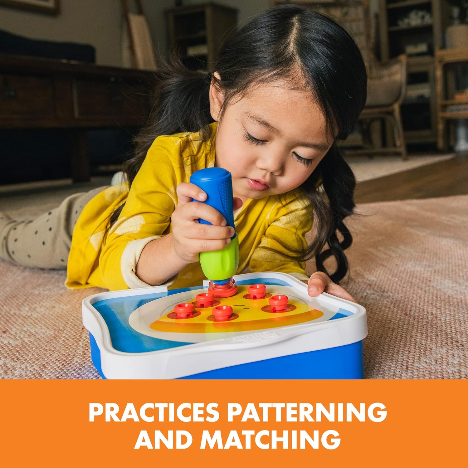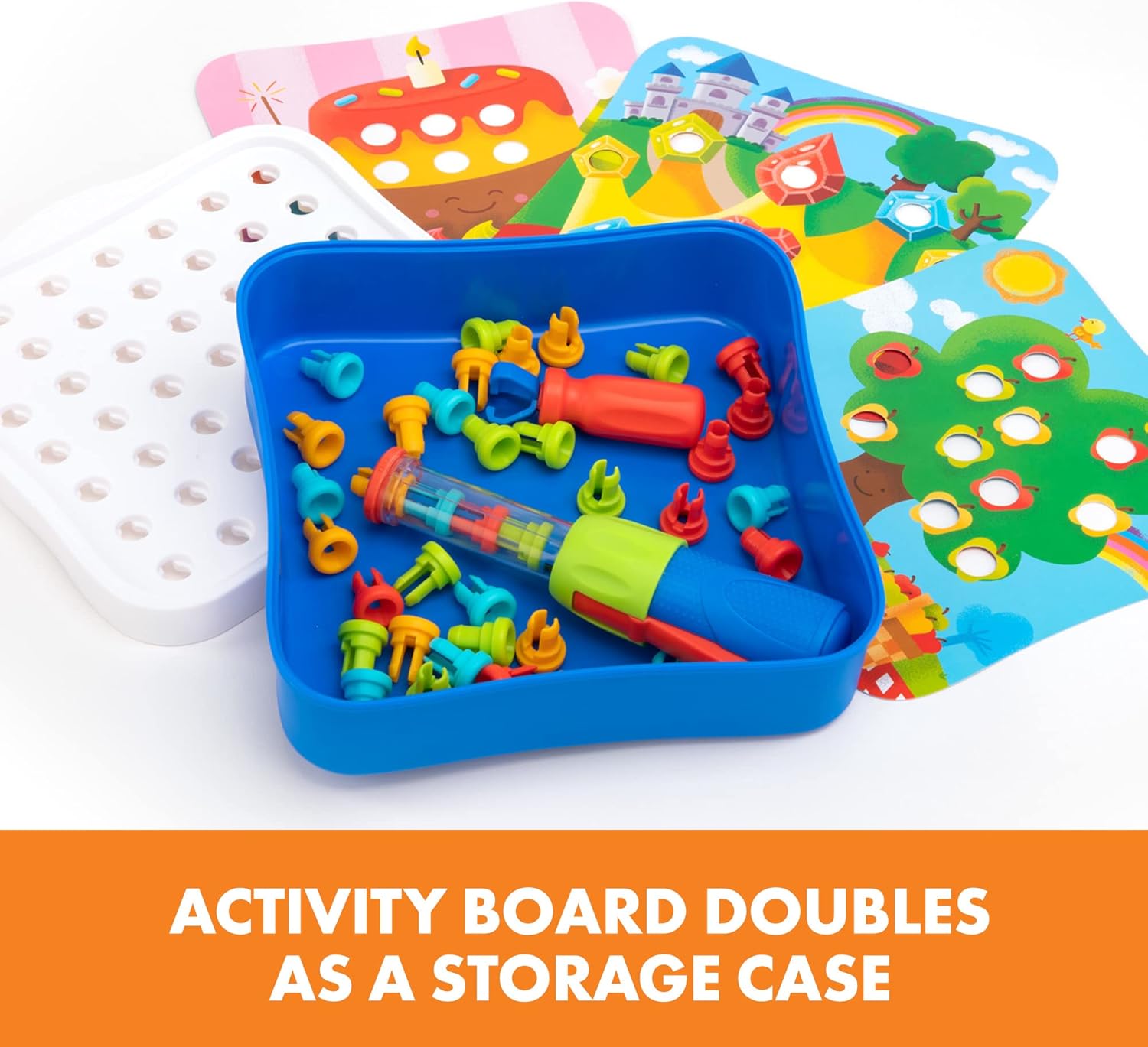 UN PRIMO APPRENDIMENTO SCOPPIETTANTE! I piccoli costruttori usano una rivettatrice a mano e rivetti che fanno “pop” quando vengono posizionati per completare i motivi colorati raffigurati nella carte incluse. SUPPORTA L’APPRENDIMENTO STEM: i più piccoli fanno esperienza pratica con strumenti di lavoro reali ed esercitano le abilità di abbinamento, un’abilità matematica precoce fondamentale, esplorando al contempo i principi di base dell’ingegneria mentre giocano. SVILUPPO DELLA ABILITÀ FINO-MOTORIE: maneggiare le carte, la rivettatrice e i rivetti sviluppa la forza delle mani, la coordinazione occhio-mano e le abilità fino-motorie di cui i bambini hanno bisogno per tenere in mano una forchetta, abbottonarsi le camicie e tenere in mano una matita per scrivere. GIOCO IN MOVIMENTO: crea i motivi che vuoi sulla tavola di attività portatile. Quando il gioco è finito, tutto si conserva in modo ordinato nella scatola riutilizzabile con comodo manico. COMPRENDE: rivettatrice azionata a mano da premere, 40 rivetti colorati, strumento per rimuovere i rivetti e 10 schede di attività double-face che si ripongono nella tavola di attività dopo l’uso.