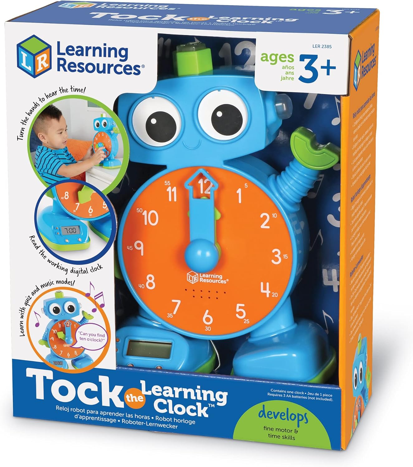 Aiuta i piccoli studenti, a partire dai 3 anni, a imparare a leggere l'ora! Contiene varie modalità per imparare e divertirsi! teaching time, quiz mode, music time e una sveglia ok to wake Funge anche da luce notturna, mostrando un colore per il momento della nanna e un altro per il risveglio La modalità quiz propone ai bambini tre domande sul tempo, relative all'orologio analogico Tock the learning clock include una confezione multilingue e una guida alle attività