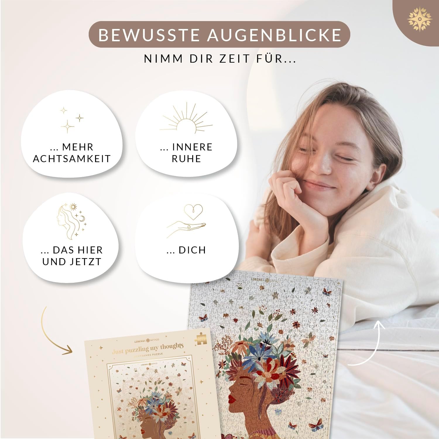 PURO RELAX: Scopri l'affascinante mondo dei puzzle da 1000 pezzi per adulti: la tua porta verso la pace interiore e la cura di te stesso. Un regalo ideale per regalare relax e serenità. MOMENTI CONSAPEVOLI: sperimenta una serenità e una gratitudine profondamente sentite mentre assembli questo puzzle di alta qualità da 1000 pezzi per adulti: una pausa perfetta dalla vita di tutti i giorni. ILLUSTRAZIONE DECORATIVA: aggiungi un tocco di stile alle tue stanze con l'illustrazione decorativa di questo set di puzzle per adulti di alta qualità. Un colpo d'occhio che ti entusiasmerà anche dopo aver finito i puzzle ed è ideale da appendere. CONFEZIONE DI ALTA QUALITÀ: i nostri pezzi del puzzle sono avvolti con cura in una confezione di alta qualità, inclusa una pratica borsa per il trasporto, perfetta anche come confezione regalo per momenti speciali. START-UP MINDFUL: come start-up, per noi è importante avvicinare gli adulti alla consapevolezza e all'amor proprio. Dai un'occhiata anche agli altri nostri prodotti.