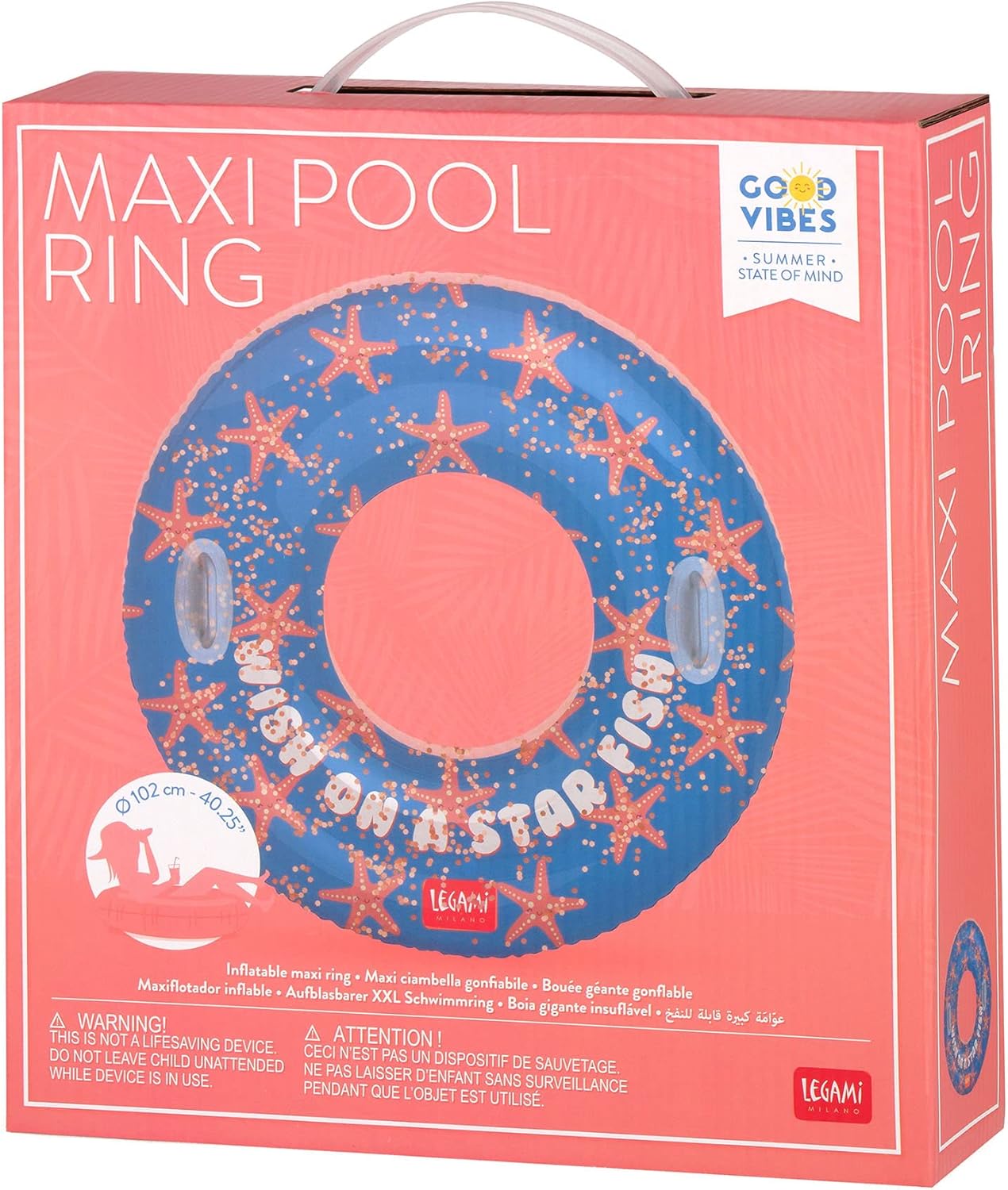 Non tutte le ciambelle riescono col buco, a parte la maxi ciambella gonfiabile Starfish di Legami! Lasciati avvolgere mentre ti rilassi in piscina e brilla come una star con i suoi glitter extra glamour! E se si buca? C'è la toppa autoadesiva per riparare i piccoli fori! CARATTERISTICHE: ciambella gonfiabile a una camera d'aria. Maniglie resistenti per una migliore stabilità. Include una toppa autoadesiva per riparare piccoli fori. Adatto a maggiori di 14 anni. Peso massimo supportato: 80 kg. Il prodotto non è idoneo all'utilizzo in acque libere o dove presenti forti correnti. Nessuna protezione contro l'annegamento. Utilizzare in acque non profonde e, per i bambini, sotto la supervisione di un adulto. MATERIALI E DIMENSIONI: in PVC con spessore di 0,20 mm. Manici in plastica. Dimensioni: diametro 102 cm. GOOD VIBES: summer state of mind! Il segreto per una giornata di vacanza perfetta? Amici divertenti, un cielo senza nuvole e gli accessori giusti! Con Legami l’anima della spiaggia sei tu: dal cruciverba sulla sdraio al pisolino defaticante, ogni momento è perfetto se hai lo stile di Legami dalla tua. Abbiamo un universo di mondi a tua disposizione! Creiamo oggetti di qualità sempre diversi, colorati, positivi e divertenti, perfetti per ognuno e per ogni stato d’animo. In Legami puoi sempre trovare il tuo mondo ideale, da scoprire ed esplorare giorno per giorno: un mondo di felicità per quando sei un po’ giù, un mondo di sorprese per quando ti annoi, un mondo di ispirazioni per quando sei a corto di idee, un mondo di emozioni diverse in continua evoluzione.