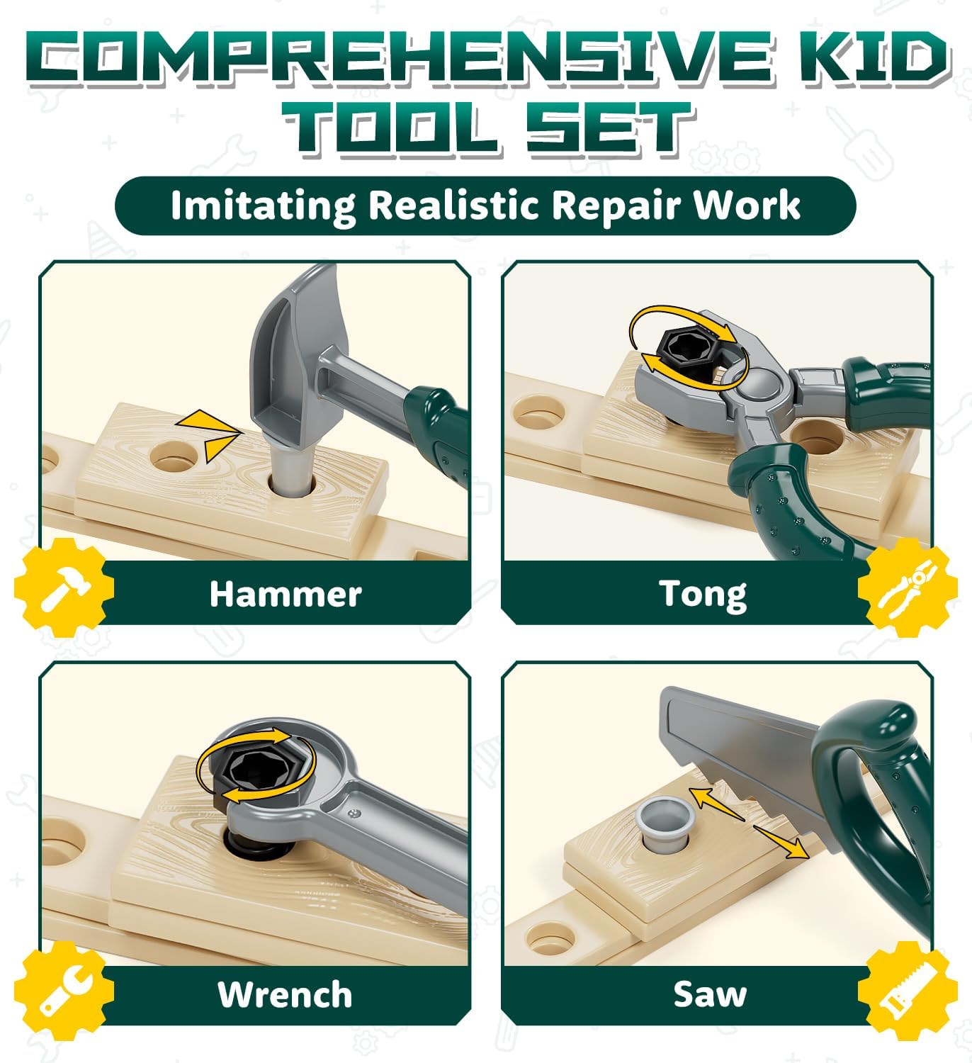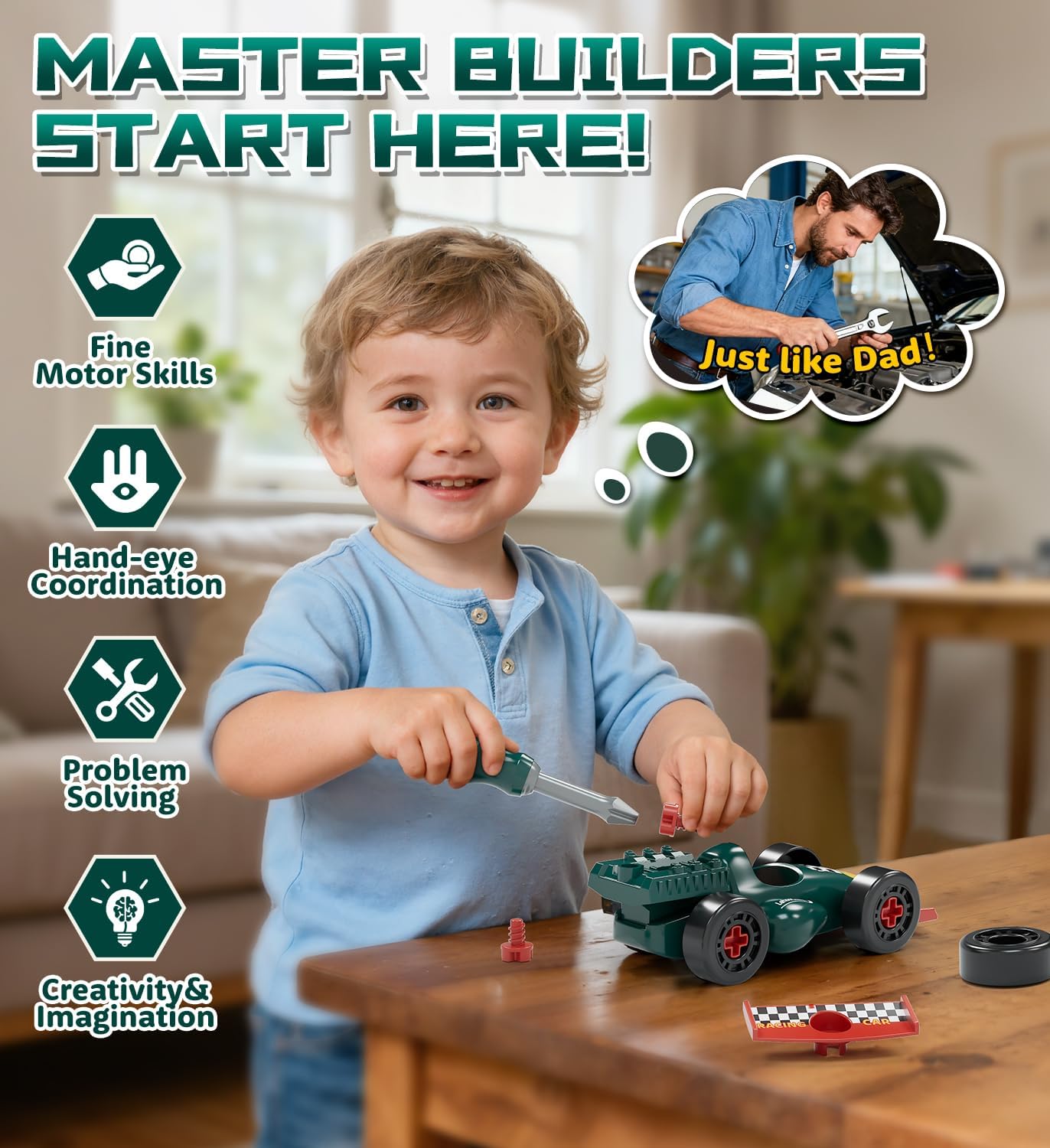 【Il kit degli attrezzi dei sogni del piccolo!】 Il piccolo riparatore è arrivato! Realizza il desiderio di ogni bambino di emulare papà e mettersi all'opera con il “lavoro” - tutto in una sola scatola! 【Set realistico da 6 pezzi + auto da corsa fai da te, infinite possibilità di gioco!】 Martello, sega, chiave inglese, trapano elettrico... il kit completo di attrezzi! Inoltre, assembla una fantastica auto da corsa per un gioco creativo che non stanca mai. 【Mani e mente all'opera: gioca in modo intelligente!】 Martellando e costruendo, sviluppa naturalmente la coordinazione occhio-mano, il pensiero logico e l'immaginazione senza limiti. 【Include una custodia per riporre gli attrezzi, niente più disordine!】 I bambini riordinano dopo aver giocato, sviluppando buone abitudini fin dalla tenera età. Coperchio a scatto per un facile trasporto: l'officina del tuo piccolo è pronta per partire. 【Il regalo perfetto per i bambini dai 3 anni in su!】 Realizzato con materiali sicuri e design arrotondati. Fagli una sorpresa che desidera davvero e ammira l'orgoglio nei suoi occhi!
