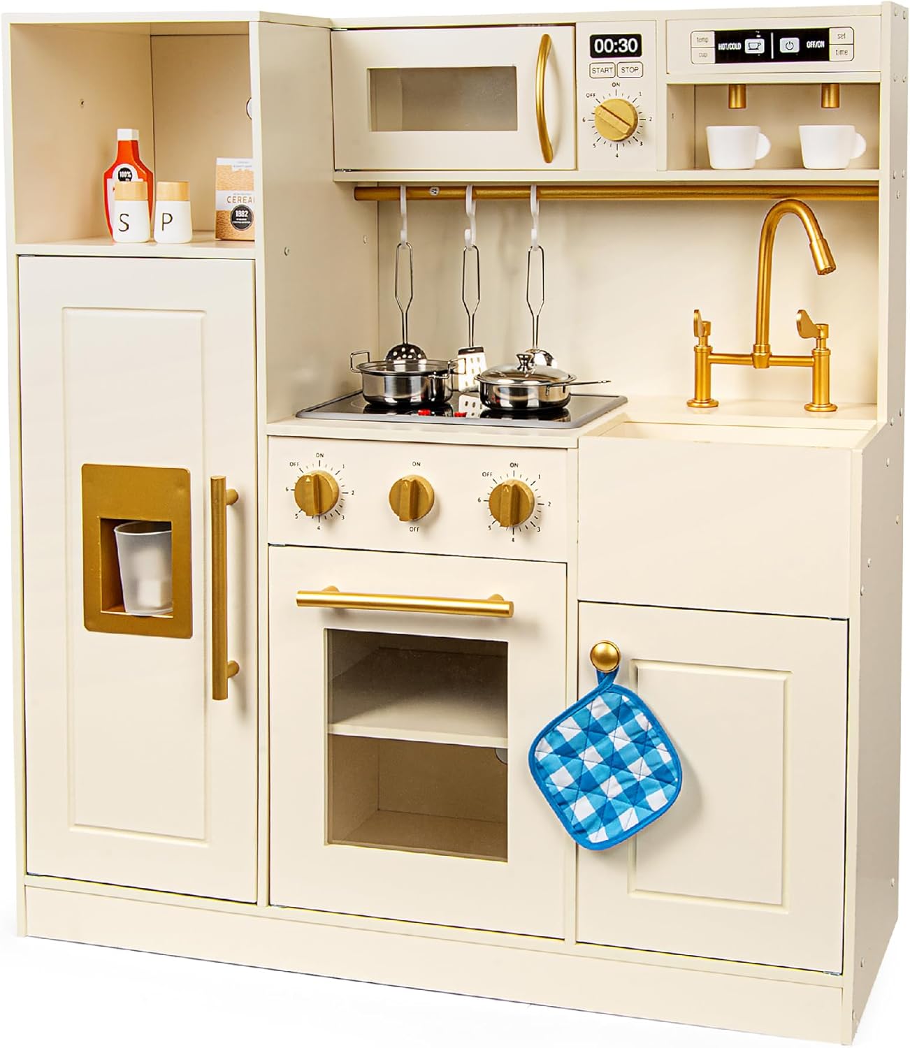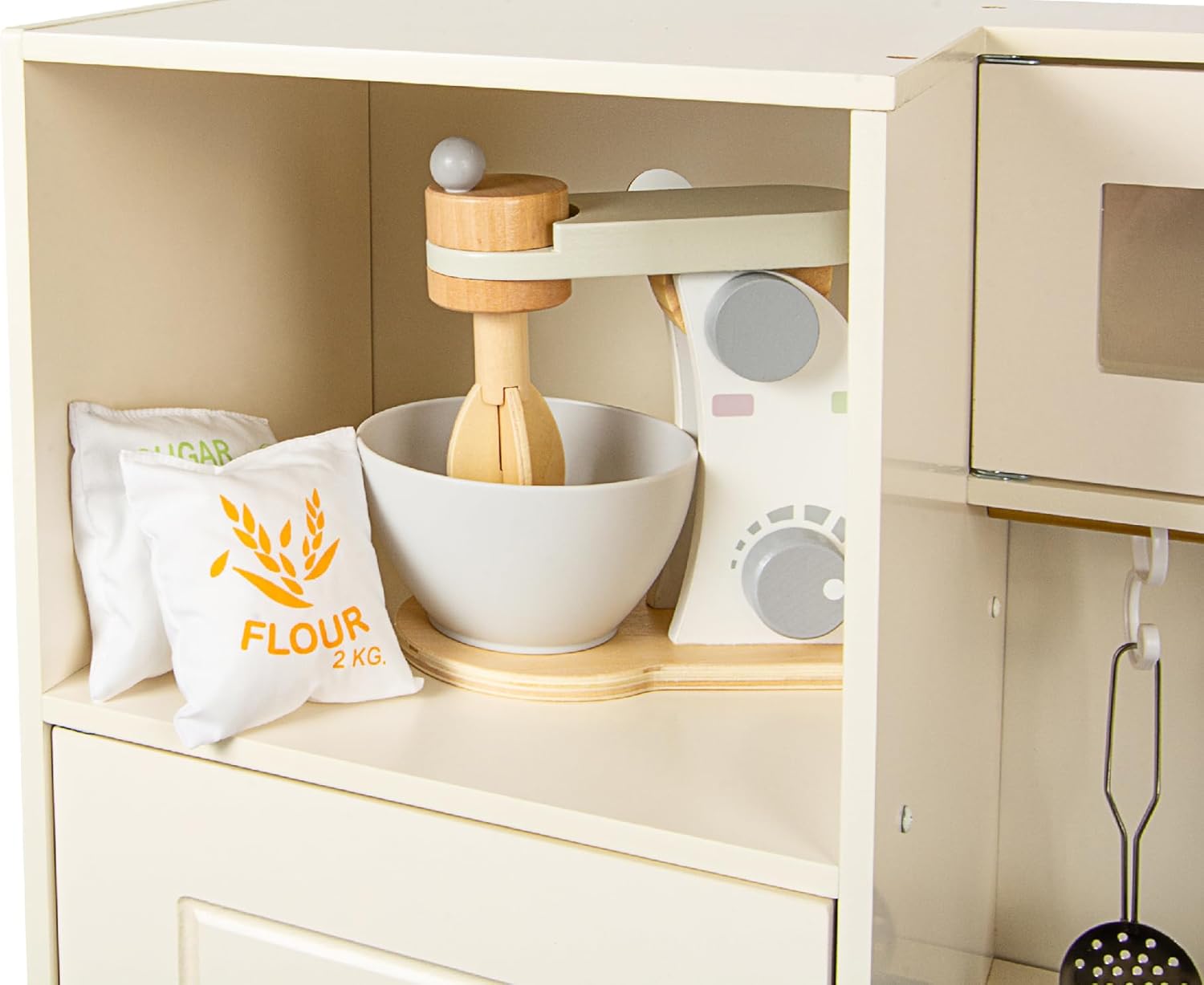 🥦Cucina in legno con luce e suono – Il piano di cottura si illumina ed emette suoni realistici premendo il pulsante. Ideale per giochi di simulazione che sviluppano creatività e immaginazione. 🥦Il piano cottura a induzione si illumina e produce suoni di cottura realistici al tocco di un pulsante. Struttura solida: realizzato in MDF spesso 0,9 cm, garantisce elevata stabilità e durata. L'altezza di lavoro ergonomica di 51 cm è ideale per i bambini. 🥦Il set include una pentola di metallo, una padella con coperchio, utensili da cucina, un dispenser di ketchup in legno, bicchieri, uno strofinaccio, una macchina per il ghiaccio con bicchiere e molto altro. Tra le caratteristiche più interessanti, un forno a microonde con manopole, un frigorifero con dispenser per il ghiaccio, un rubinetto girevole con manopole dorate, un ampio lavello e un ripiano portaoggetti. 🥦Frullatore in legno Questo pratico frullatore in legno con frusta mobile aiuterà i piccoli pasticceri a preparare i loro dolci preferiti in pochissimo tempo. Una manopola laterale consente di regolare la velocità di miscelazione, proprio come in una vera cucina. Il set include una ciotola di plastica e due sacchetti di farina e zucchero. 🥦Dimensioni: 82 x 29 x 89 cm Peso: 18,70 kg Tempo di consegna: 4-7 giorni lavorativi Ti inviamo a dare una occhiata ad altri prodotti dalla serie Leomark.