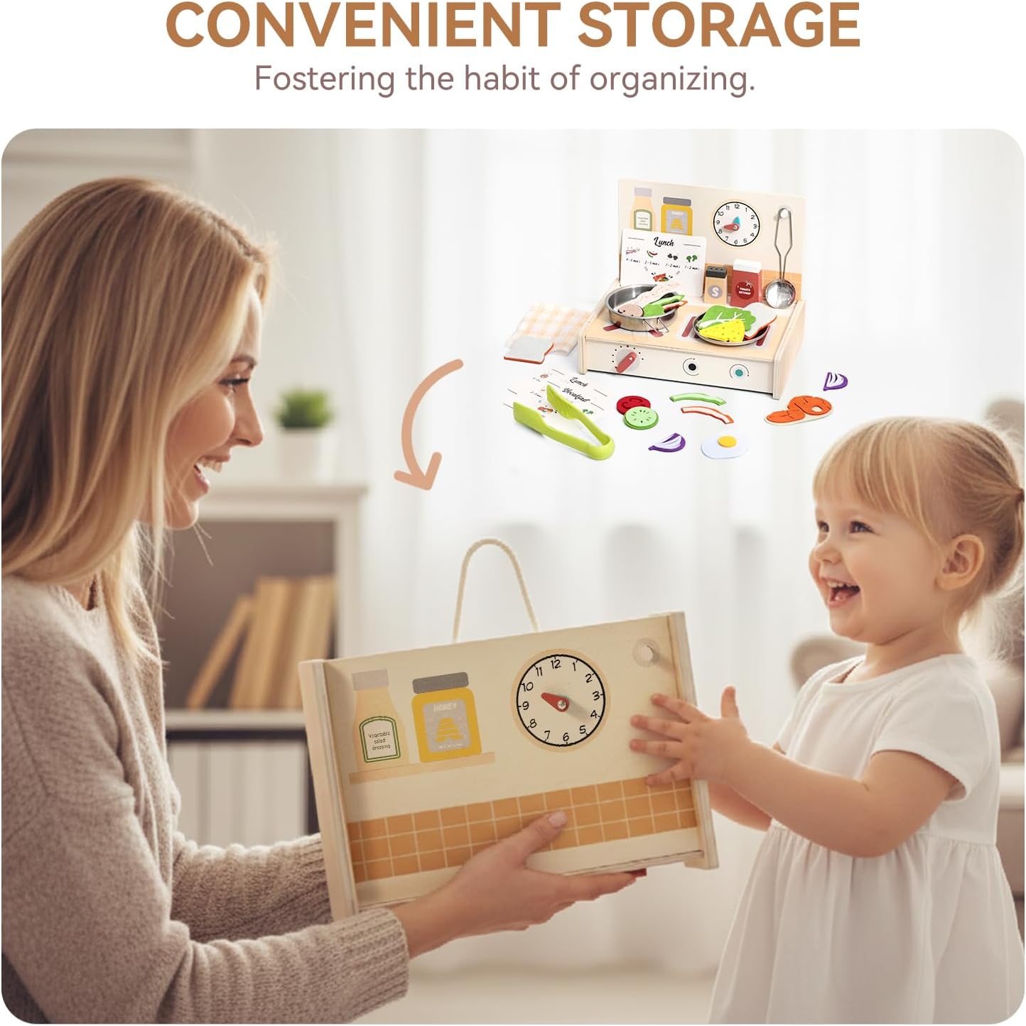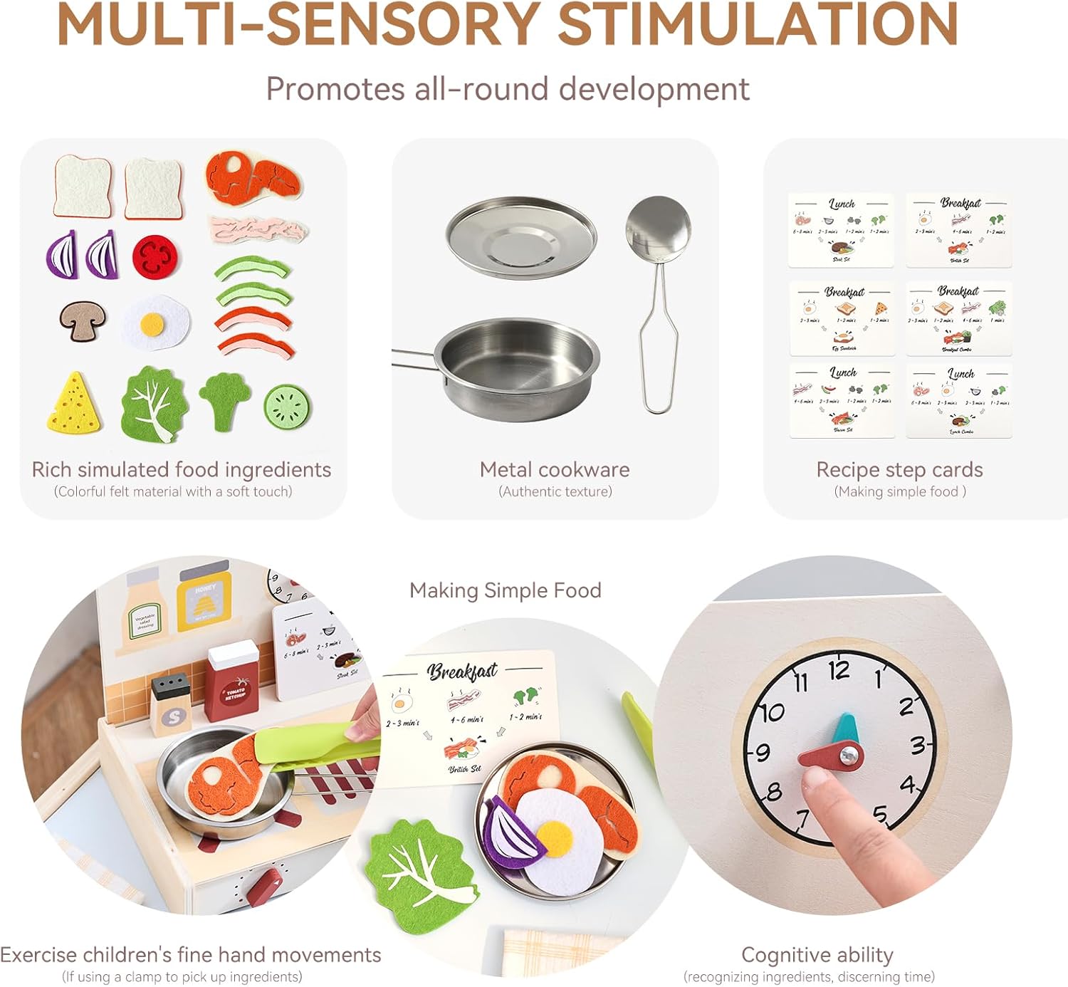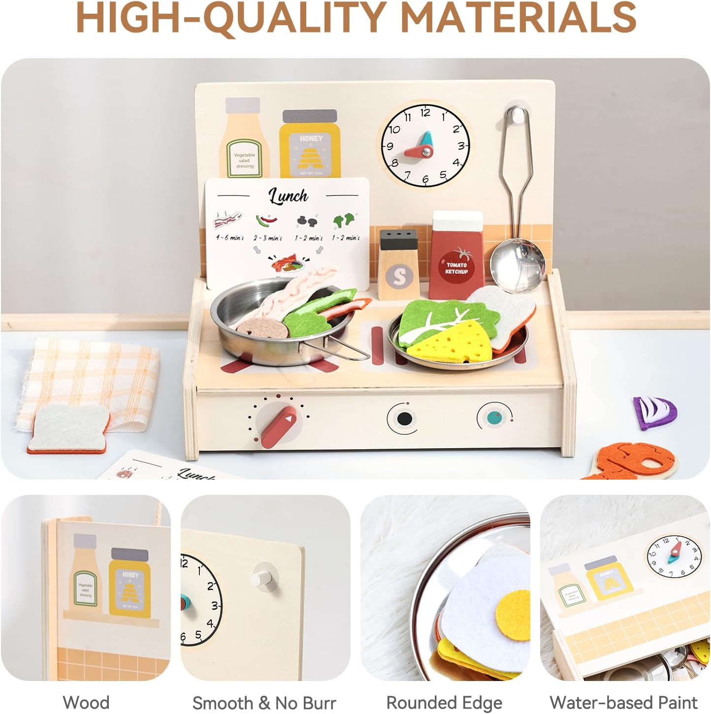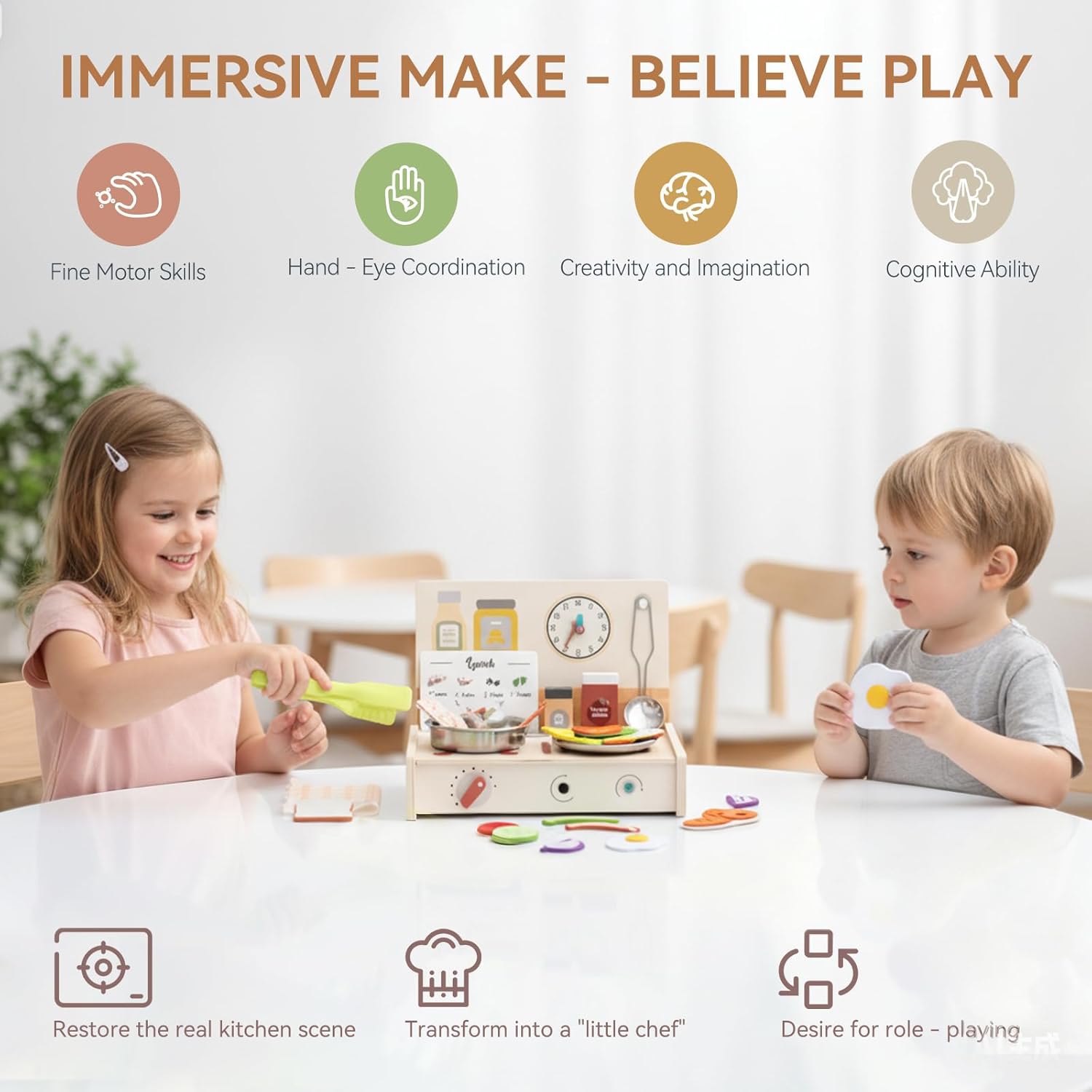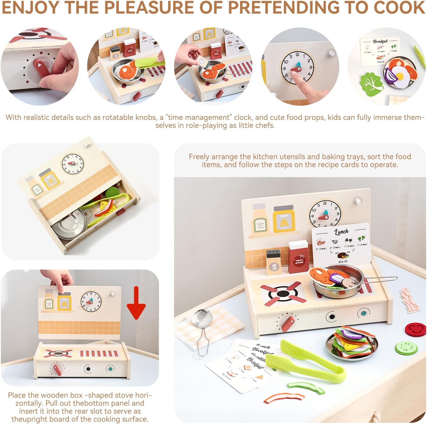 [Cucina trasformabile con funzione di stoccaggio] Qui si uniscono divertimento e mantenimento intelligente in ordine La stufa di questa cucina giocattolo può essere facilmente rimossa e trasformata in un contenitore portatile in cui tutti gli accessori possono essere riposti ordinatamente. Questo design ben studiato non solo consente di risparmiare spazio, ma guida i bambini a buone abitudini organizzative, così il tempo di gioco e il tempo di pulizia si combinano perfettamente [Esperienza di cottura coinvolgente] Il set include un fornello, una scheda di ricette 3D colorata, vari alimenti, pentole, barattoli per spezie e altri accessori completi. I bambini possono seguire i passaggi della ricetta illustrati e imitare le vere operazioni di cottura – accendere il "fornello", mescolare, aggiungere "spezie". Nei giochi di ruolo creano il proprio mondo culinario e accendono così la loro immaginazione illimitata [Laboratorio di apprendimento pedagogico] Secondo i principi della pedagogia Montessori, questo giocattolo favorisce la coordinazione occhio-mano e il pensiero logico imitando la preparazione degli alimenti, i processi di cottura e il controllo della temperatura. Seguire i passaggi della ricetta aumenta la concentrazione, mentre il gioco di cucina insegna i principi di causa ed effetto. Incoraggia l'apprendimento in modo divertente e interattivo [Materiali di alta qualità e sicuri per i bambini] Realizzato in legno ecologico di alta qualità, rivestito con colori ad acqua atossici e adatti ai bambini. Tutti i bordi sono accuratamente levigati per una sensazione di gioco piacevolmente liscia e senza sbavature. Gli accessori sono appositamente dimensionati per i bambini piccoli per evitare rischi di ingestione. Conforme alle norme internazionali di sicurezza dei giocattoli e garantisce una protezione completa durante l'esplorazione del mondo della cucina [Il regalo ideale per lo sviluppo] Che si tratti di festa di compleanno, Natale o come ricompensa per piccoli successi, questa cucina giocattolo è il regalo perfetto per i bambini dai 3 ai 6 anni. La vasta gamma di accessori consente il gioco interattivo a più e promuove le abilità sociali. Combinabile con altri set di giochi di ruolo per espandere i mondi di gioco, per un entusiasmo duraturo per tutta l'infanzia