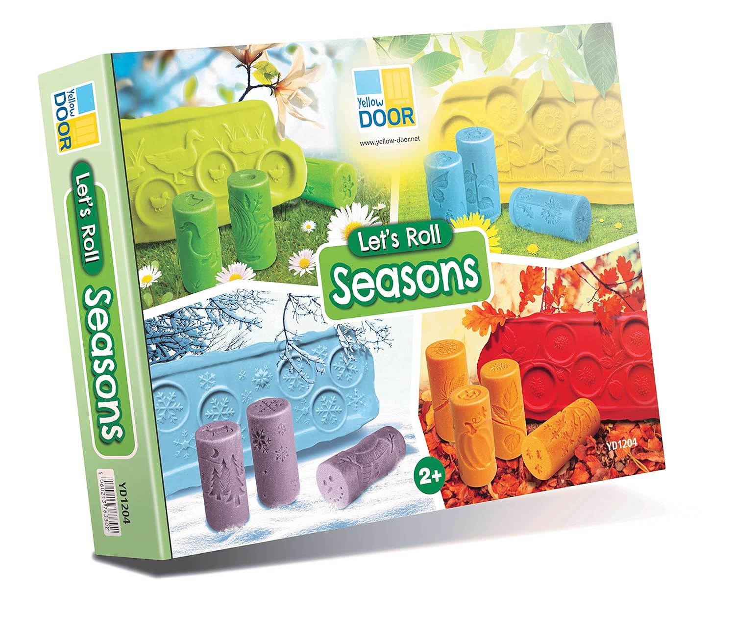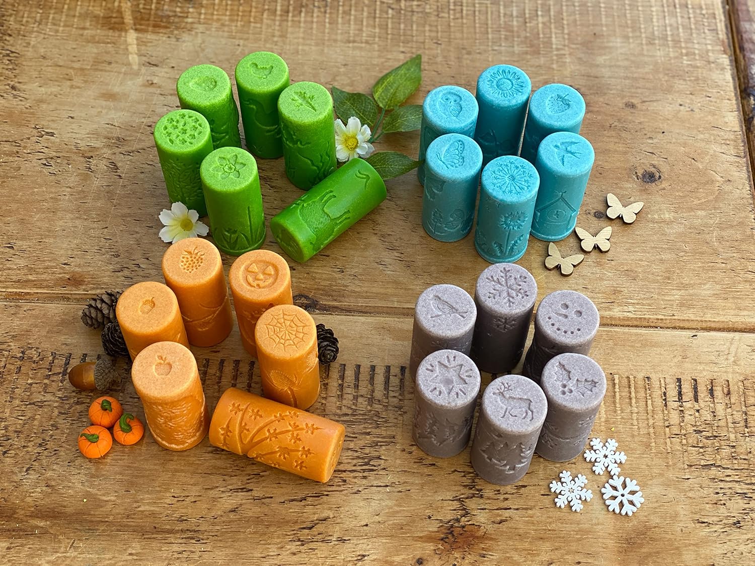 Arrotolare il motivo rientrato nell'impasto o giocare all'argilla per creare un'immagine stagionale Aggiungere un simbolo a una scena utilizzando il timbro all'estremità del rullo Ogni rullo misura 72 x 34 mm Età 2+ Rulli strutturati