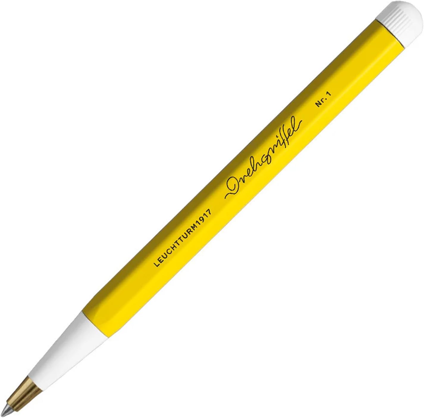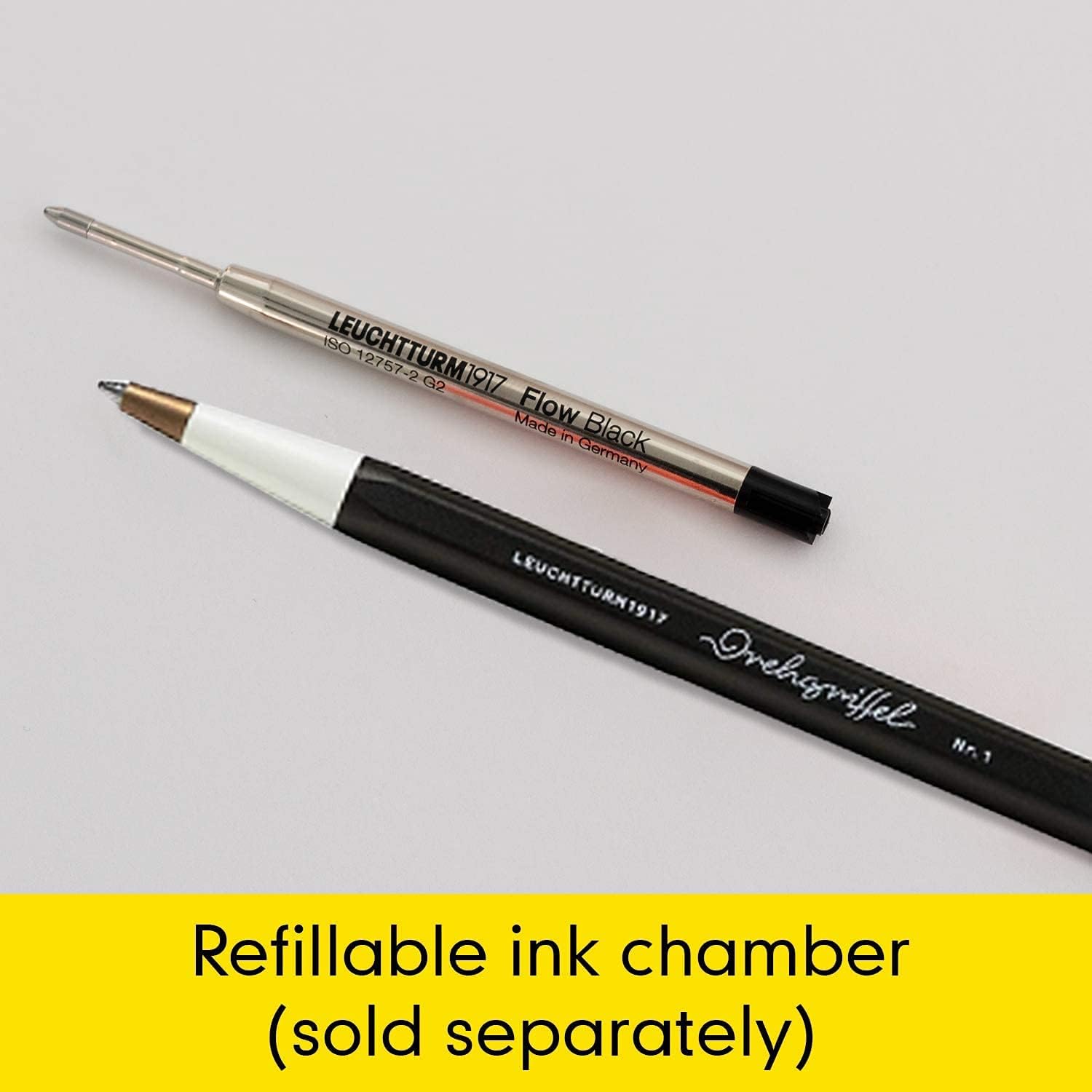 L’impugnatura è realizzata in alluminio e ottone fresato di precisione, poi laccata e sigillata. Penna a sfera con inchiostro blu royal. LEUCHTTURM1917 con inchiostro indelebile, DIN ISO 12757. Meccanismo a rotazione con cuscinetti a molla.