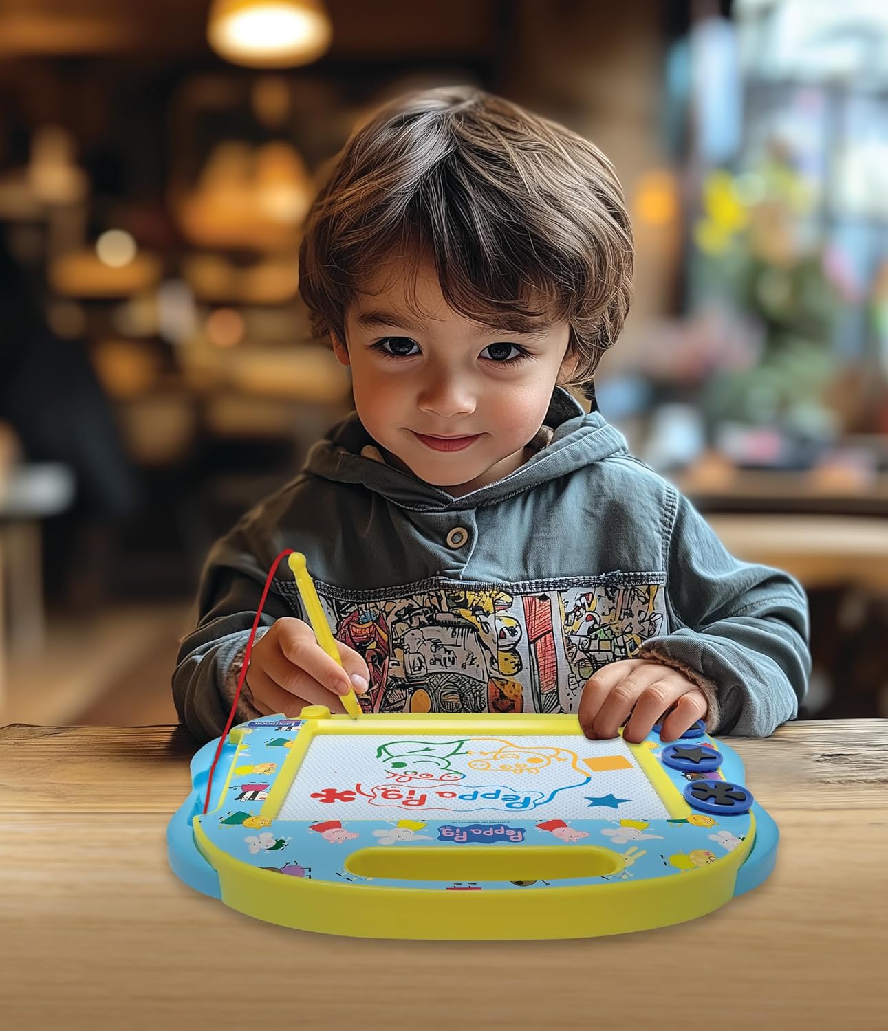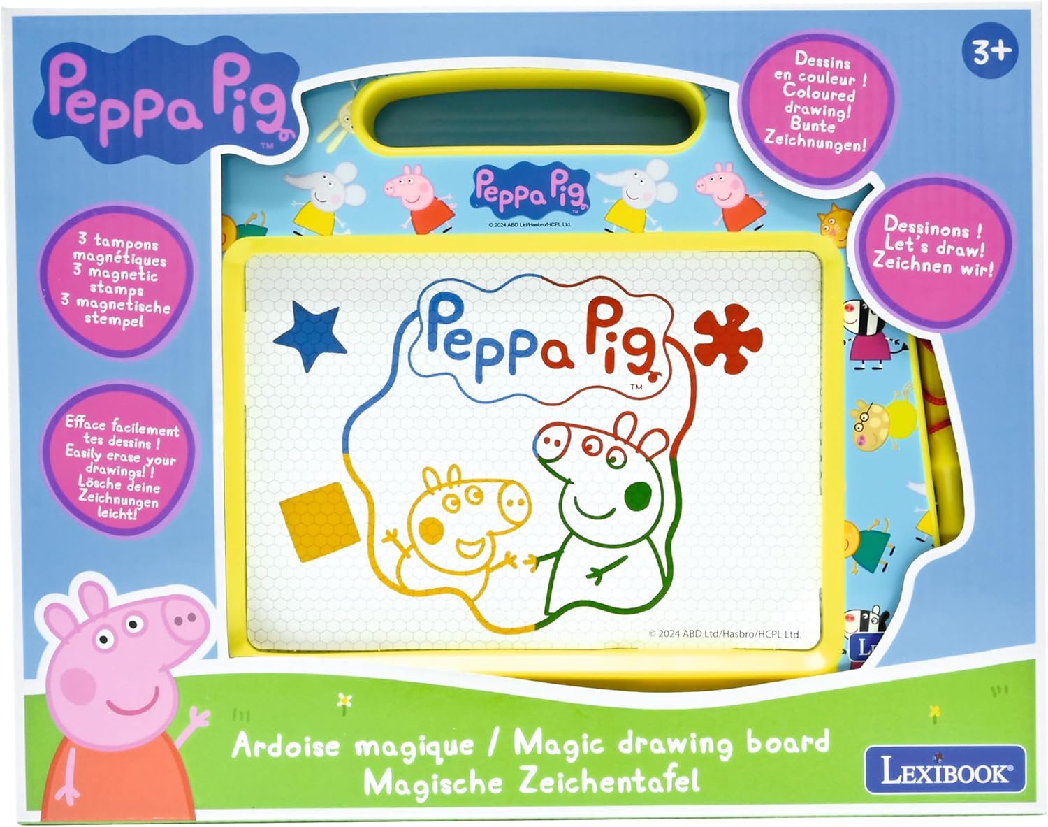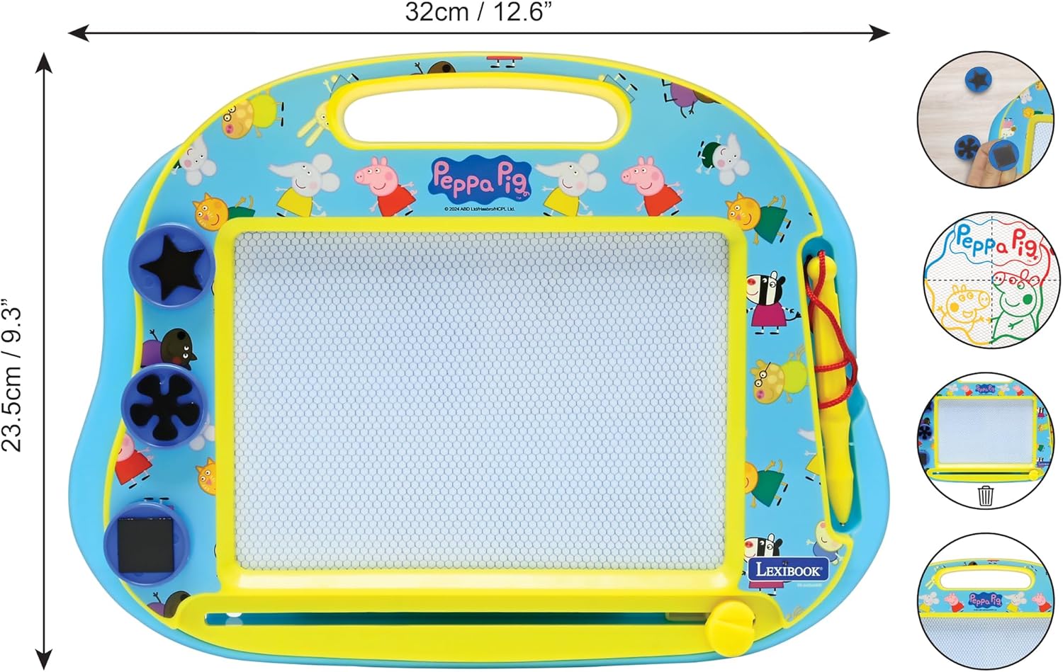 LAVAGNA MAGICA DI PEPPA PIG - Date libero sfogo alla creatività del vostro bambino con questa lavagna magnetica con i colori del mondo di Peppa, George e dei loro amici! FACILE DA USARE - Disegna o scrivi con la penna e i timbri in dotazione, poi cancella facilmente con il pulsante in fondo alla lavagna. È così comodo! ACCESSORI INCLUSI - Questa lavagna magica include uno stilo attaccato da un cordoncino e 3 timbri magnetici (stella, fiore, quadrato) per decorare i disegni. PORTATILE E PRATICO - Grazie alla maniglia, puoi portare con te la lavagna da disegno ovunque, per ore e ore di gioco creativo. QUALITÀ LEXIBOOK - Apprezzato dai bambini, approvato dai genitori. Marchio di giocattoli rinomato e certificato, Lexibook offre prodotti intelligenti, di alta qualità e sicuri, per cui potete acquistare con fiducia.