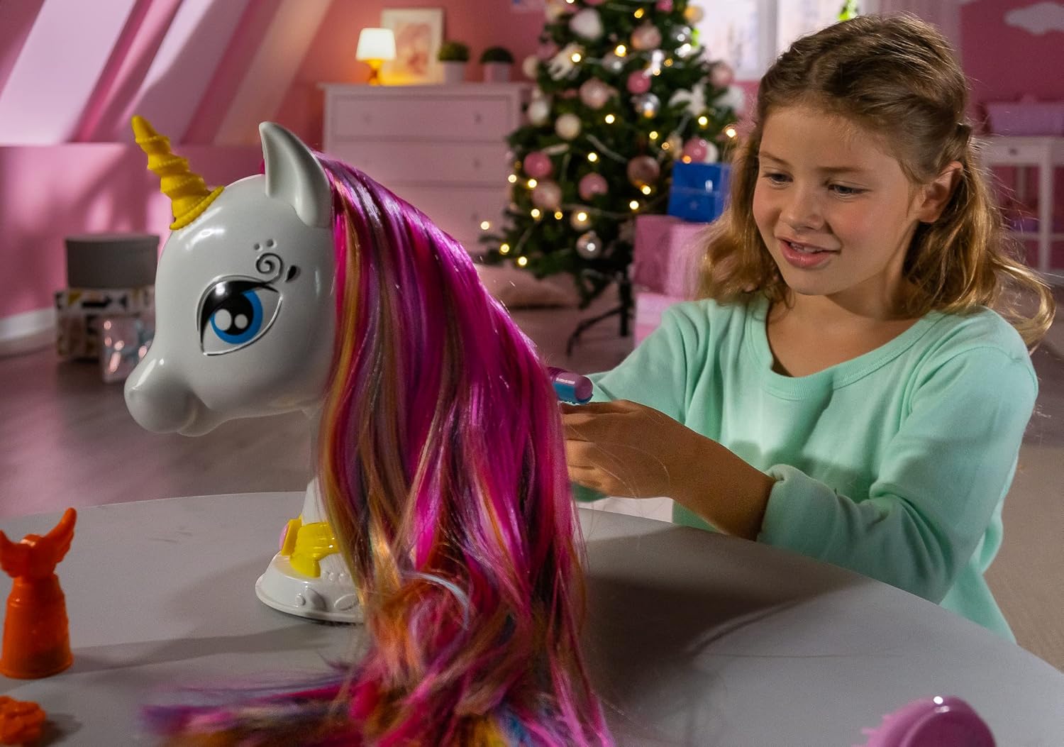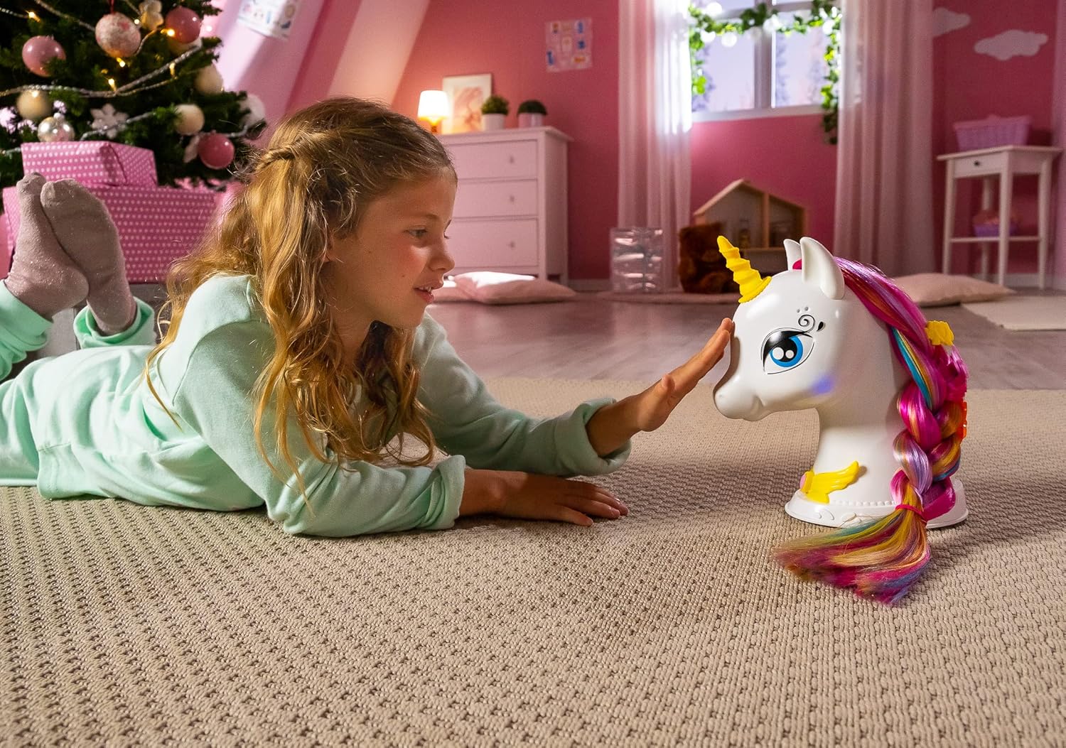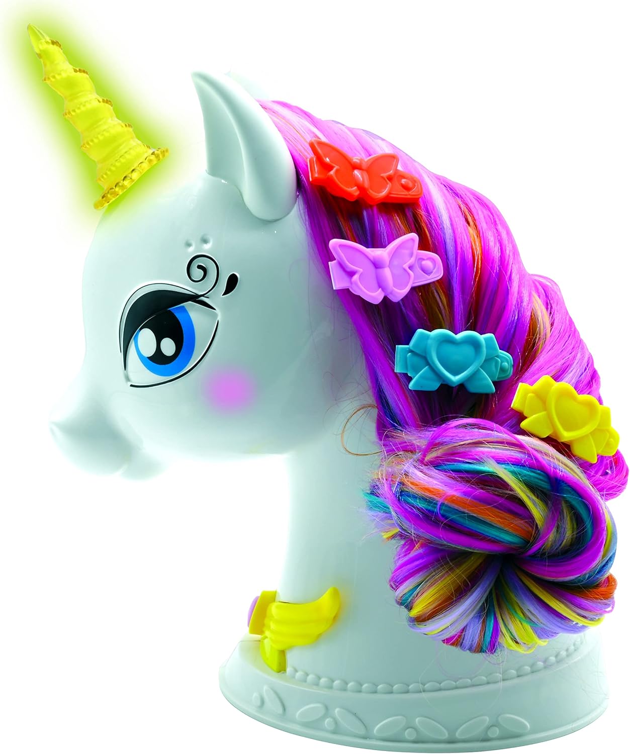 Una magica testa di unicorno da acconciare! Capelli lunghi, setosi e multicolore! Unicorno interattivo: arrossisce quando è felice, e il suo corno si illumina quando accarezzi il muso. Quando spazzoli i suoi capelli, una musica si attiverà come per magia! Tantissimi accessori inclusi: barrette, tiara, polvere glitter, elastici, cerchietto e arricciacapelli per acconciare i capelli dell'unicorno. Sono inclusi fantastici adesivi removibili e riutilizzabili! Alimentazione: 5x batterie LR6/AA (batterie dimostrative incluse)