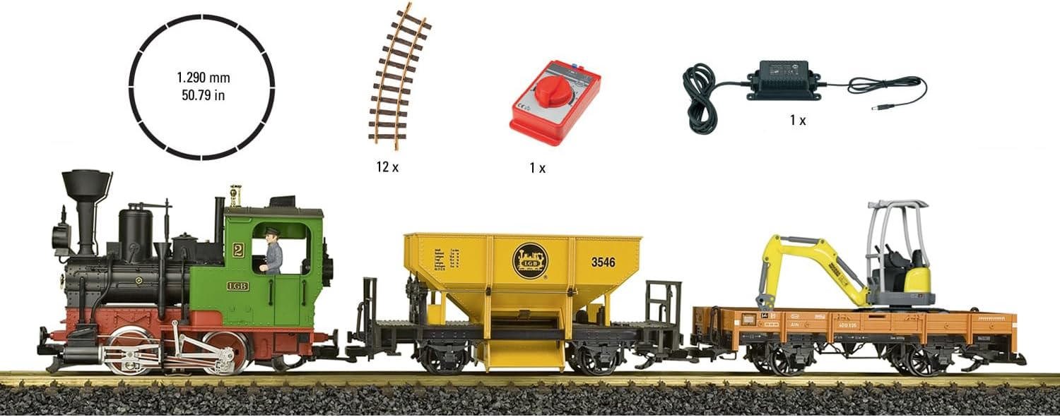 Avanti tutta: con lo Starter Pack per treni merci LGB riceverete tutto ciò di cui avete bisogno per entrare con successo nel mondo delle ferrovie da giardino. L'esperienza ferroviaria XXL per tutte le età. Per uso interno ed esterno: i binari e i treni sono progettati per l'uso in qualsiasi condizione atmosferica. Ideale per tutti gli appassionati di modellismo ferroviario che vogliono praticare il loro hobby all'aria aperta. Equipaggiamento di prima classe - Con un modulo a vapore per il vero fascino della locomotiva a vapore, un generatore di suoni per rumori di guida il più realistici possibili e illuminazione a LED per viaggi notturni mozzafiato. Fornitura XXL - Contiene tutto il necessario per un inizio perfetto: 1x locomotiva a vapore "Stainz", 1x carro per ghiaia, 1x carro a sponde basse con escavatore, 1x regolatore di velocità incluso alimentatore switching, 12x binari curvi (raggio 600 mm, 30°, 377 cm di lunghezza totale), morsetti per binari, istruzioni per l'uso. Qualità LGB dal 1881 - Essendo uno dei leader mondiali nel settore dei binari da giardino, LGB garantisce qualità eccezionale, ampia disponibilità di pezzi di ricambio e costante ampliamento della gamma.