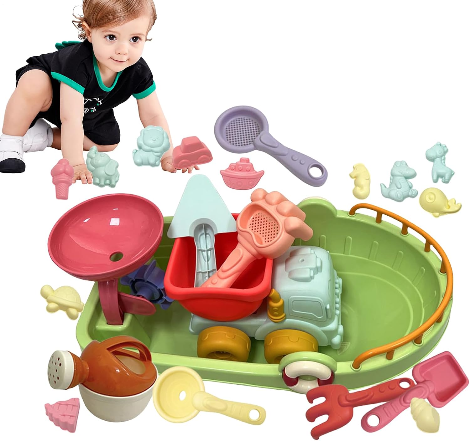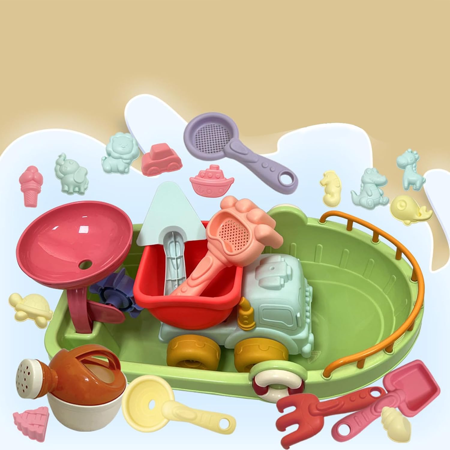 Divertimento istruttivo: I diversi strumenti inclusi nel kit da 21 pezzi promuovono l'apprendimento attraverso il gioco, migliorando la coordinazione mano-occhio durante la creazione di strutture sabbiose. Divertimento Sicuro: Design ergonomico studiato per le capacità motorie dei più piccoli. Forme leggere con superfici lisce che prevengono irritazioni. La gamma cromatica accattivante trasforma ogni castello di sabbia in un'esperienza ludica coinvolgent Stimolo Cognitivo: Potenzia le abilità del bambino con questi giochi da spiaggia educativi. La composizione leggera e la comoda rete permettono un facile stoccaggio. Ideale per sviluppare la coordinazione e rafforzare i muscoli delle man Stimola Immaginazione: Forme dinamiche e palette colorate incoraggiano la costruzione di castelli complessi. L'equilibrio tra dimensioni e peso facilita l'impugnatura anche per i più piccol Utilizzo Versatile: Goditi momenti di gioco senza interruzioni al lago, in giardino o in piscina con i nostri giochi resistenti, ideali per rendere ogni all'aperto dei bambini piena di divertimento e sicurezza. Include accessori per attività creative con sabbia e acqua