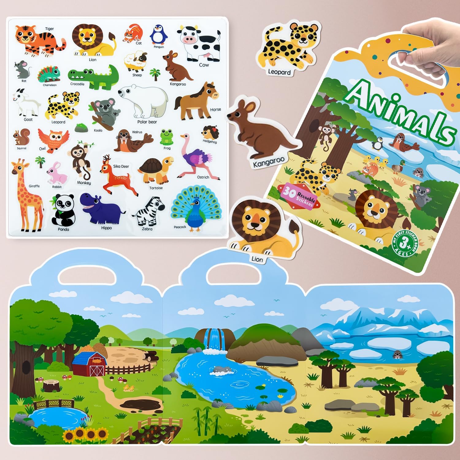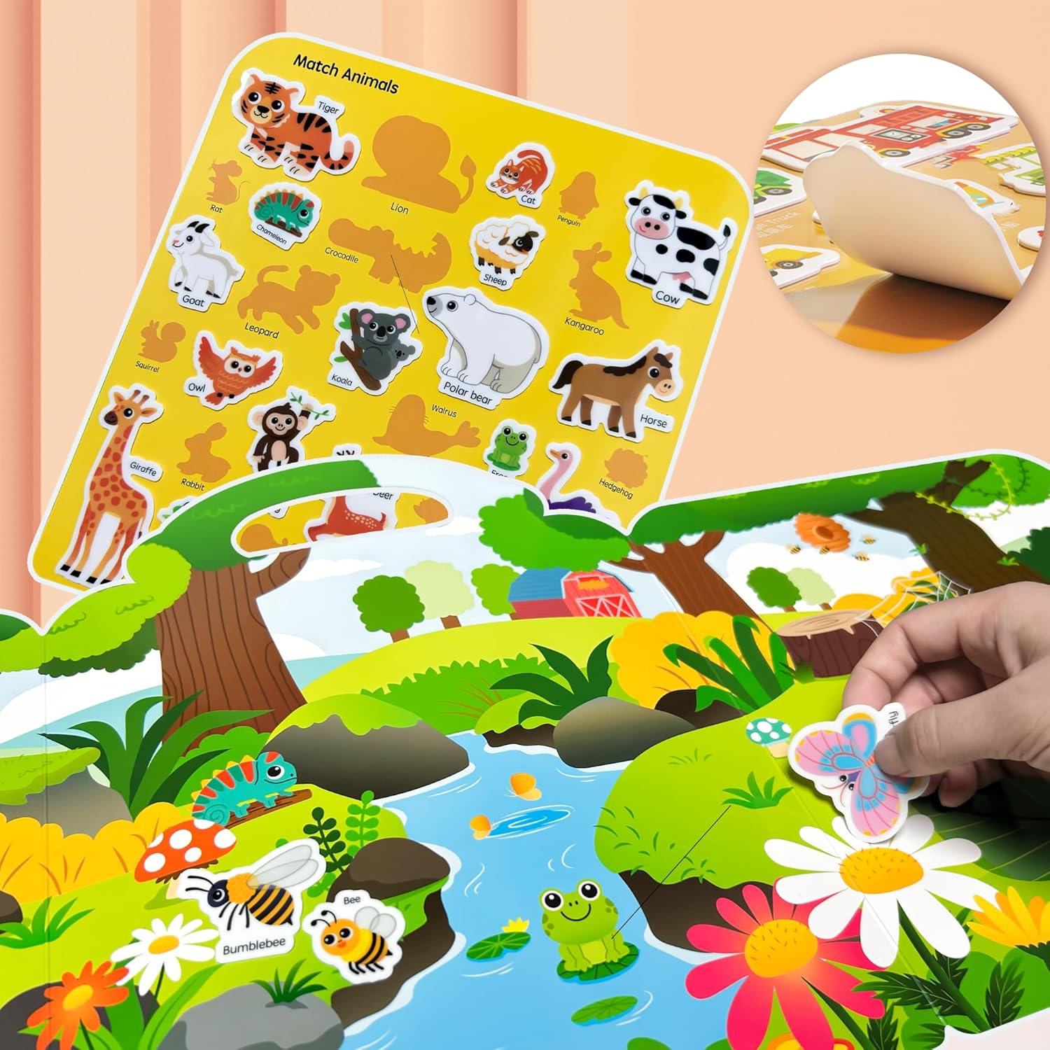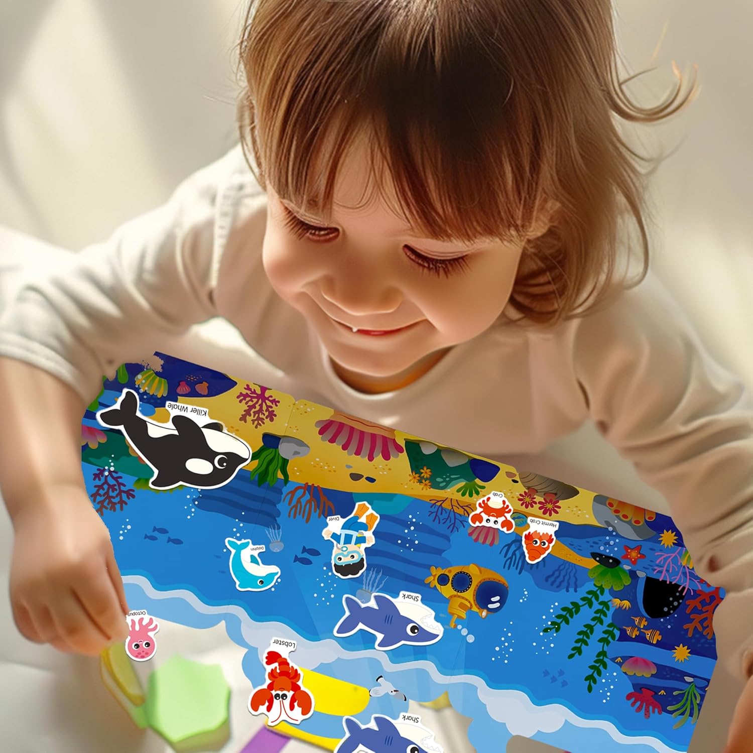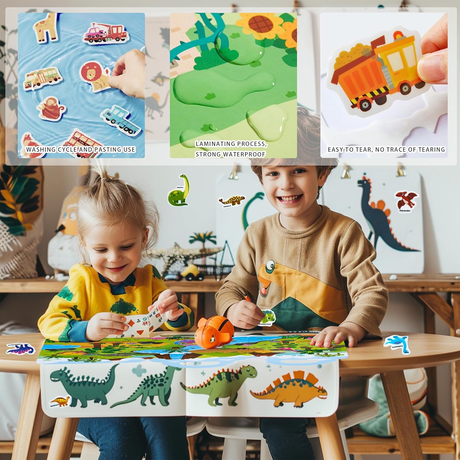 **6 SCENE DIVERSE**: Con 264 adesivi gonfi 3D riutilizzabili in spazio/dinosauri/insetti/traffico/mare/animali - promuove la creatività e il vocabolario. **VANTAGGIO EDUCATIVO**: allena le capacità motorie, la coordinazione occhio-mano e il pensiero logico - ideale per bambini dai 2 ai 6 anni. **IMPERMEABILE E SENZA RESIDUI**: Realizzato in materiale TPE delicato sulla pelle: aderisce al vetro/plastica e può essere riutilizzato più di 100 volte. **ECO-FRIENDLY**: materiali atossici e senza PVC: sicuri per i bambini e per l'ambiente. **PERFETTO IN VIAGGIO**: design leggero della maniglia: il compagno di viaggio ideale per aerei, ristoranti o viaggi in auto!