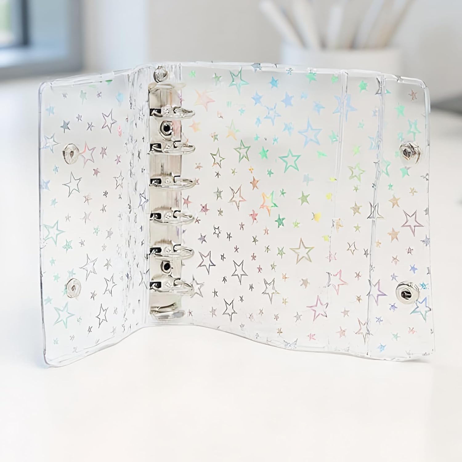 Binder trasparente realizzato con materiale in PVC durevole con un design a motivi a stella che offre al tuo taccuino o organizzatore un look elegante e moderno Clear Binder Cover ti consente di vedere facilmente i contenuti all'interno per la conservazione delle carte adesive Foto Note o importanti documenti scolastici Viene fornito con maniche pratiche che ti aiutano a organizzare oggetti di cartoleria da collezione o materiali di studio in modo ordinato e conveniente Dimensioni compatte e leggere lo rendono facile da trasportare in borse o bagagli che lo rendono ideale per ufficio scolastico o uso di viaggio La robusta copertura in PVC aiuta a proteggere i tuoi oggetti dalla sporcizia della polvere e dalle versamenti mantenendo i quaderni e i documenti sicuri e organizzati