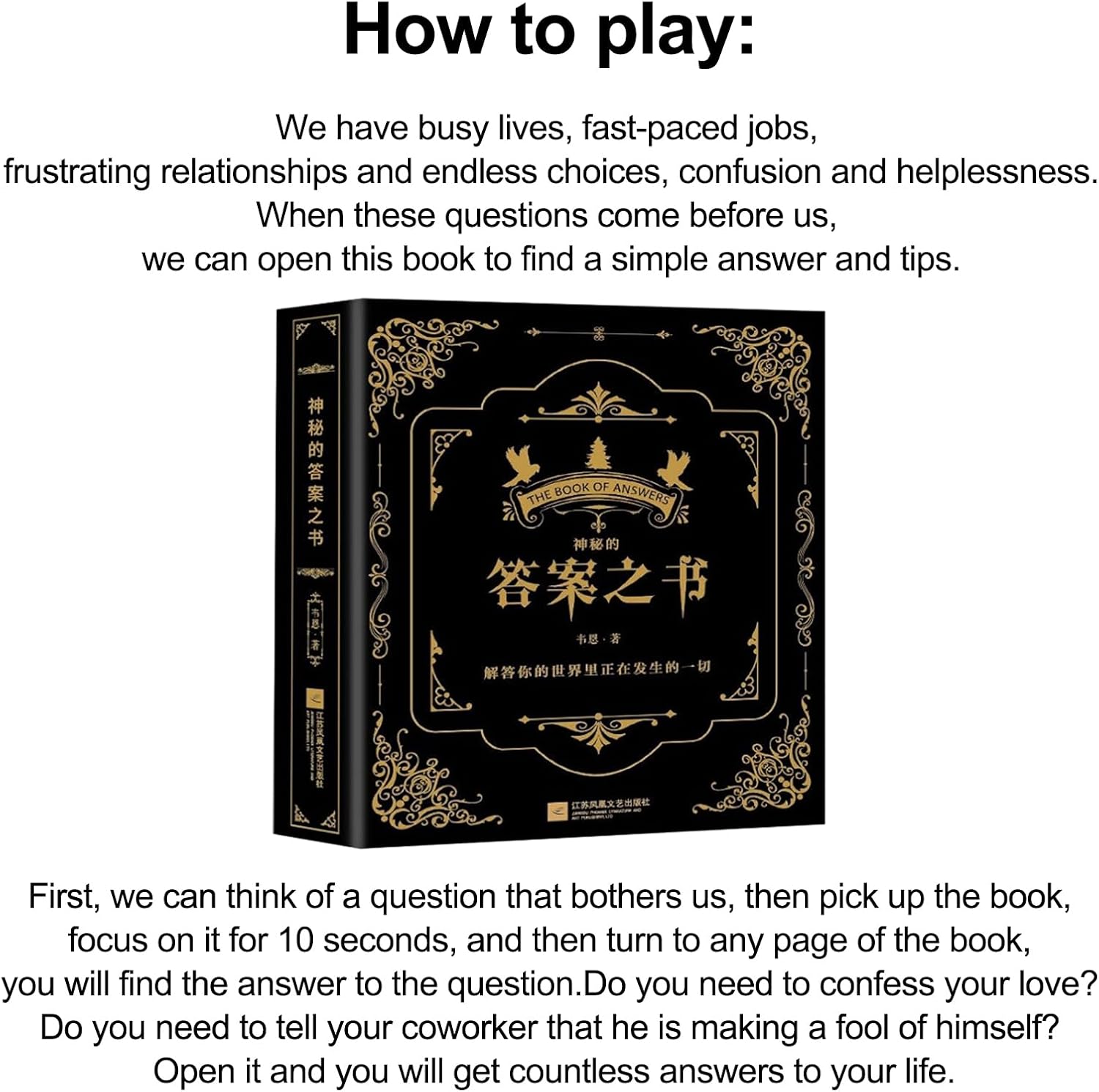 Scoprite l'ignoto: ogni pagina del libro delle risposte contiene una risposta a sorpresa alle vostre curiose domande, rivelando un mondo completamente nuovo di divertimento e conoscenza. Eliminate lo stress con stile: diate creatività con il Libro delle risposte e scopri un modo divertente per trovare risposte alle vostre domande in cinese e inglese. Con questa fonte di intrattenimento, il relax è garantito. ♡ Divertimento: inizia la tua festa con The Book of Answers come compagno ideale. Gioca con i tuoi amici e sperimenta risultati esilaranti e imprevedibili, rendendolo il complemento perfetto per qualsiasi riunione. Ottieni risposte interessanti e prendi decisioni entusiasmanti con questo must per divertirti. Ampia gamma di utilizzo: scopri un nuovo livello di scoperta personale rispondendo a centinaia di domande interessanti nel Libro delle risposte. Questo libro versatile è ampiamente utilizzato da studenti, dipendenti aziendali, casalinghe e pensionati per un apprendimento divertente e informativo. ♡ Regalo pratico: il libro delle risposte è il regalo perfetto per i curiosi. Che si tratti di compleanno, vacanze, Natale o qualsiasi altra occasione, questo libro offre risposte divertenti e sorprendenti a tutte le domande.