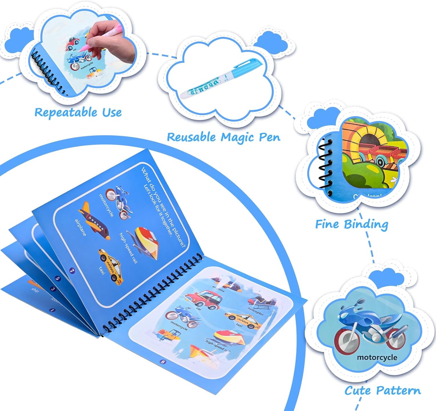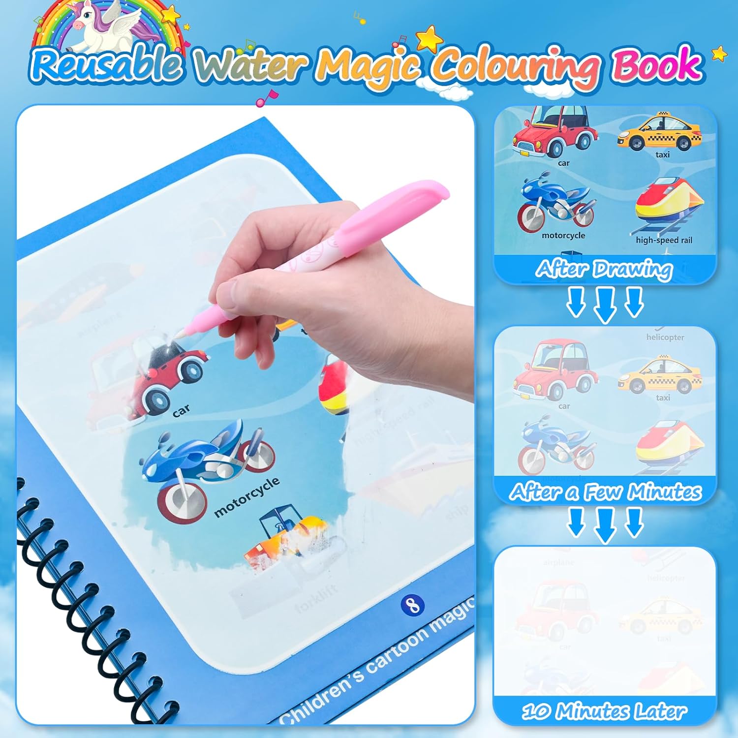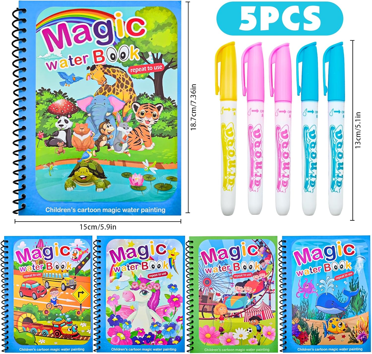 ✨ 【Libri da Colorare di Acqua Magica da 5 Pacchetti】I nostri libri per la magia dell'acqua includono 5 libri di magia dell'acqua a tema a tema in stile diverso + 5 penne d'acqua che possono contenere acqua. 5 temi diversi sono: unicorno, mondo animale, mondo sottomarino, infanzia cartoni animati, trasporto. Ogni libro contiene 4 pagine riutilizzabili. 💕【Punteggio per l'apprendimento Educativo】Questo libro di pittura dell'acqua per bambini è un grande giocattolo di apprendimento educativo che può stimolare la creatività e l'immaginazione dei bambini. Può migliorare la capacità di coordinamento degli occhi per bambini e promuovere la capacità di lavoro di squadra dei bambini. 🐳【Riusibile e Facile da Usare】 il libro di pittura dell'acqua è molto facile da usare, basta riempire la penna con acqua pulita e iniziare a colorare. Dopo 5-10 minuti di asciugatura, le aree colorate scompariranno naturalmente e quindi le pagine possono essere riutilizzate, permettendo ai bambini di disegnare e attingere più e più volte al libro di scarabocchi. Non solo risparmia tempo, ma è ottimo per la pratica ripetuta. 🧒【Non-tossico e Mani-free】con un rivestimento sicuro, ecologico e riutilizzabile, il nostro libro da colorare magico è non tossico e salutare per i bambini. I colori sono completamente stabili sulla carta e non si insinuano o si trasferiscono in abbigliamento o mobili. 🎁【Regalo Perfetto per i Bambini】 questo fantastico set di libri per la pittura dell'acqua è il miglior regalo per i bambini, specialmente per i bambini di età superiore ai 3 anni. Perfetto per feste di compleanno, regali di compleanno, bomboniere, Natale, Halloween e qualsiasi altra occasione. I bambini possono anche condividerlo con i loro amici. Sarà un ponte di amicizia tra bambini.