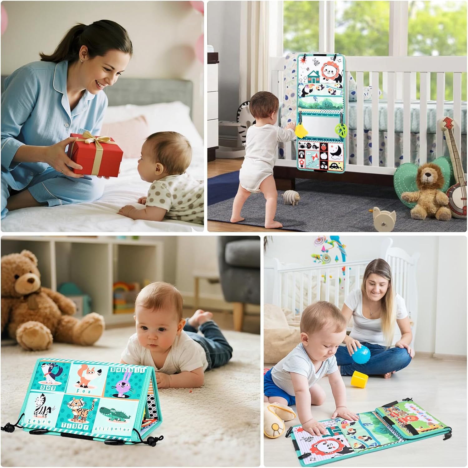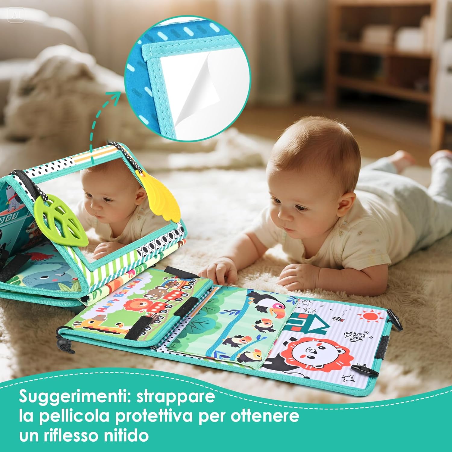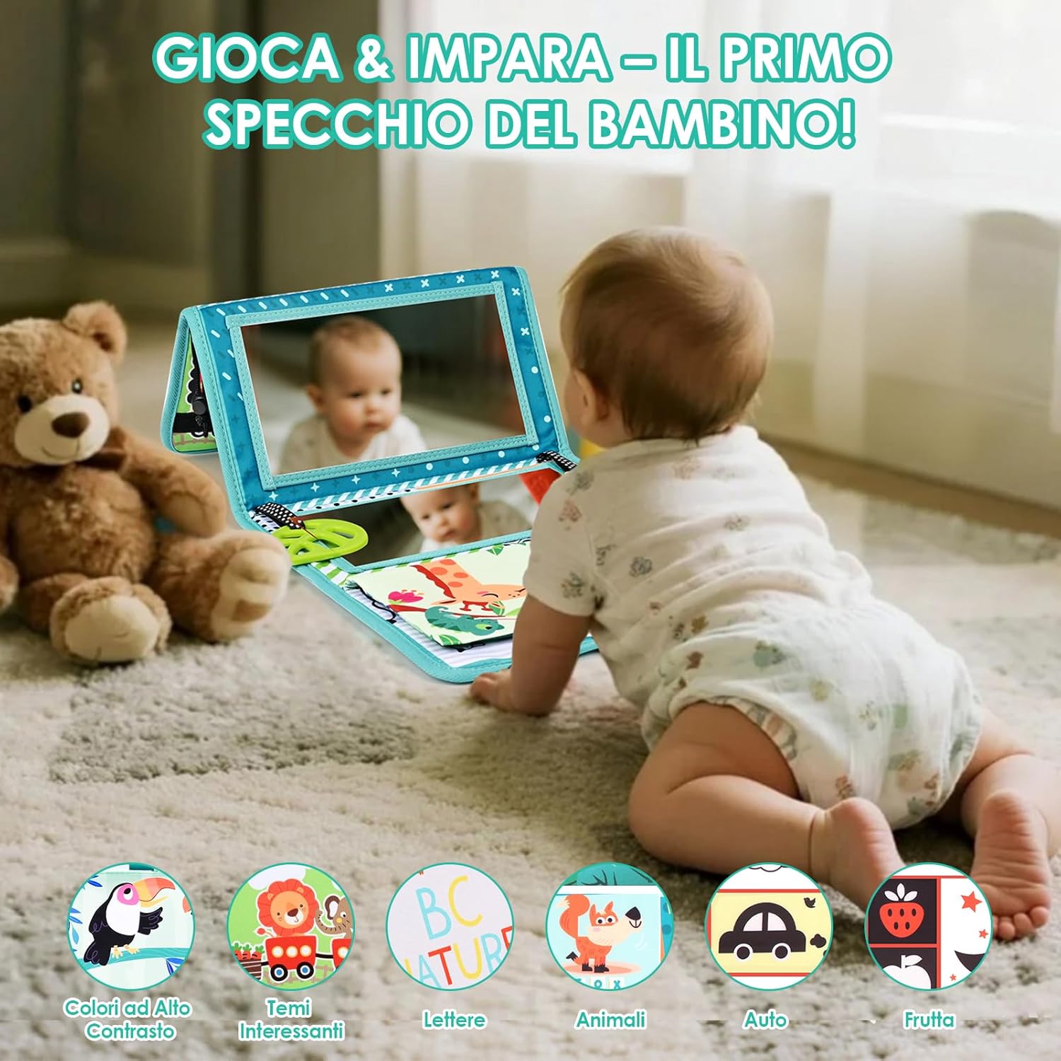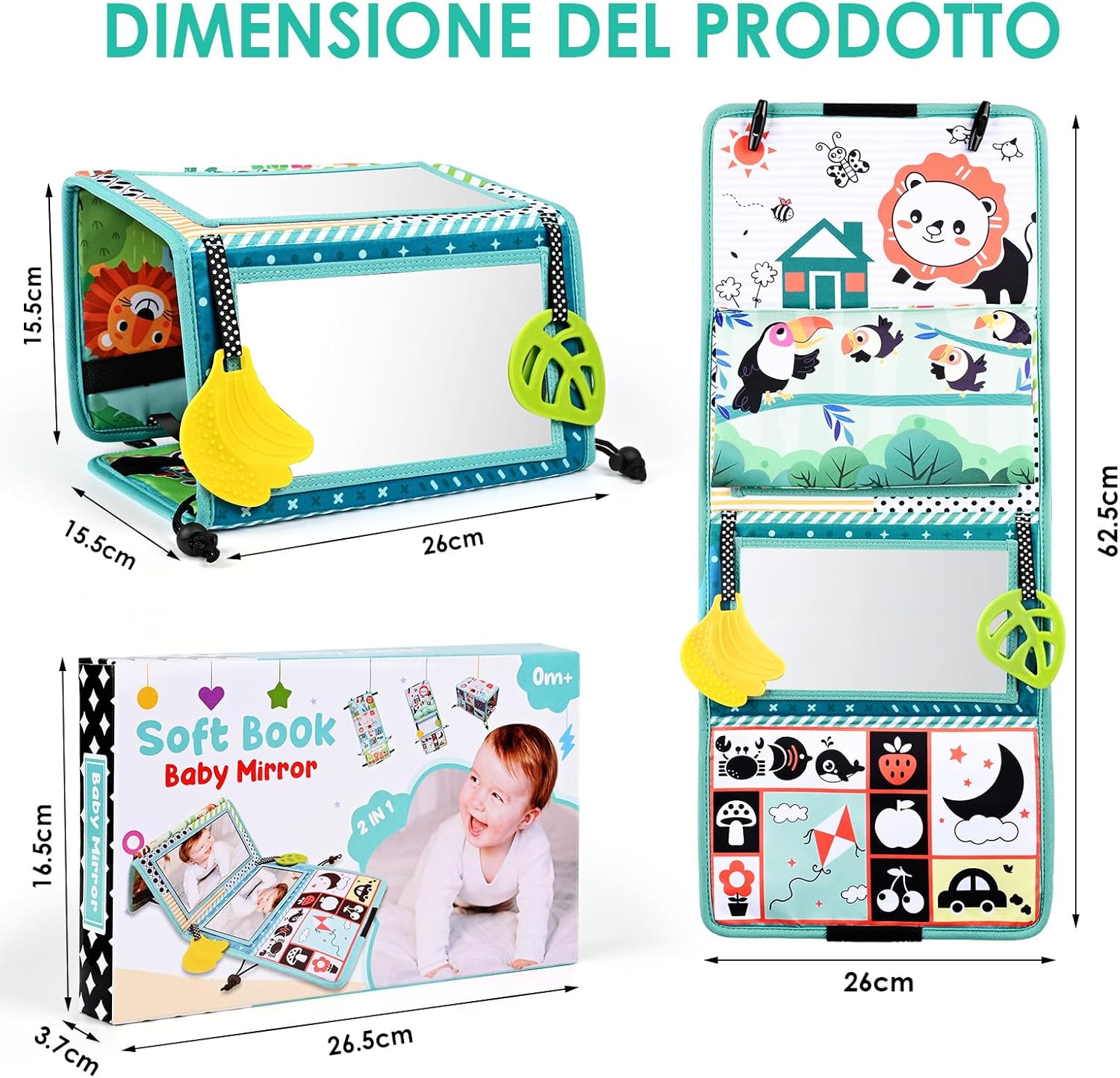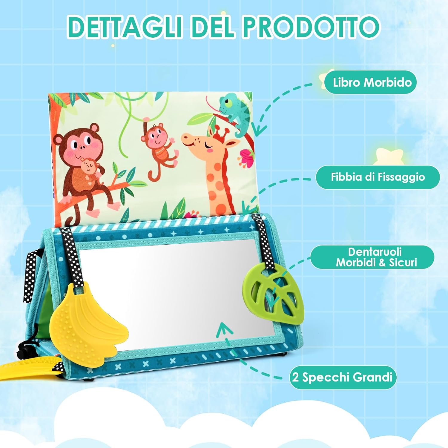 GIOCATTOLO DIVERTENTE: Il giocattolo a specchio per bambini presenta un design concavo e convesso leggermente curvo e l'interessante effetto di deformazione permette loro di allenare naturalmente la coordinazione degli arti. Perfetto per far divertire i bambini sdraiati sulla schiena, con il libro per bambini e lo specchio da terra SICURO PER I NEONATI: Il giocattolo per il tempo a pancia in giù è realizzato in morbido poliestere lavabile e resistente allo sbiadimento. L'anello per la dentizione è realizzato in materiale atossico e innocuo, garantendo l'igiene del bambino durante l'uso. Lo specchio per bambini ha una pellicola trasparente; si prega di rimuoverla prima dell'uso REGALO PERFETTO: Questo giocattolo per il tempo a pancia in giù è progettato per bambini da 0 a 12 mesi. Questo giocattolo a specchio per bambini è un ottimo regalo per baby shower e compleanni. Adatto all'interazione genitore-figlio e un'esperienza fantastica e divertente per il tuo bambino INTERATTIVITÀ E STIMOLAZIONE SENSORIALE: Questo giocattolo per il tempo a pancia in giù presenta immagini in bianco e nero e a colori ad alto contrasto, oltre a motivi a cartoni animati colorati, per stimolare lo sviluppo visivo del tuo bambino. Attraverso l'interazione e la stimolazione sensoriale, può promuovere lo sviluppo cognitivo del tuo bambino FACILE DA TRASPORTARE: Il design pieghevole del giocattolo per il pancino lo rende ideale per i viaggi o per l'uso quotidiano. Le fibbie regolabili consentono di agganciare il giocattolo specchio per bambini ai seggiolini auto (montati posteriormente), alle culle, ai passeggini o ai fasciatoi: perfetto per casa e in viaggio