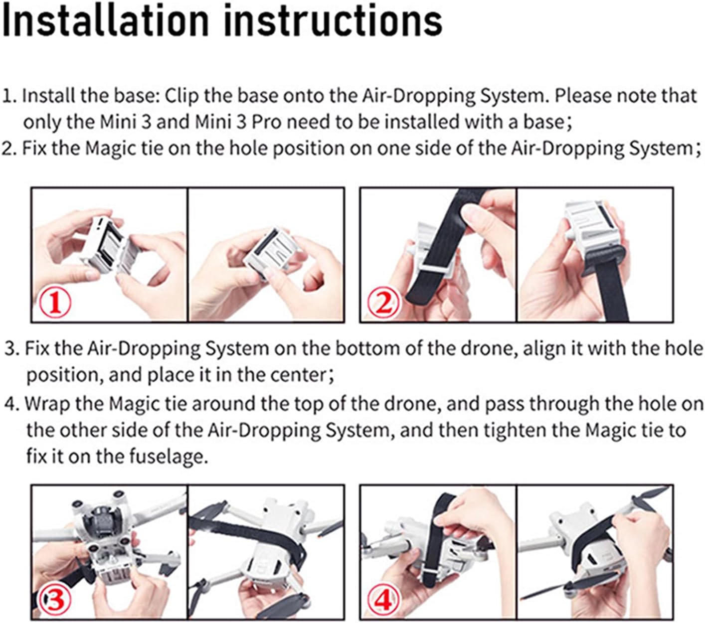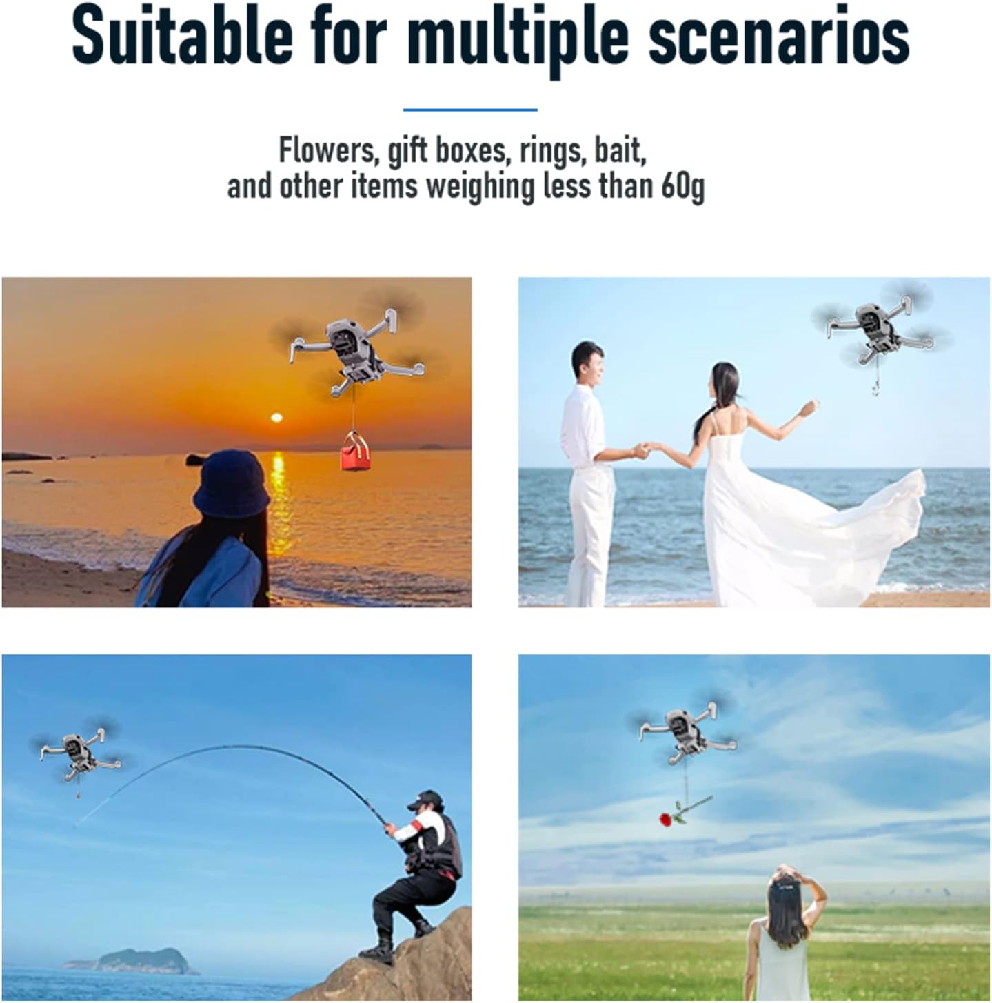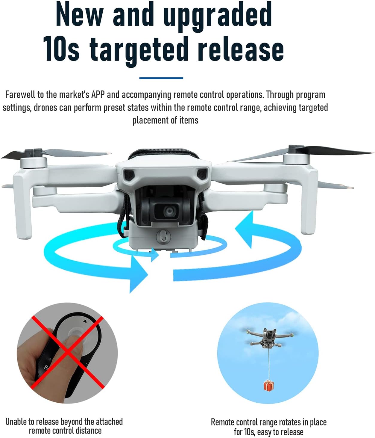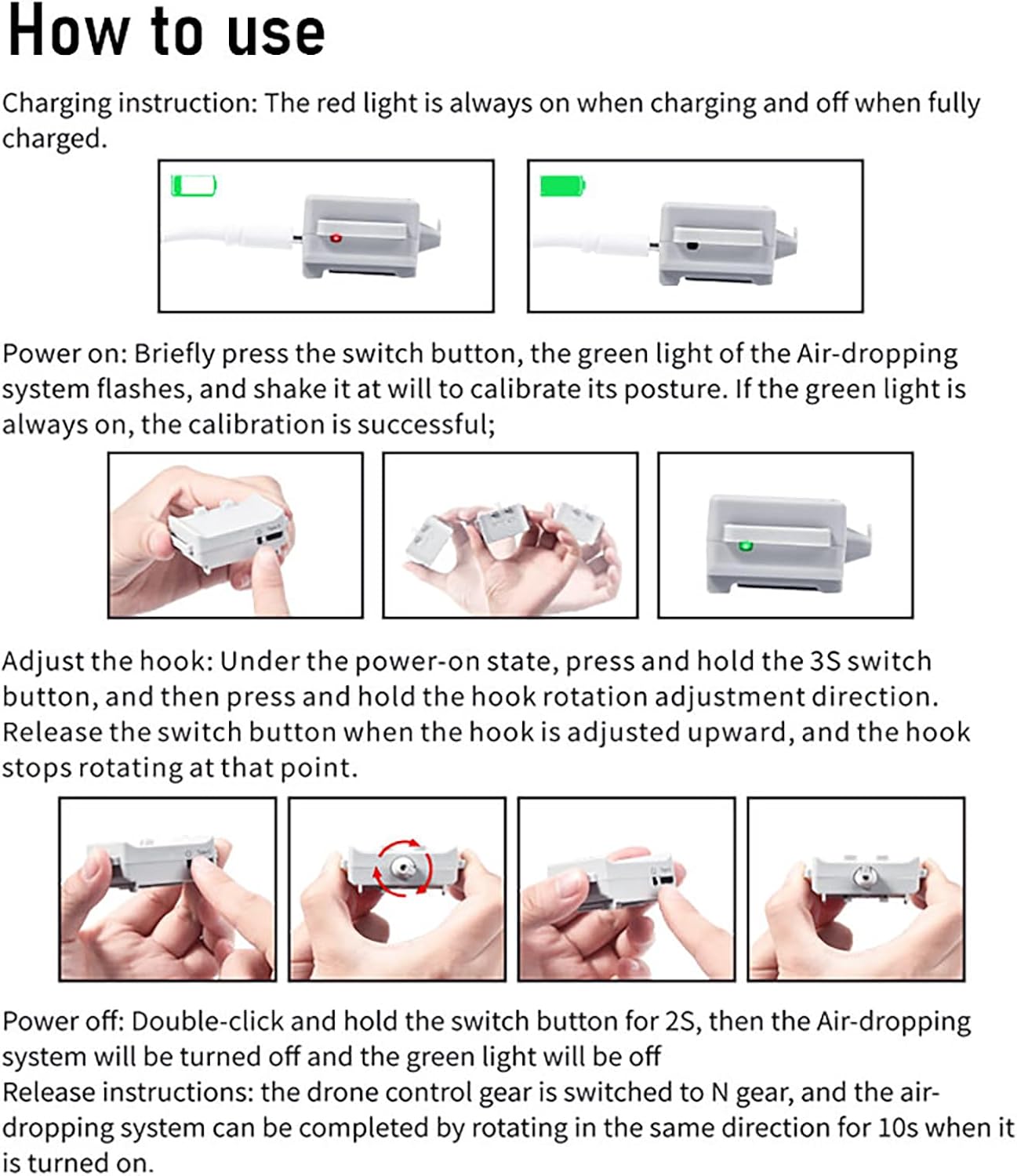 Ampia compatibilità: il design con cinturino in velcro lo rende comodo e veloce da installare e smontare, e universale compatibile per vari droni, il design compatto e leggero è appositamente adatto per mini droni, è adatto per DJI Mini serie, come Mini 4K, Mini 4 Pro, Mini 4, Mini 3 Pro, Mini 3, Mini 2, Mini 2 SE, Mini SE e così via Sgancio rapido, funzionamento semplice: senza l'uso di controller ridondanti, messo in uso controllando il volo del drone in rotazione situ, posizionamento a punto fisso 10S, basta ruotare il drone in posizione nella stessa direzione per 10 secondi per completare l'airdrop Ampia applicazione: ricarica rapida USB di 1 ora, grande capacità e lunga durata della batteria, completamente carica può aprirsi circa 400 volte. Rilascio remoto senza distanza limitata, può essere applicato a proposte di matrimonio, consegna di documenti, lancio di esche e altri scenari funzionali Design accurato dei dettagli: aggiungere il design dei piedini sul fondo può aumentare la fusoliera, impedire ai detriti di terra di contaminare la fusoliera o danneggiare il giunto cardanico e la fusoliera durante il decollo e l'atterraggio. Nuovo design pneumatico, eccellenti prestazioni di riduzione del rumore Leggero e sicuro: realizzato in materiale ABS, solo circa 30 g di peso, non aumenta il carico del drone, non blocca il sensore di posizionamento visivo del drone e non influisce sul volo UAV. Sensore integrato ad alta sensibilità, chip di controllo anti interferenza che non provoca scuotimento, caduta, può essere utilizzato con fiducia